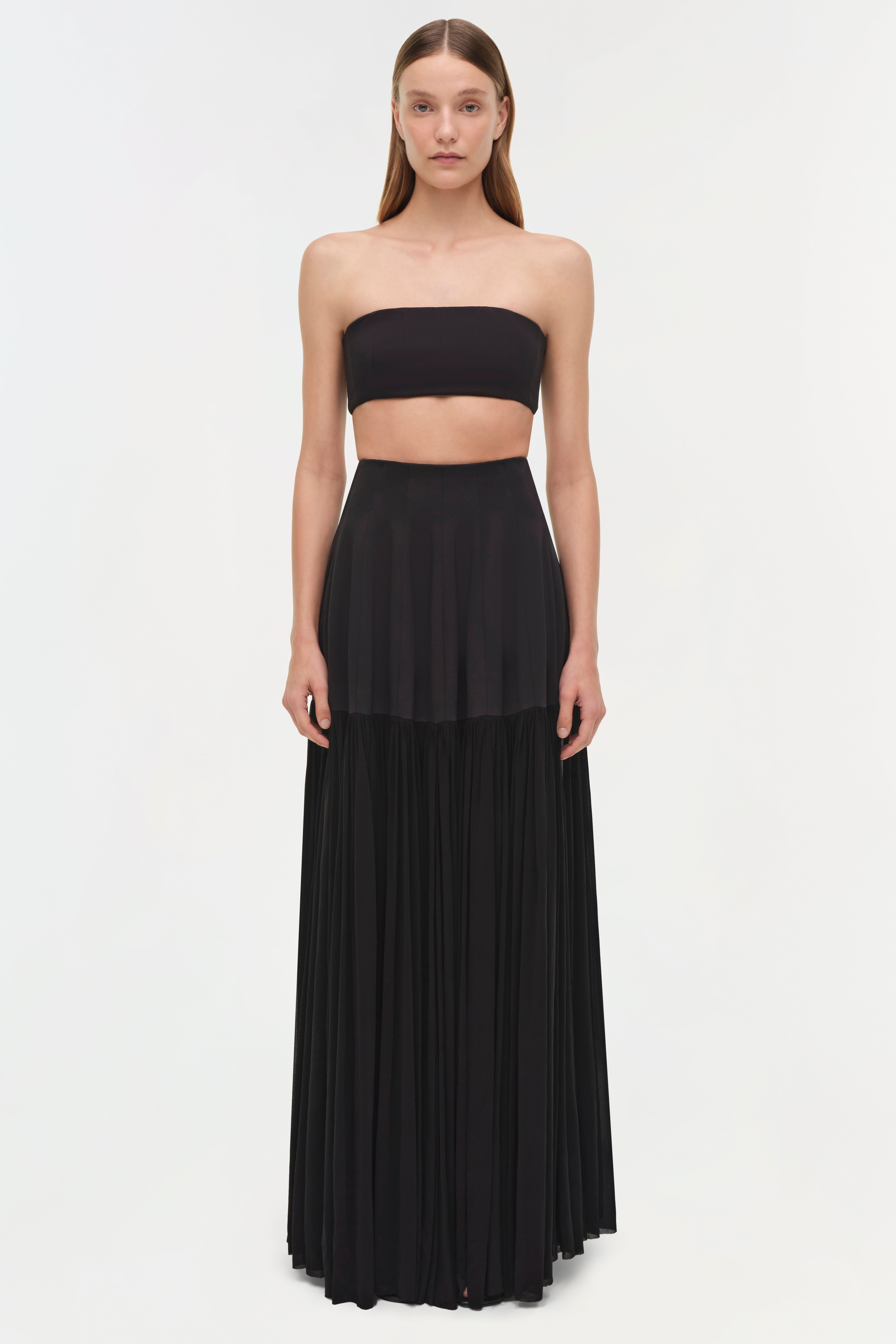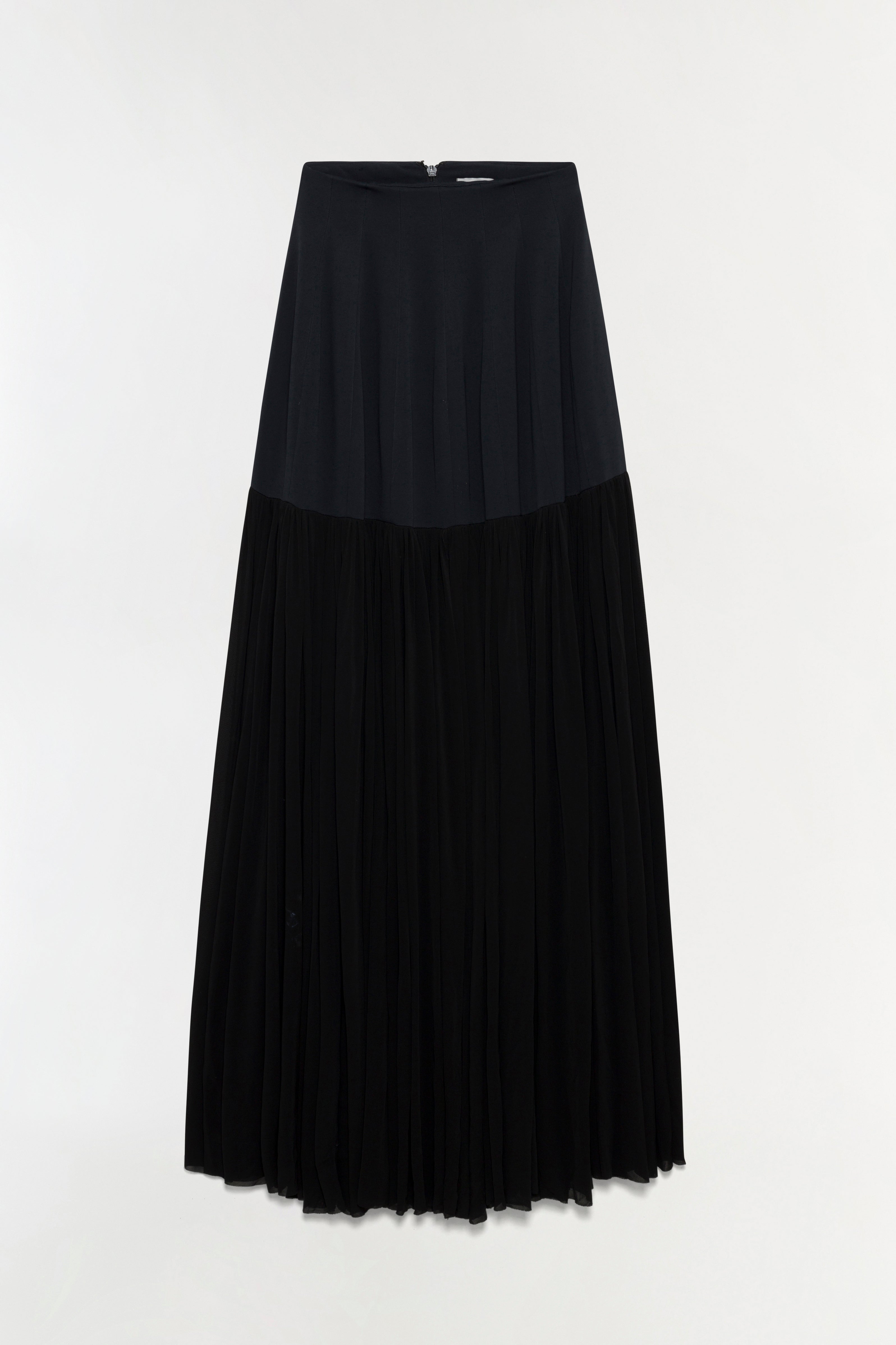 Cut from fluid jersey, this full-length skirt gathers softly at the waist before falling into a long, voluminous drape. The fabric’s natural movement lends quiet elegance. Balanced in proportion and flow.