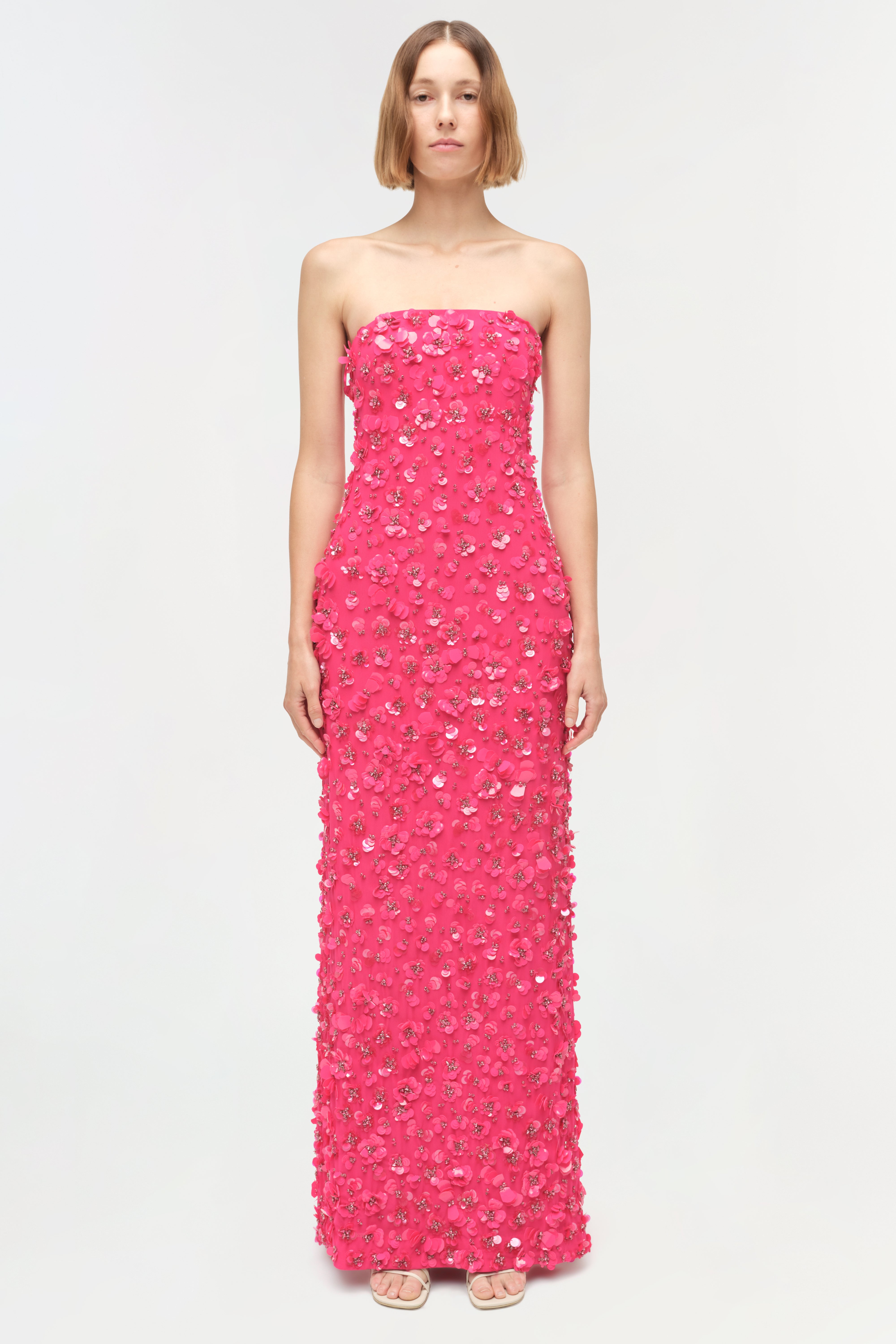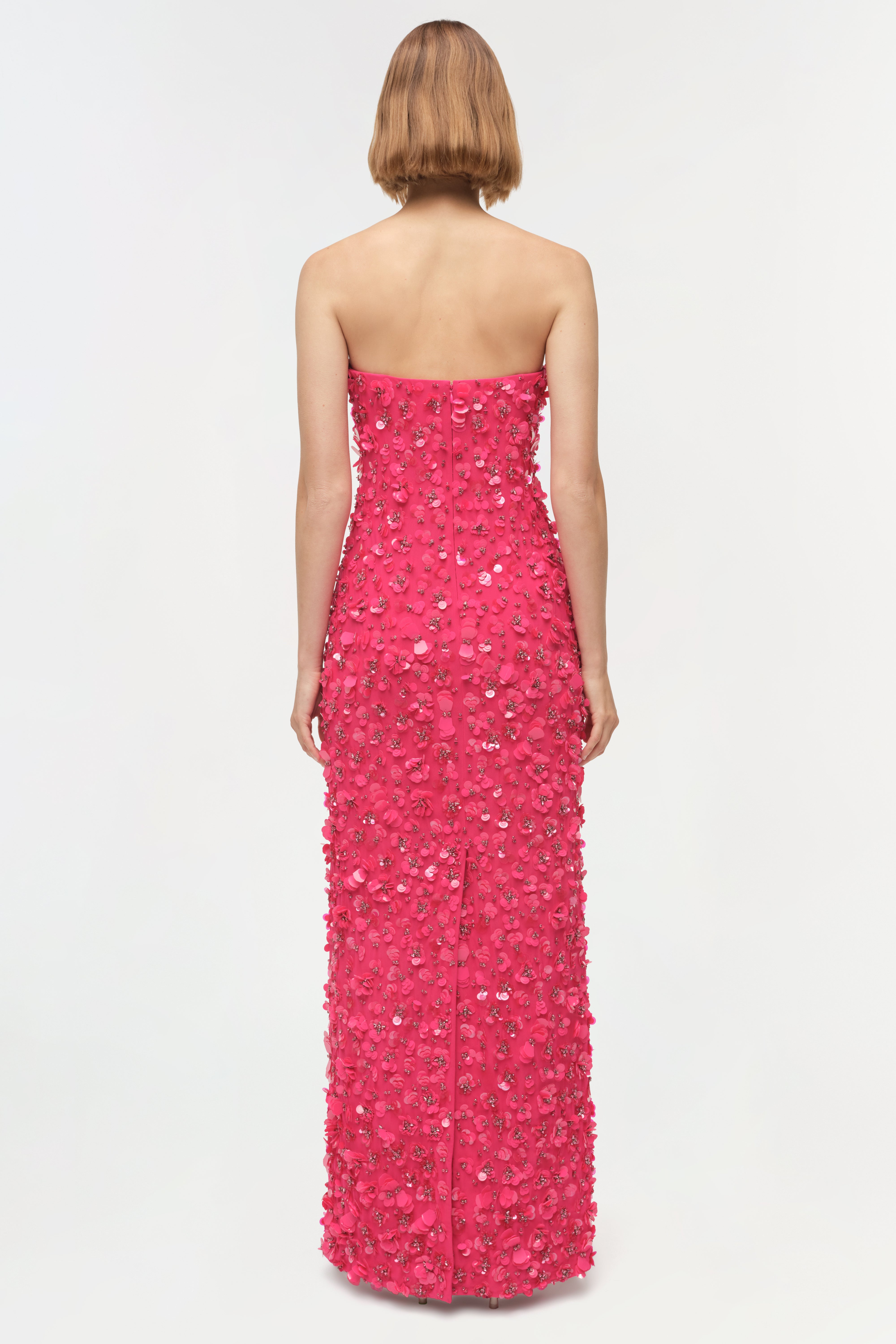 Hand-applied sequins and floral appliqué trace the surface of this strapless column gown. The bodice contours the figure, falling into a straight, floor-length line. Sculpted and radiant, it captures light with every movement.