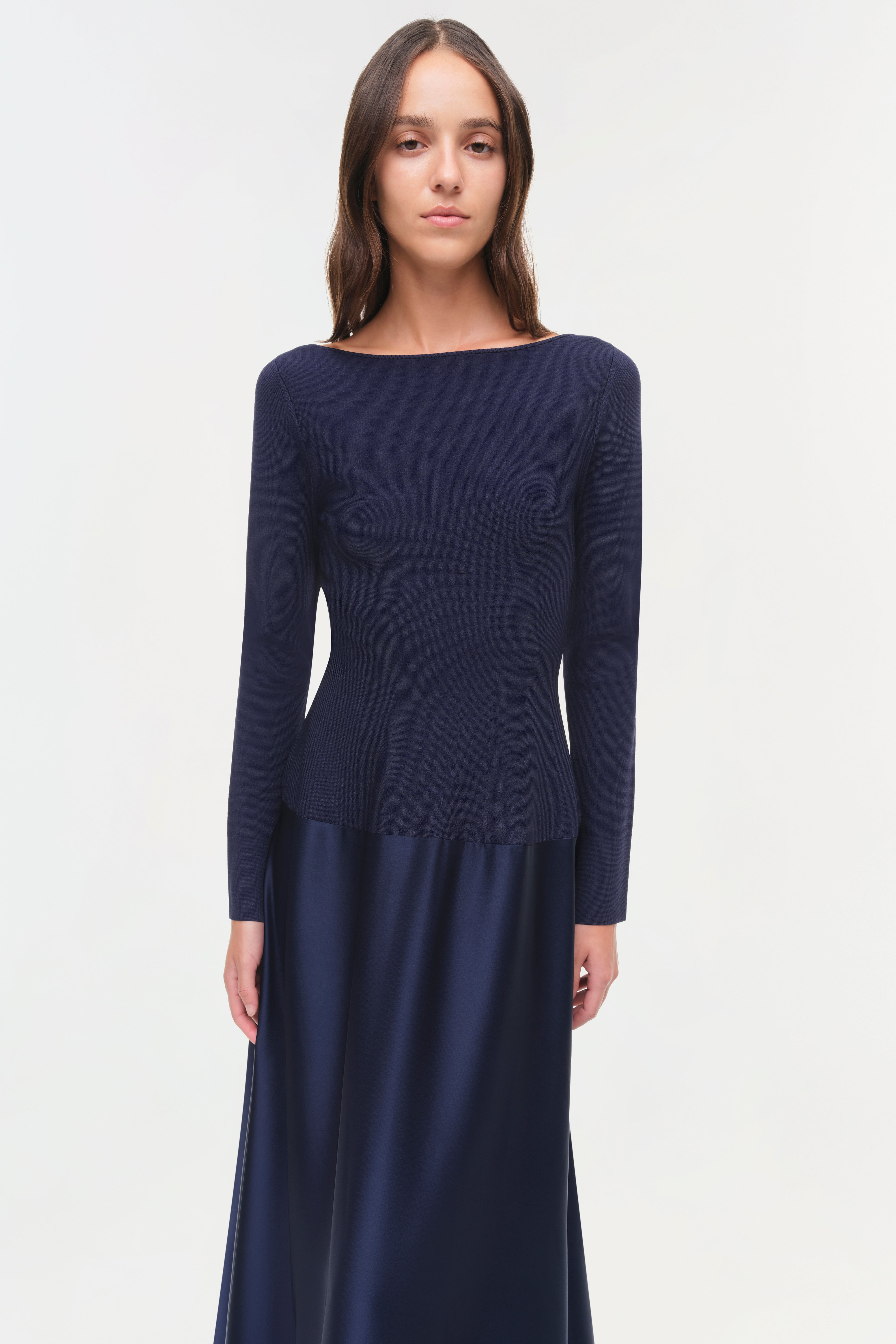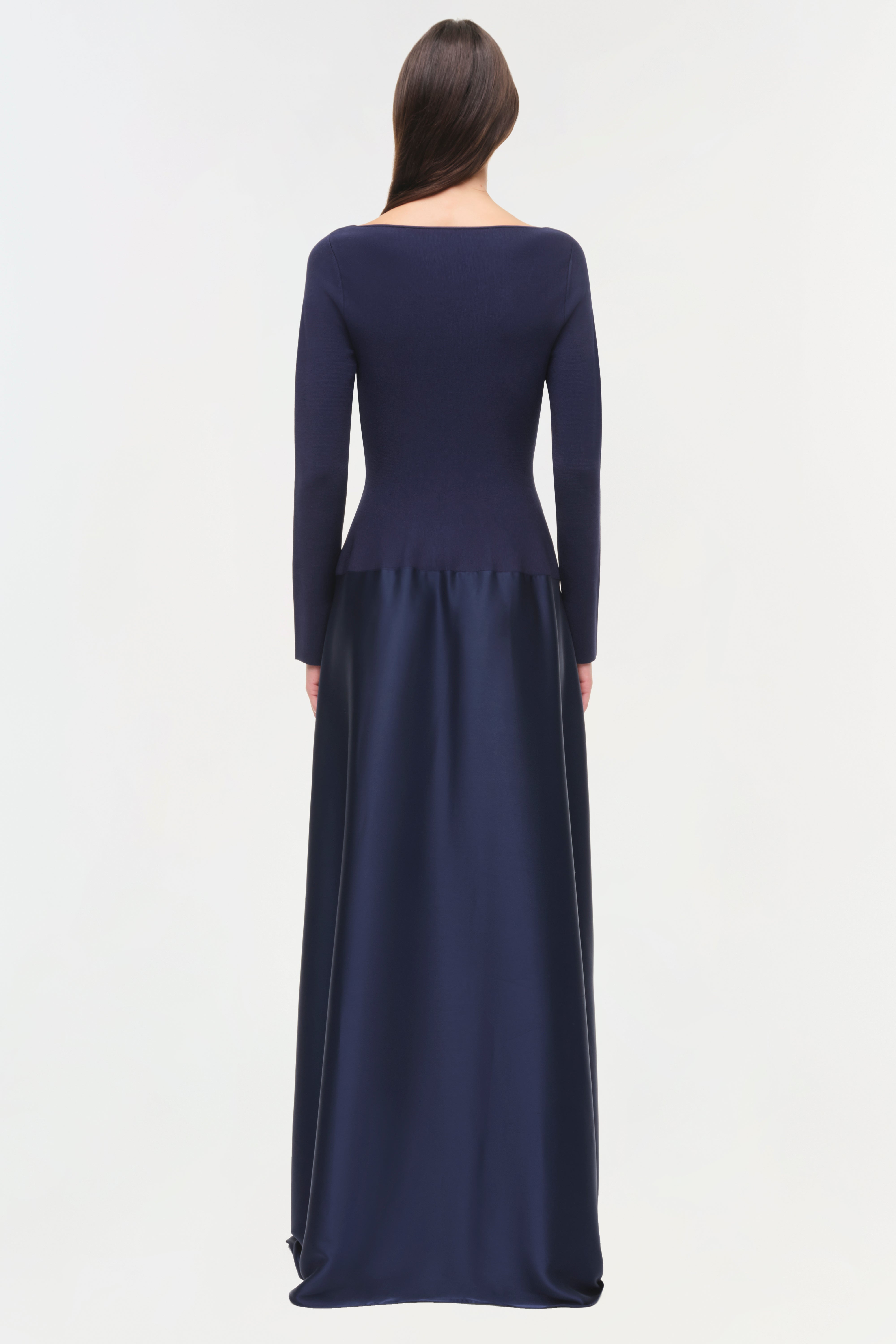 A fitted knit bodice flows into a satin skirt that glides with soft volume. The waistline draws a seamless line from sculpted structure to fluid drape. Tailored yet effortless, it captures modern evening refinement.