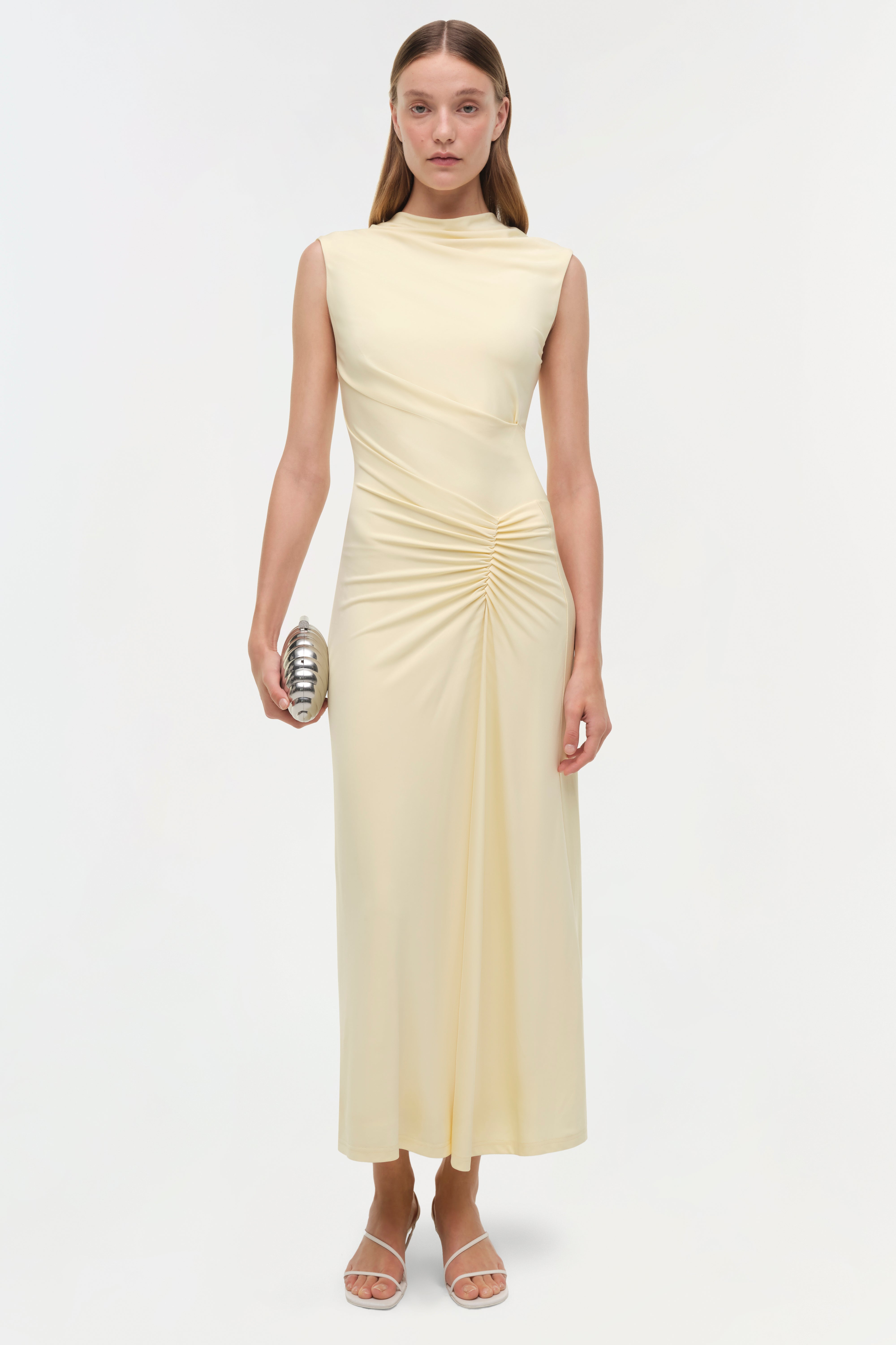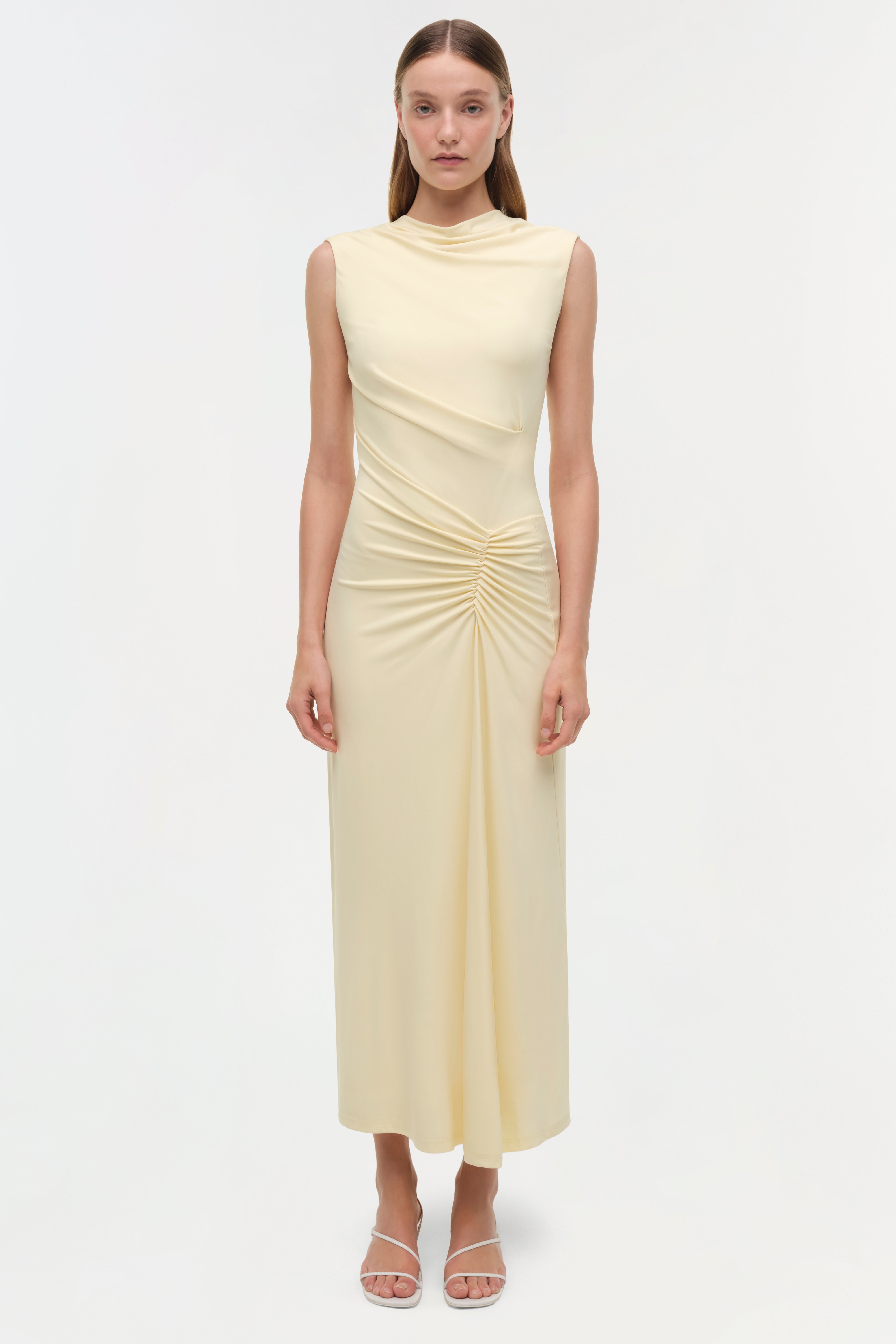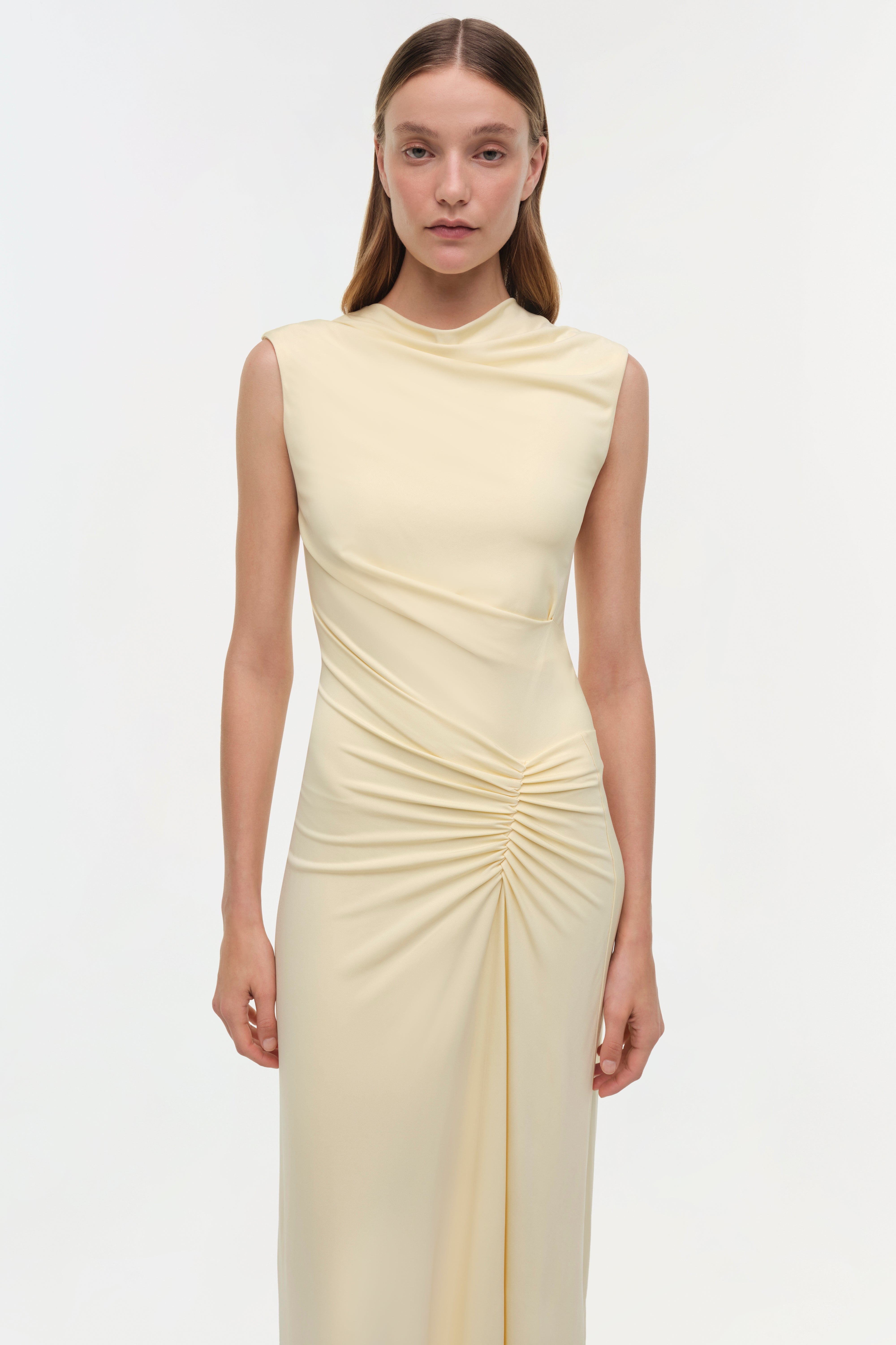The Acacia Jersey Midi Dress in Buttercream. This sleeveless midi in draped jersey features artful gathering and a fluid silhouette that exudes understated elegance.