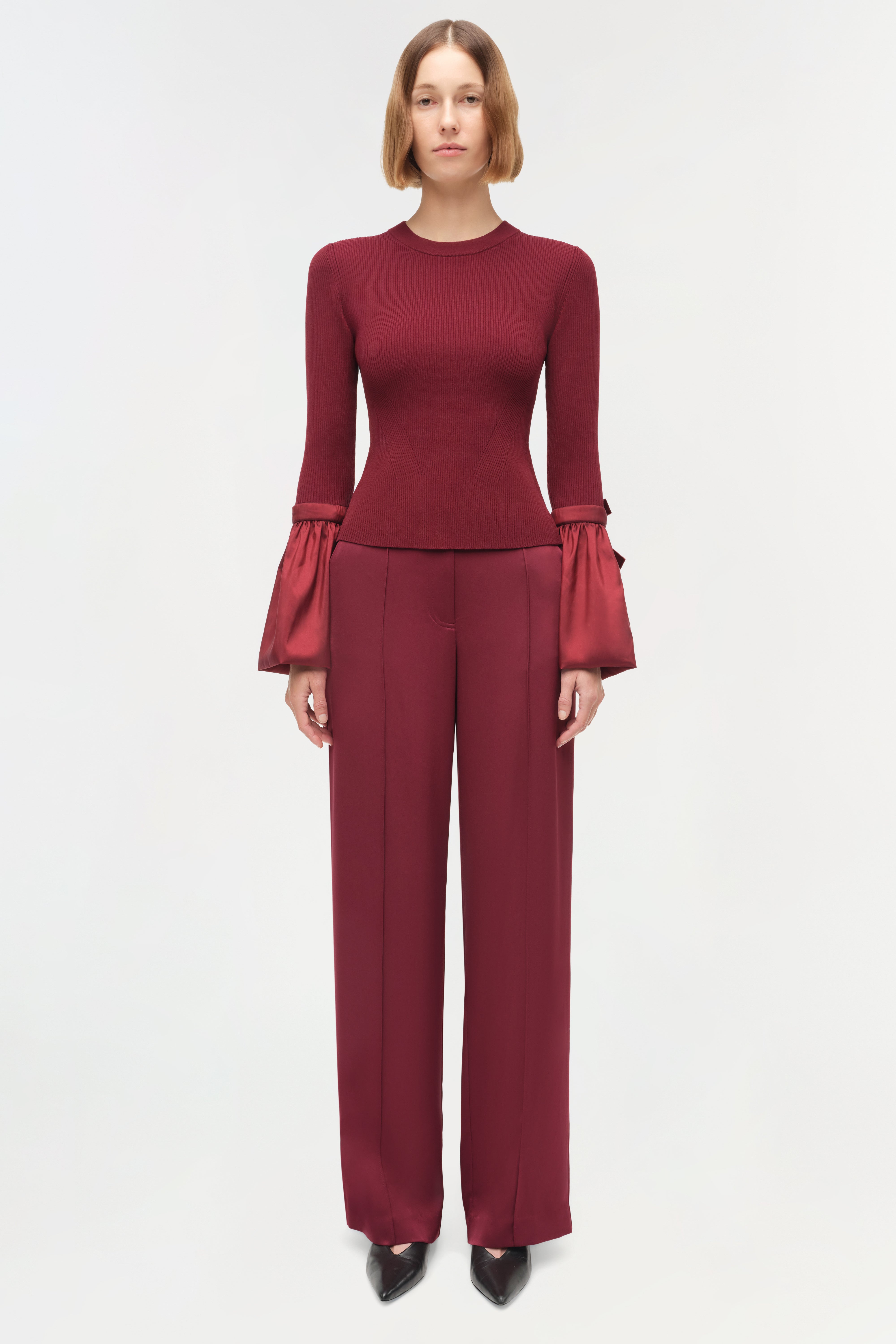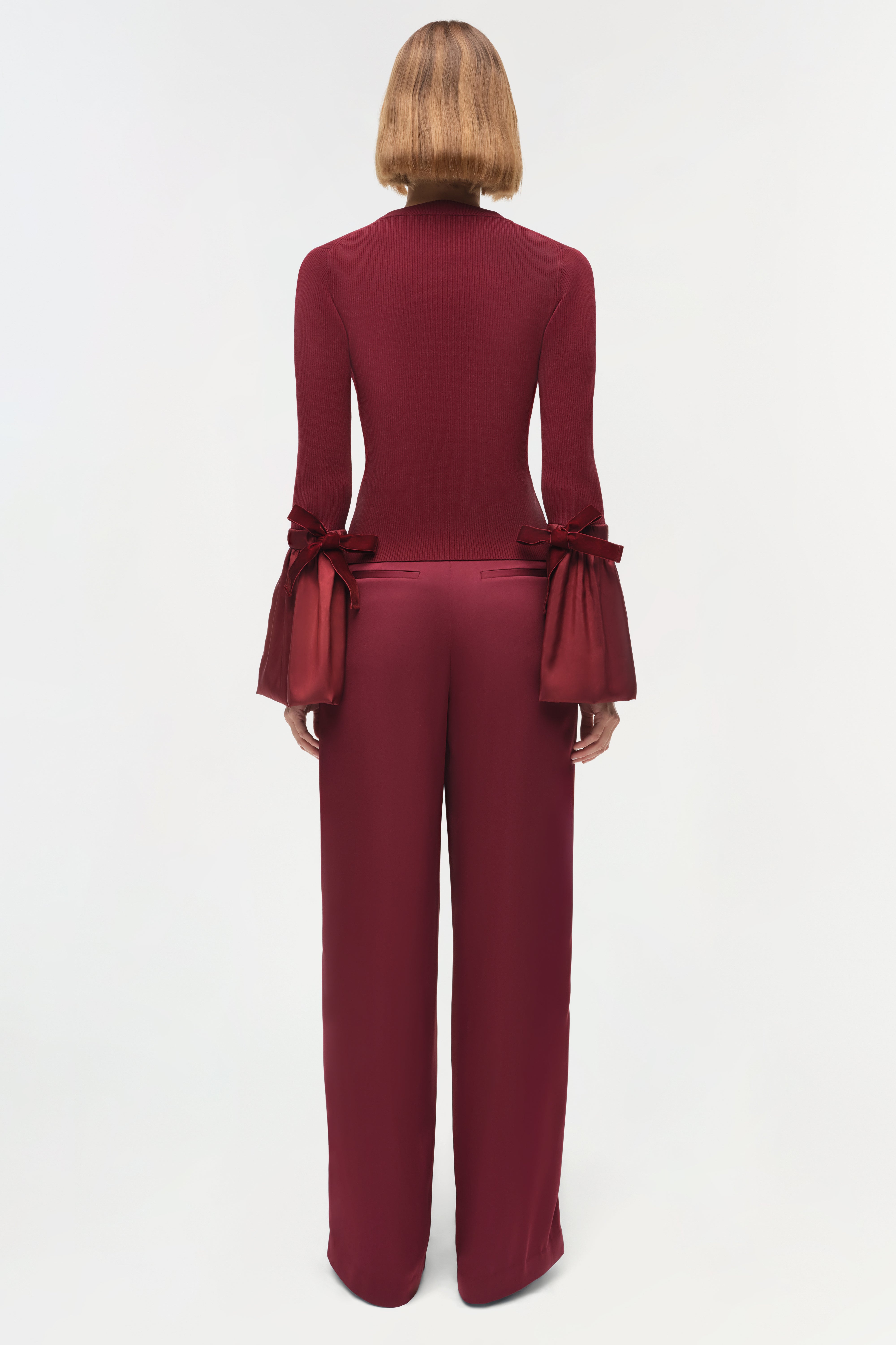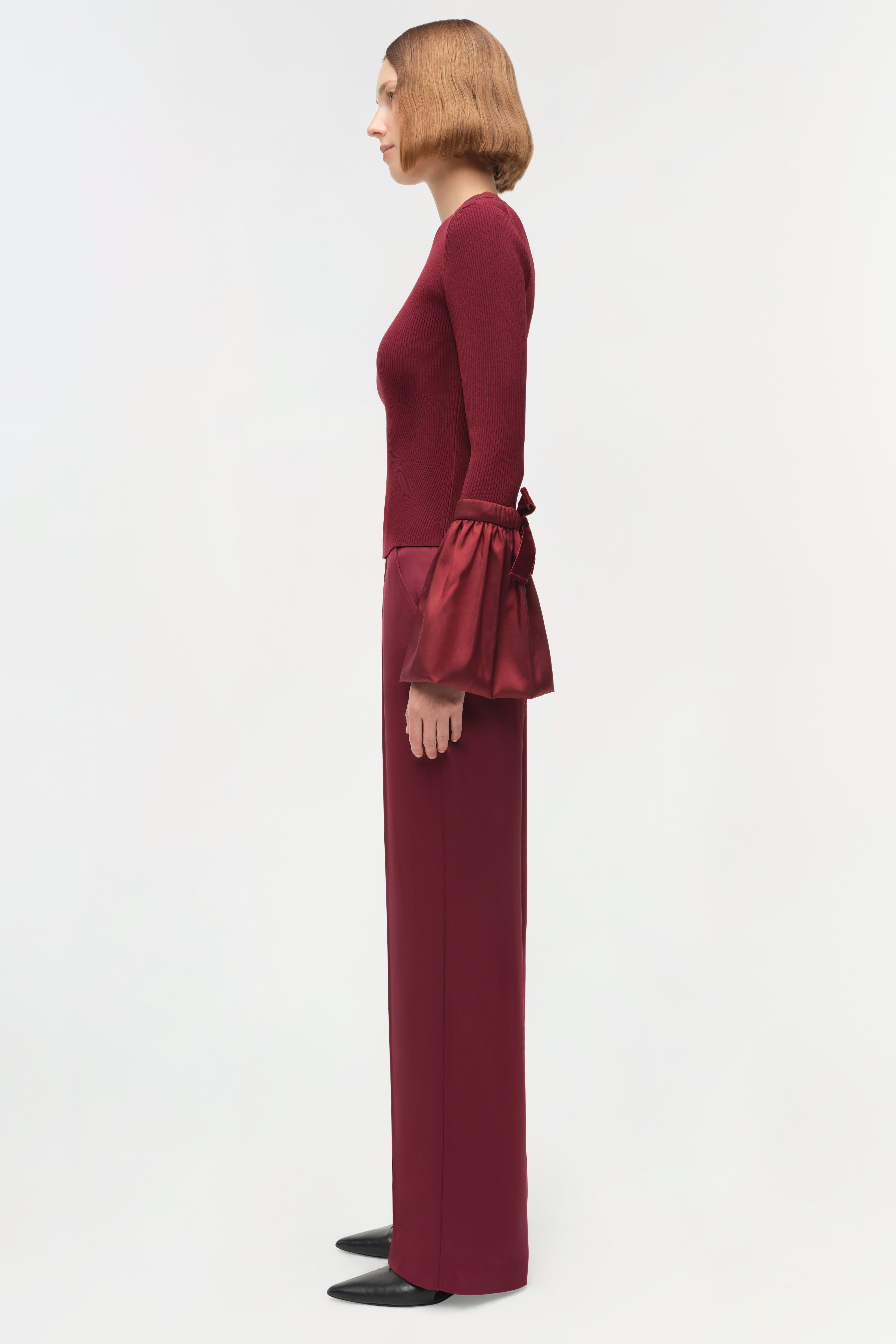 This top fuses the precision of a fitted knit with the drama of taffeta sleeves. The cuffs billow in gathered volume, anchored by bow details. A modern design elevated through contrast and proportion.