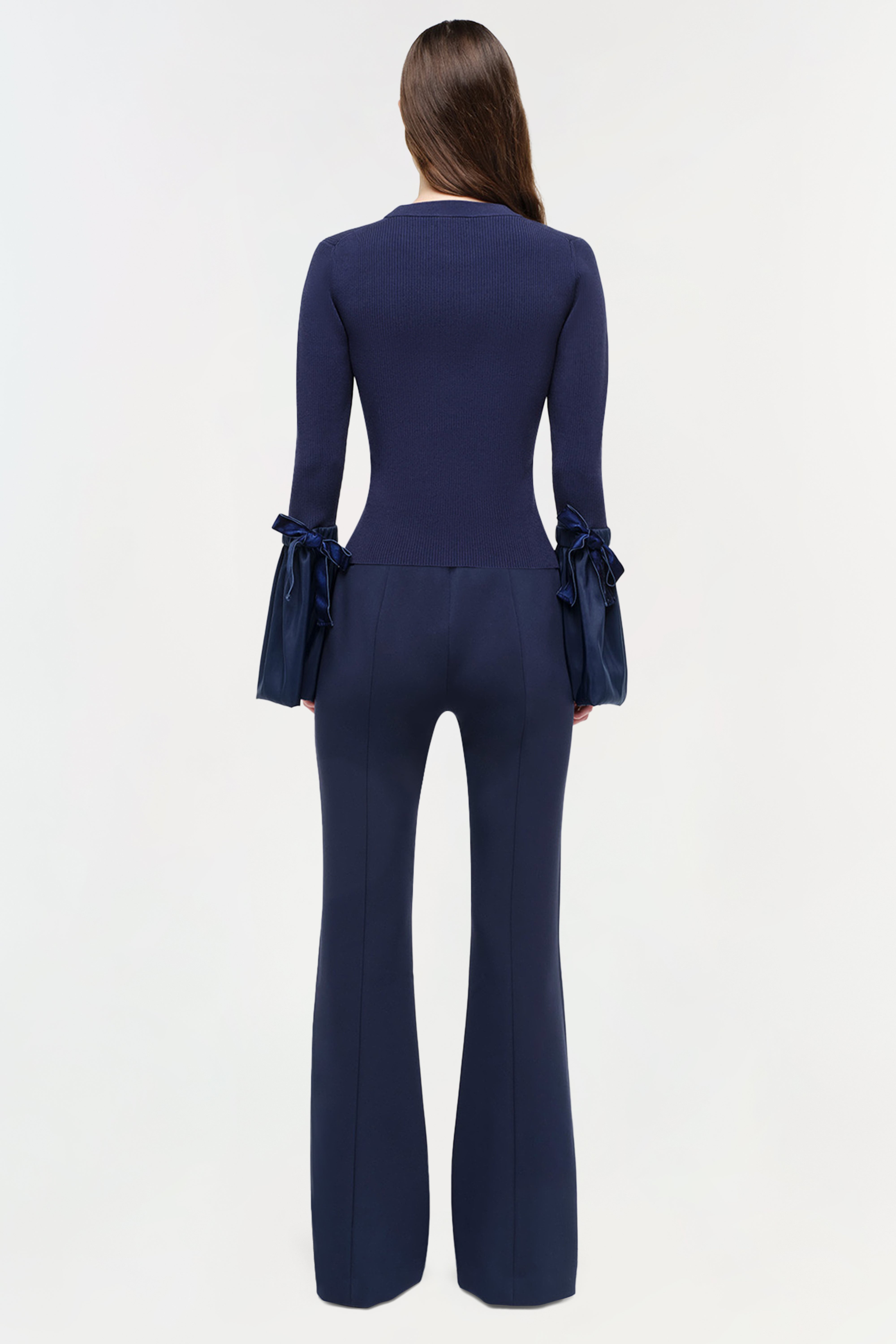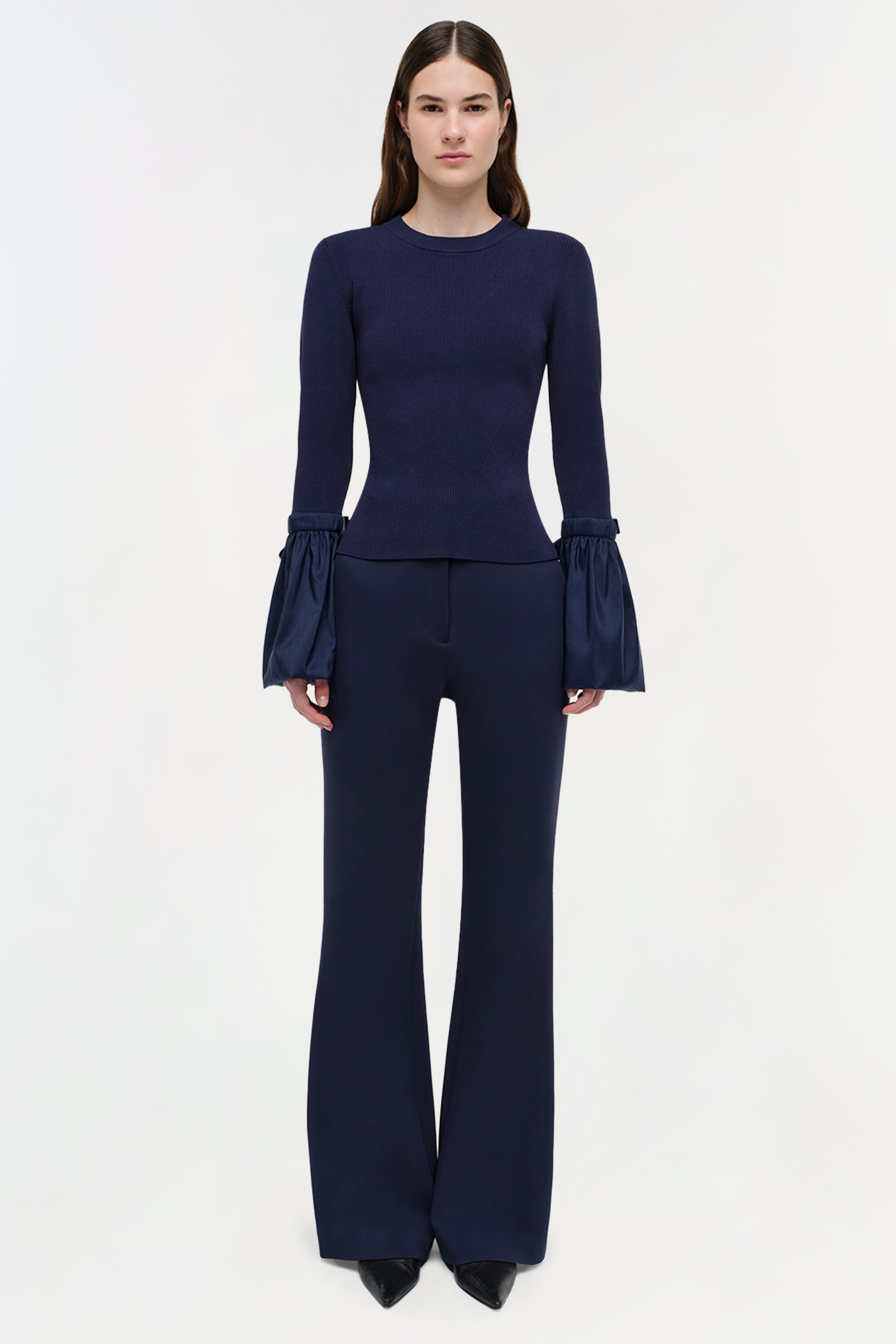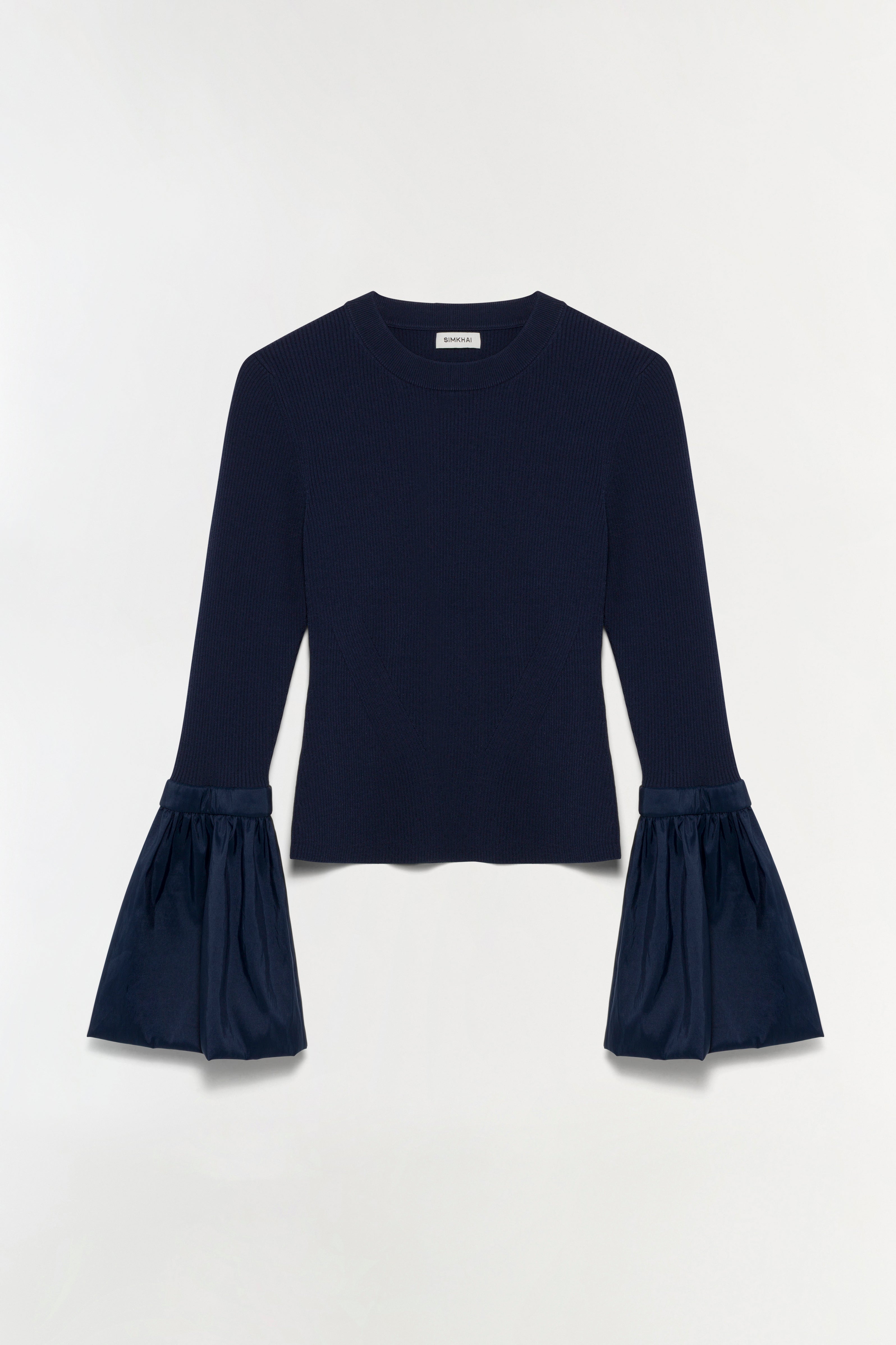 This top fuses the precision of a fitted knit with the drama of taffeta sleeves. The cuffs billow in gathered volume, anchored by bow details. A modern design elevated through contrast and proportion.