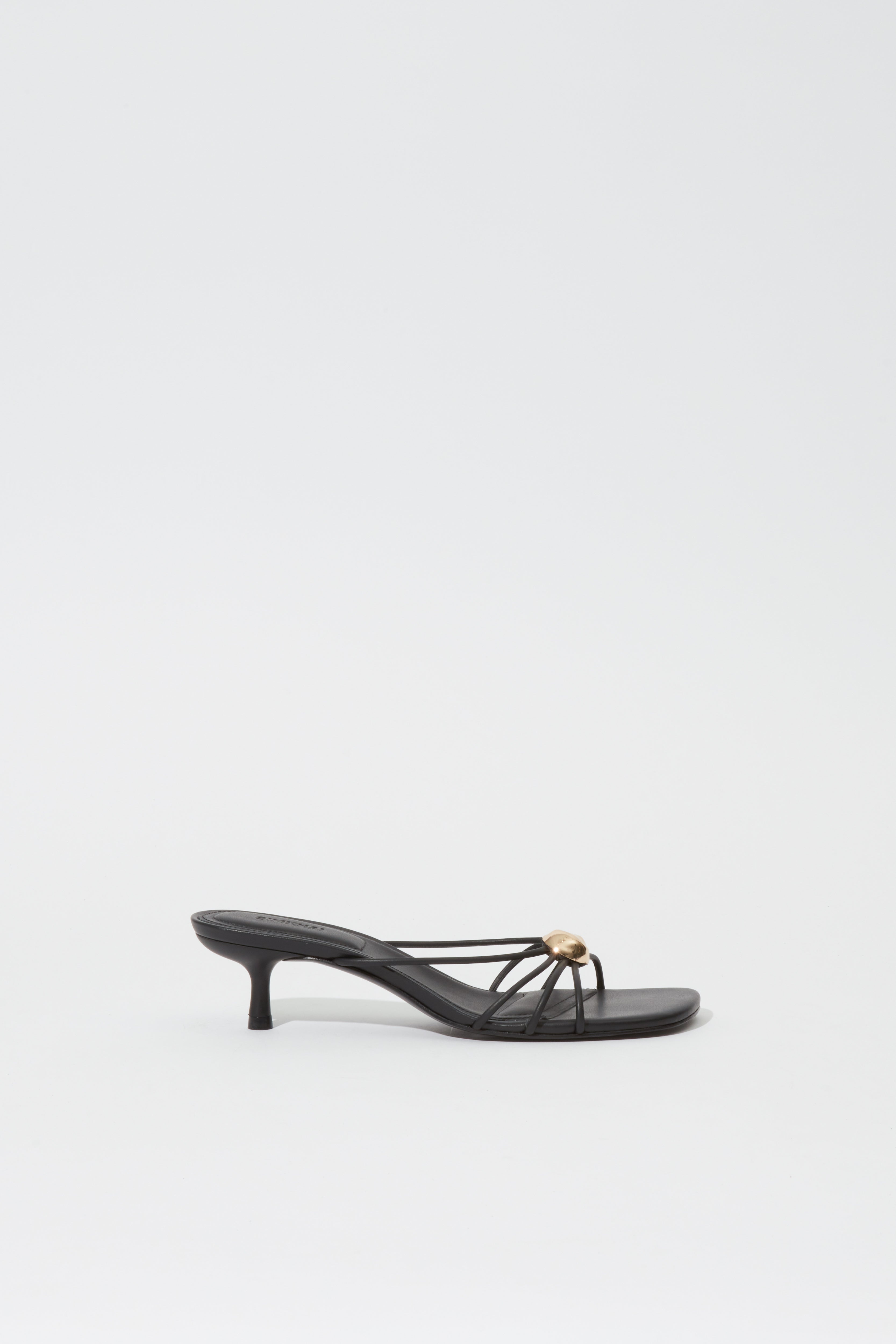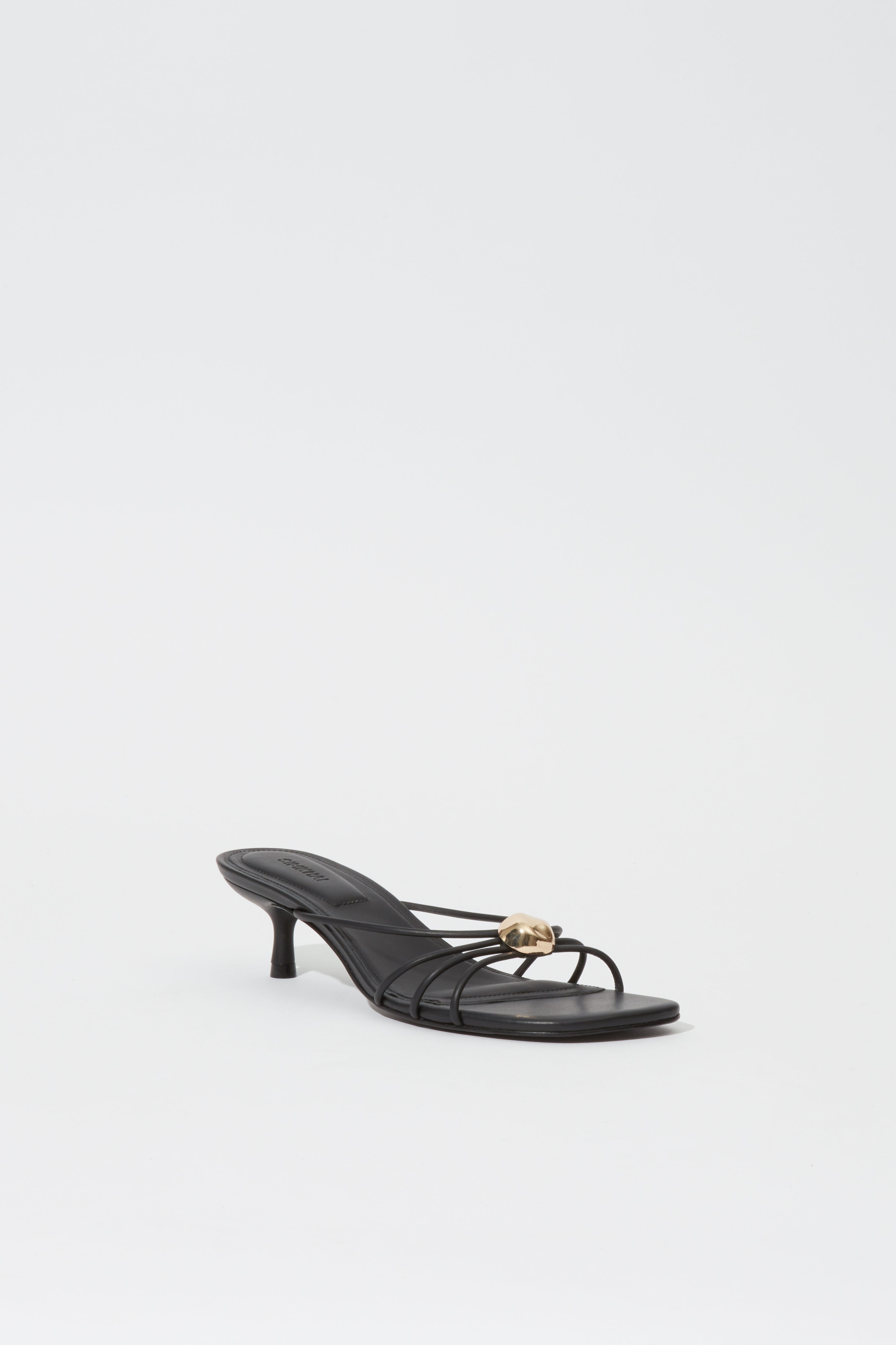Delicate leather straps radiate from a polished golden button, creating a balanced interplay of structure and simplicity. Set on a slender heel with a squared toe, the silhouette feels both modern and timeless. Refined construction with a touch of allure.
