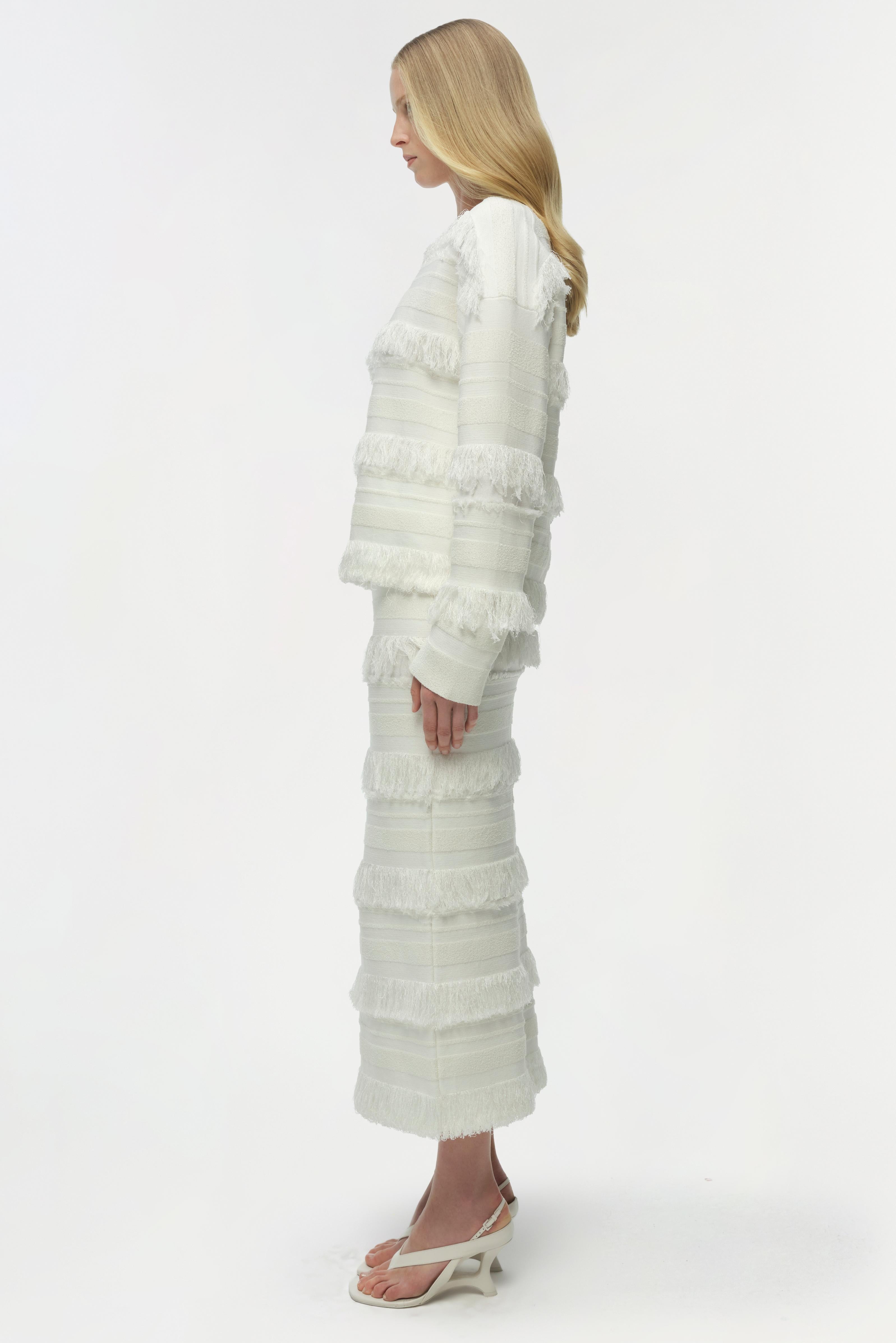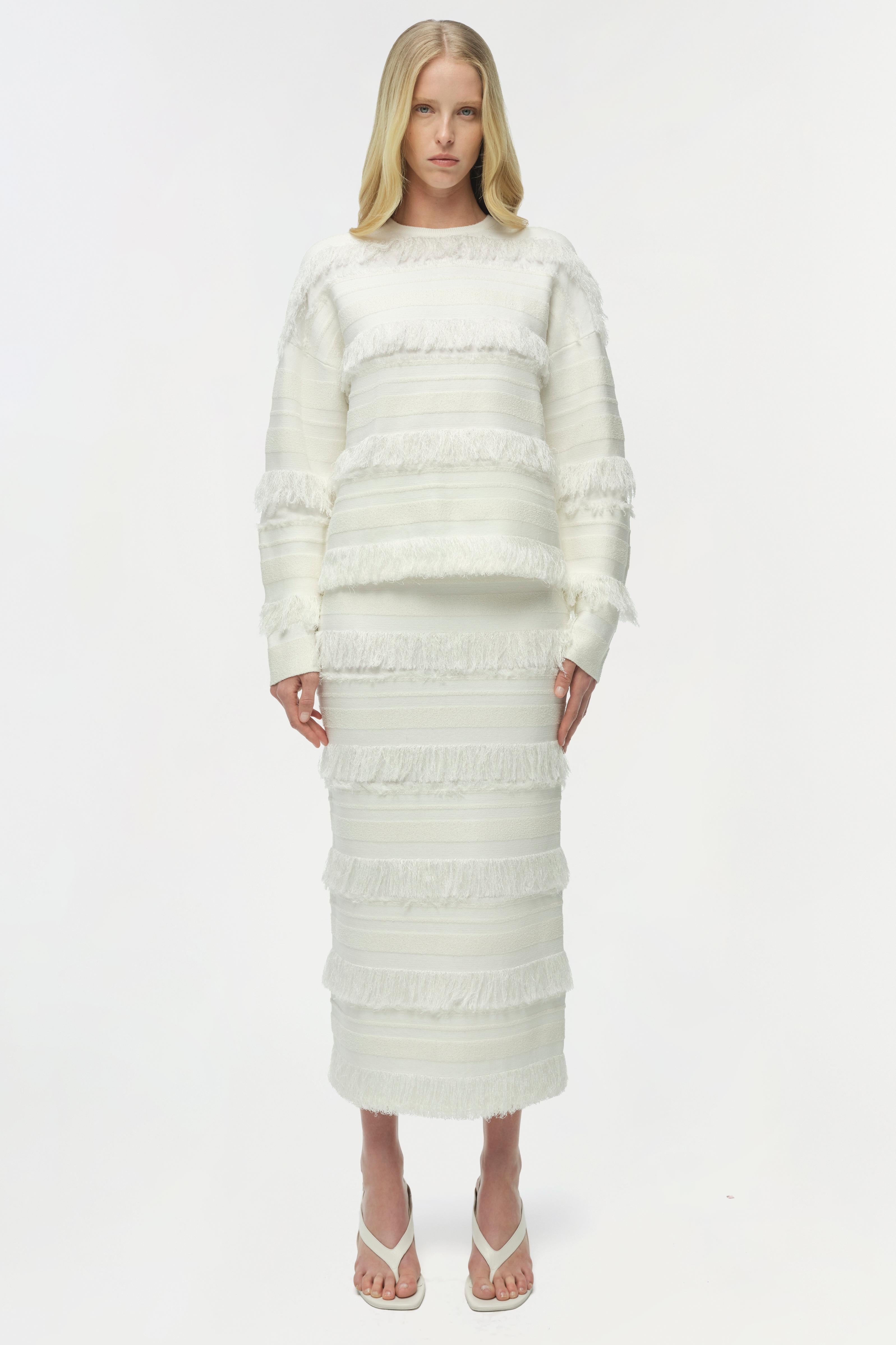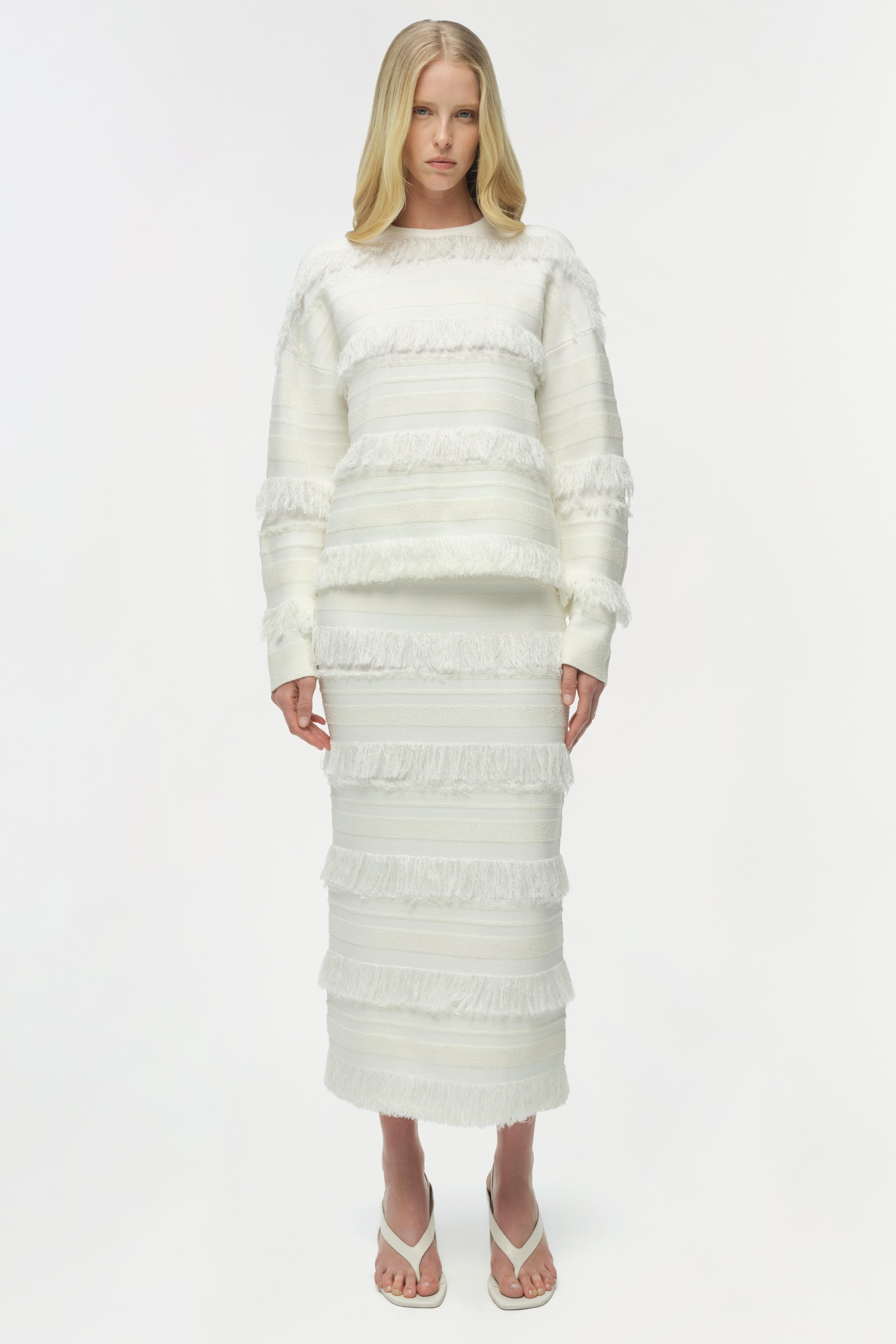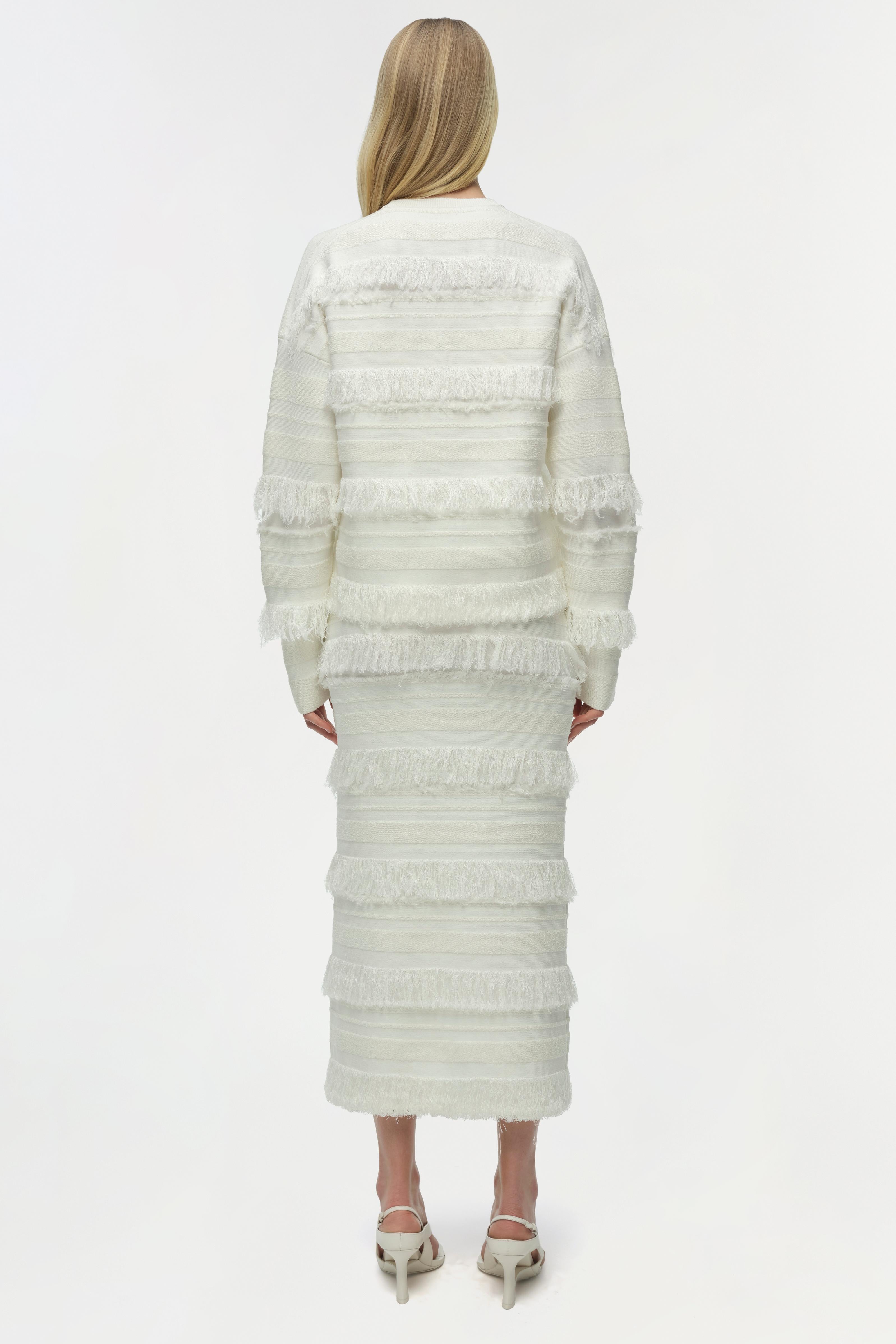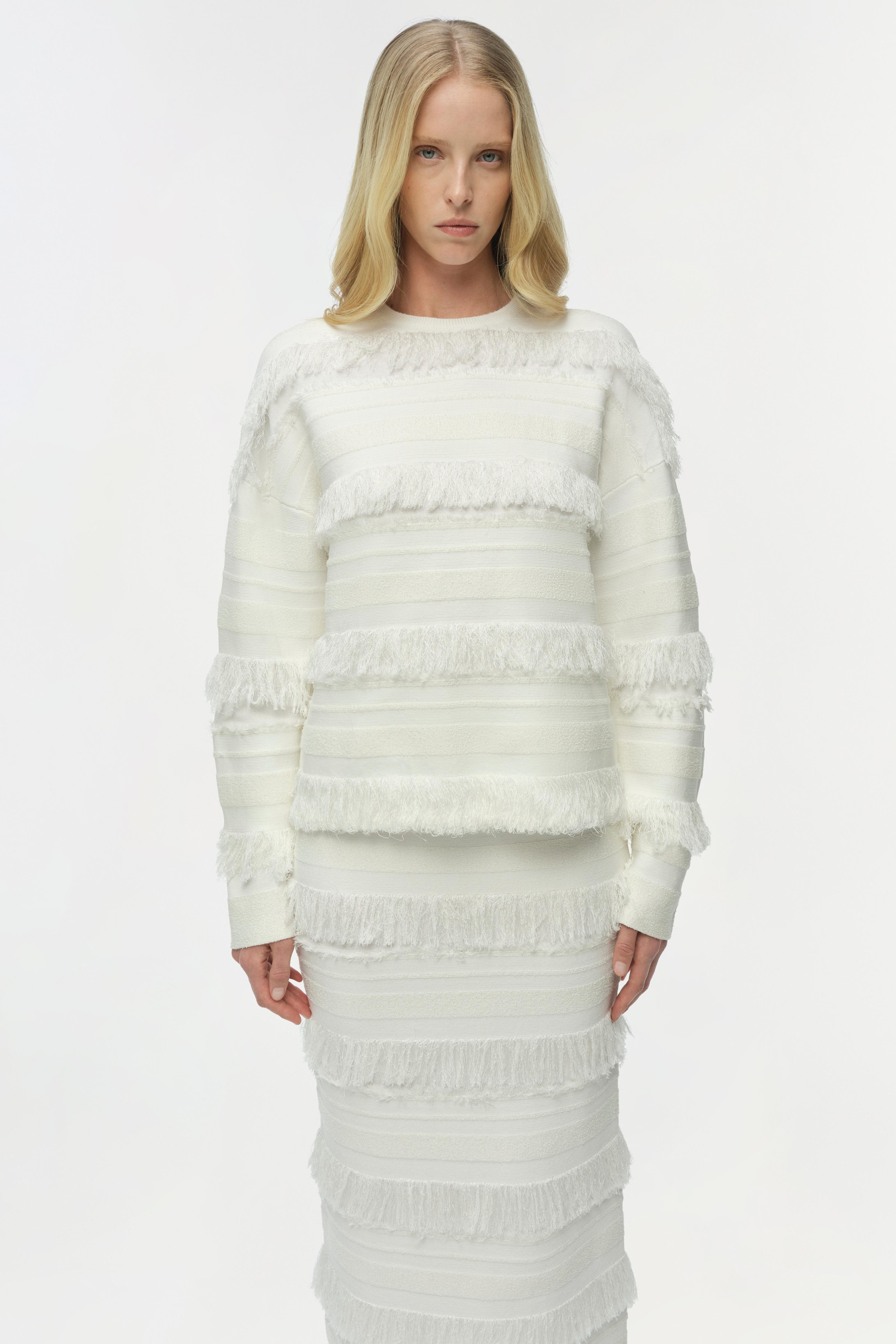 A crewneck knit with horizontal striping and tonal fringe accents. The relaxed silhouette is finished with clean edges at the collar, cuffs, and hem, while the fringe adds texture.