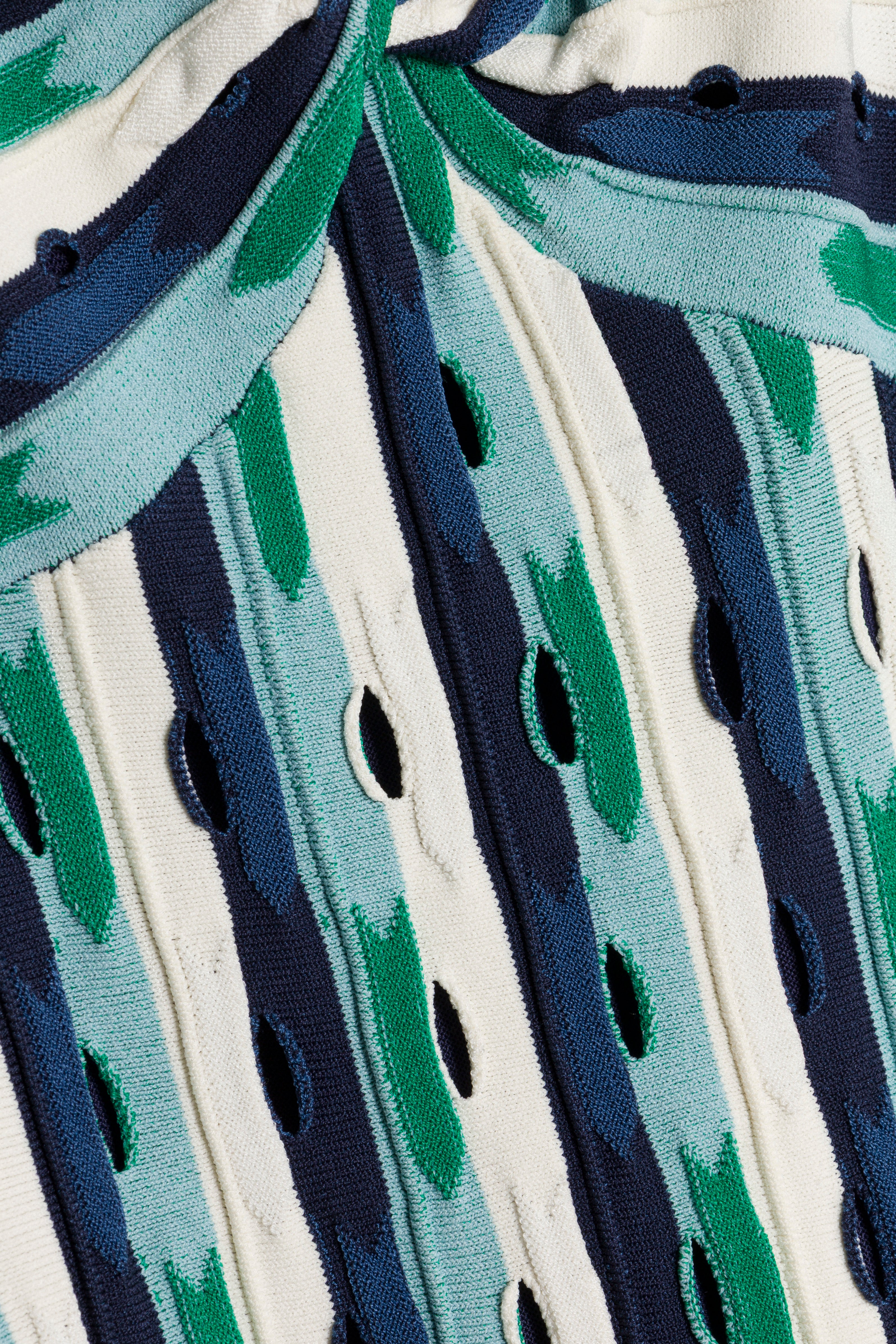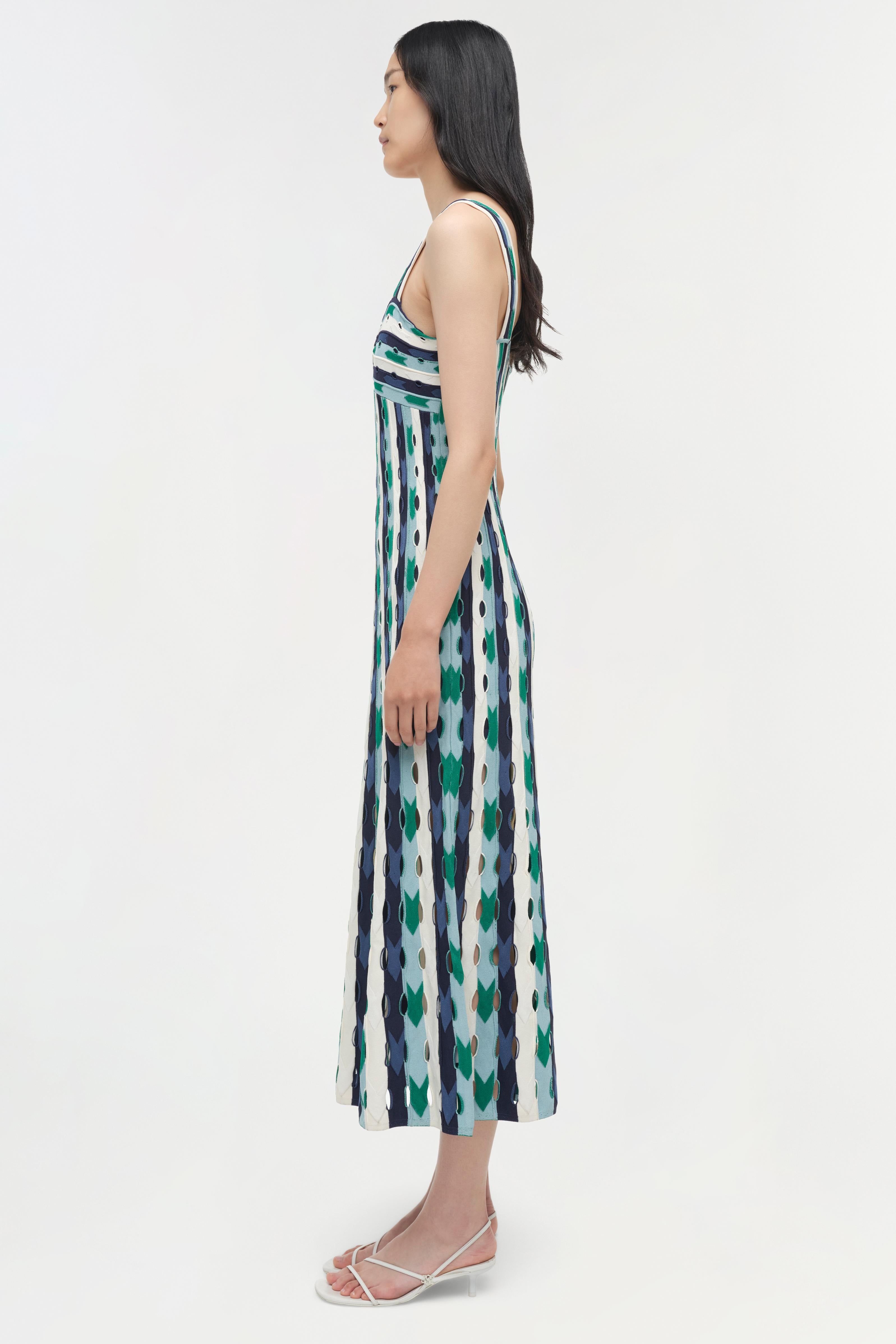 The Christina Knit Midi Dress in Kelly Green Multi. Constructed in compact eyelet knit, this midi dress contours the body with a soft vertical flow and releases into a gentle flare through the hem.