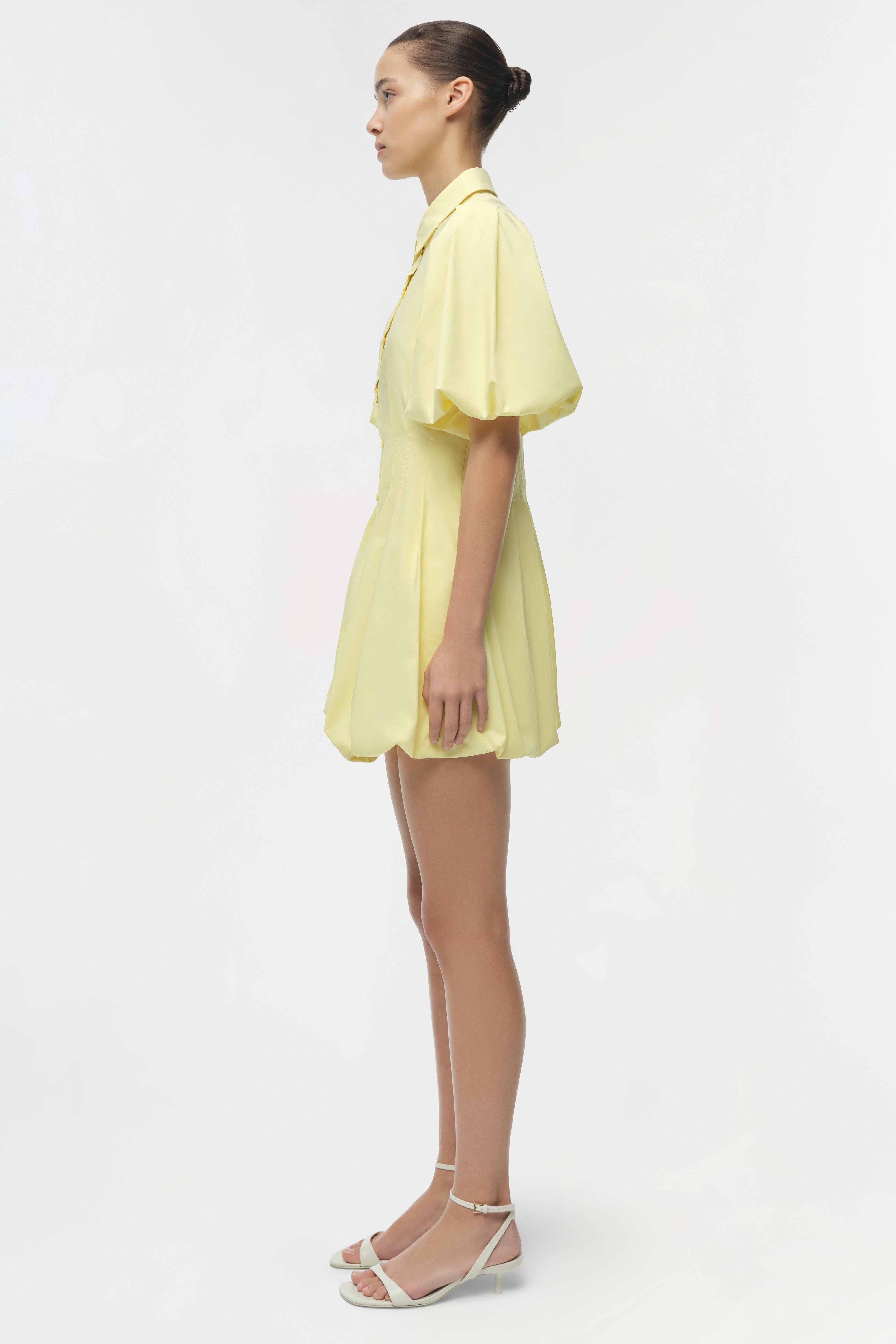 The Cleo Cotton Mini Dress in Buttercream. Crafted from crisp cotton poplin, this vibrant mini features elegant pintuck accents and dramatic balloon sleeves for a standout silhouette.