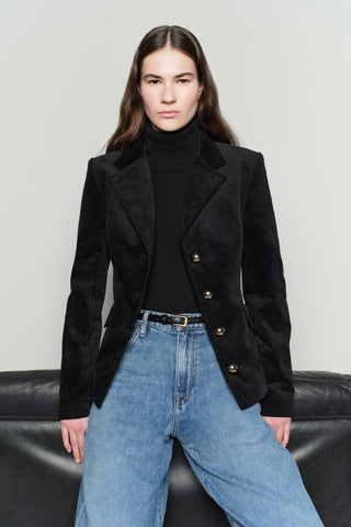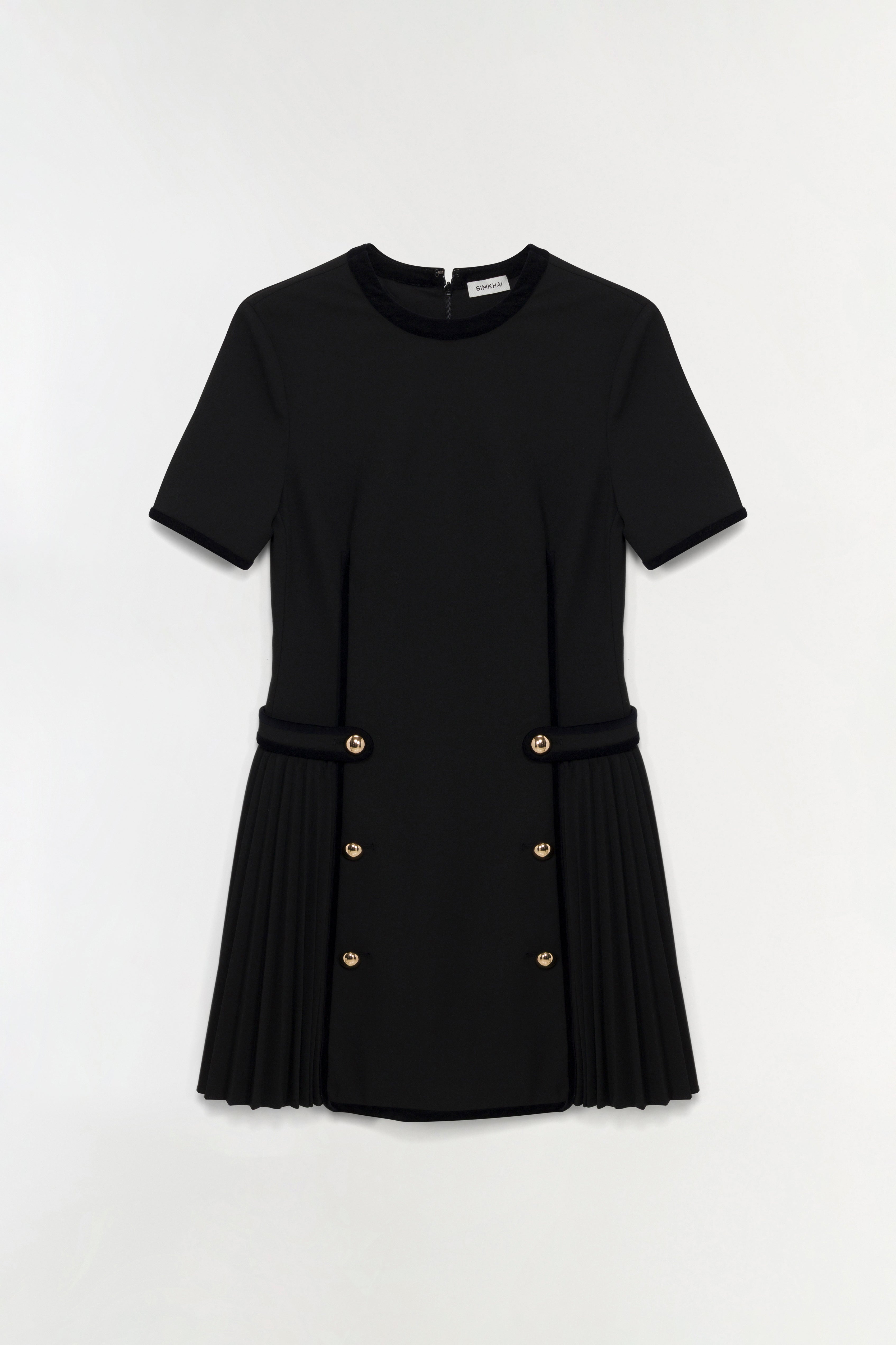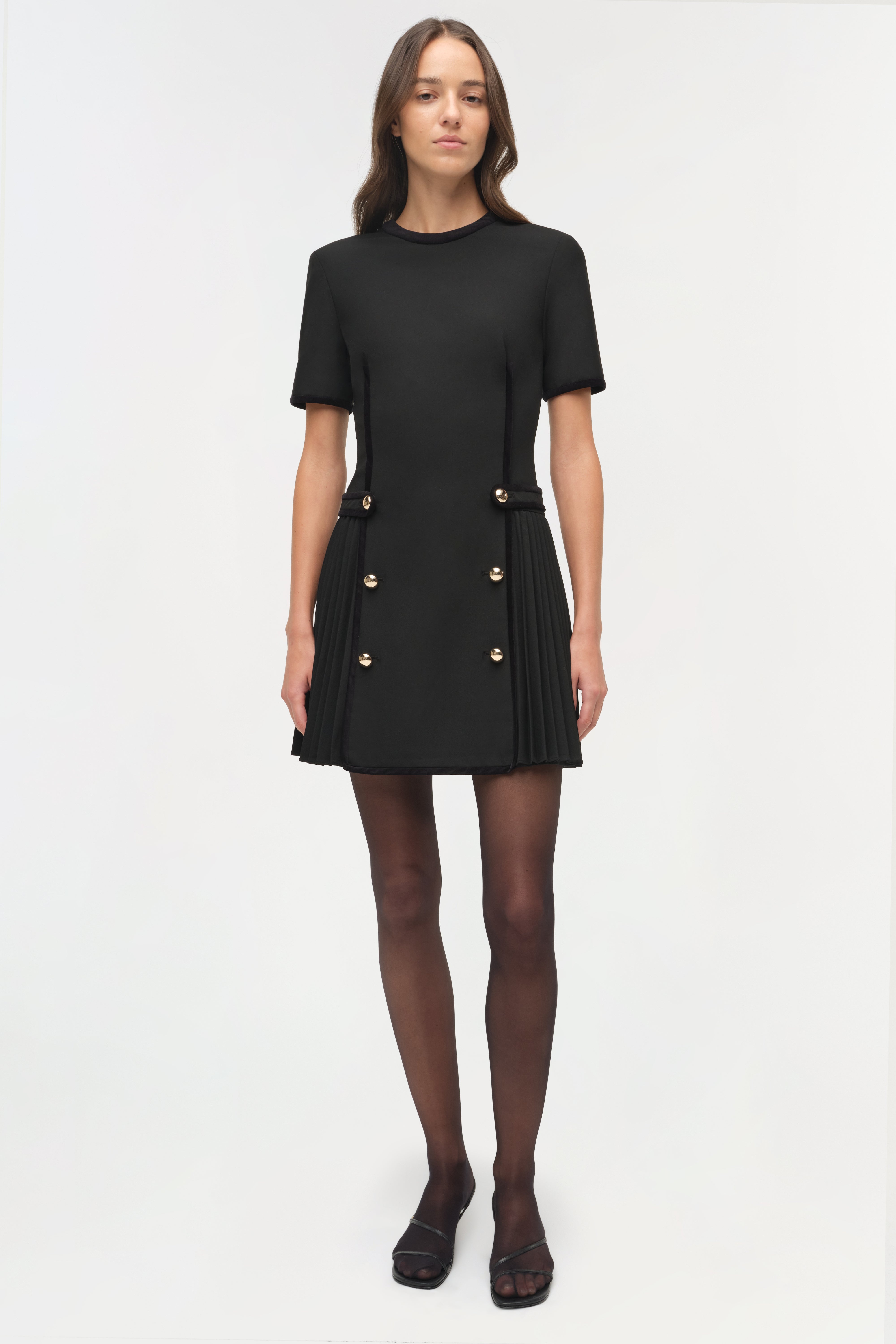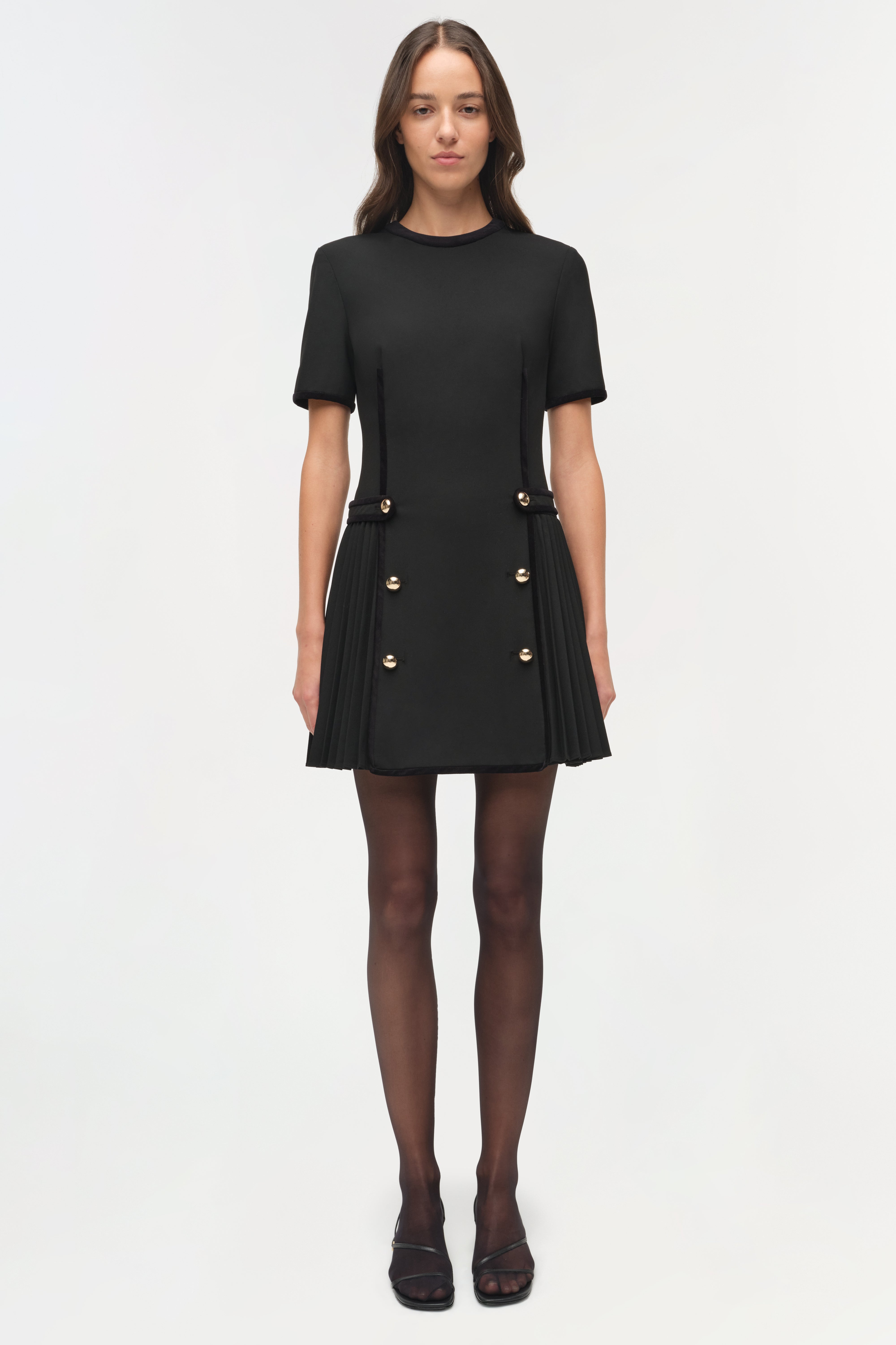 Framed in velvet, this dress transforms structure into statement. Pleated side panels unfold with every step, while gilded buttons evoke a sense of regality. A modern mini that exudes strength and elegance.