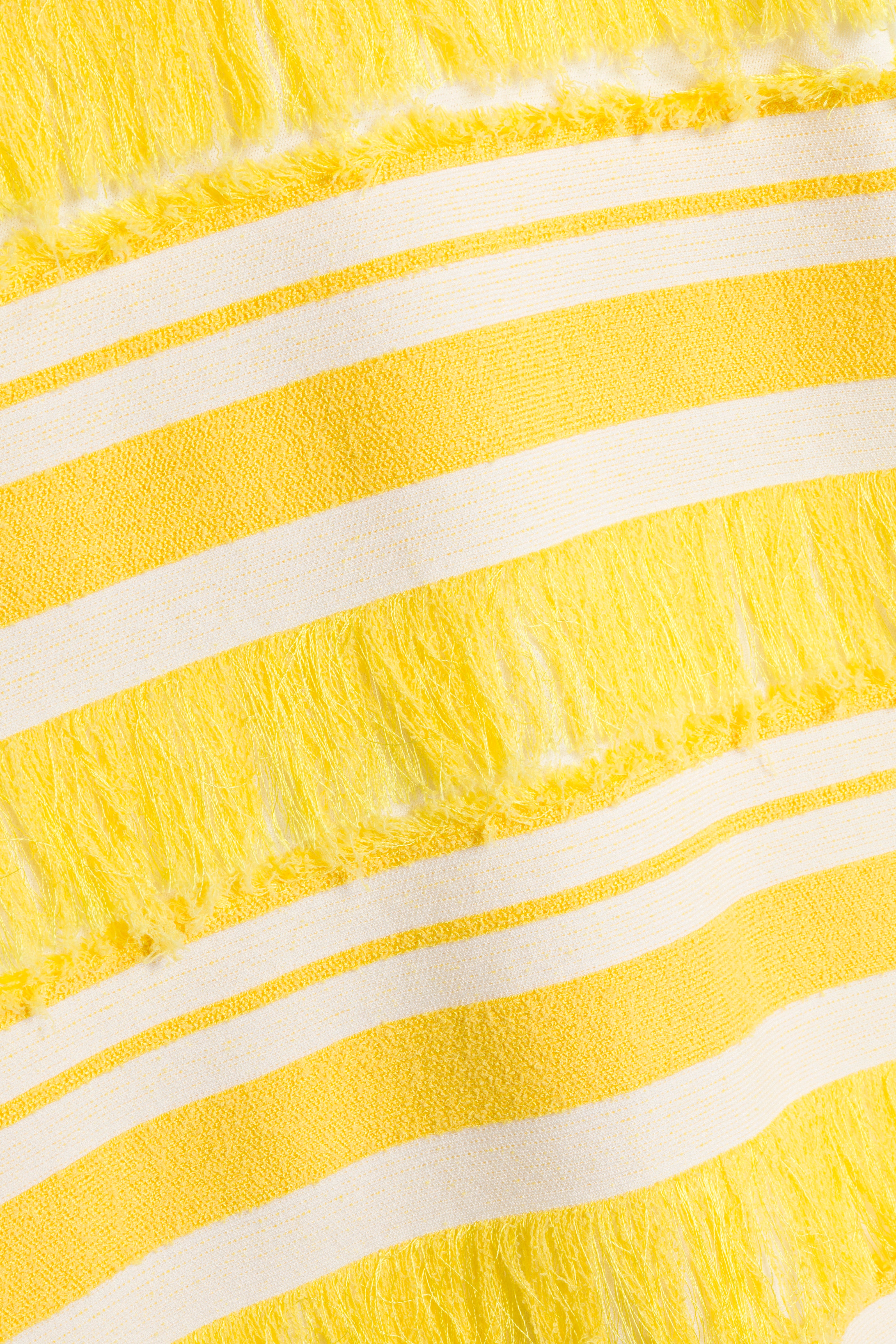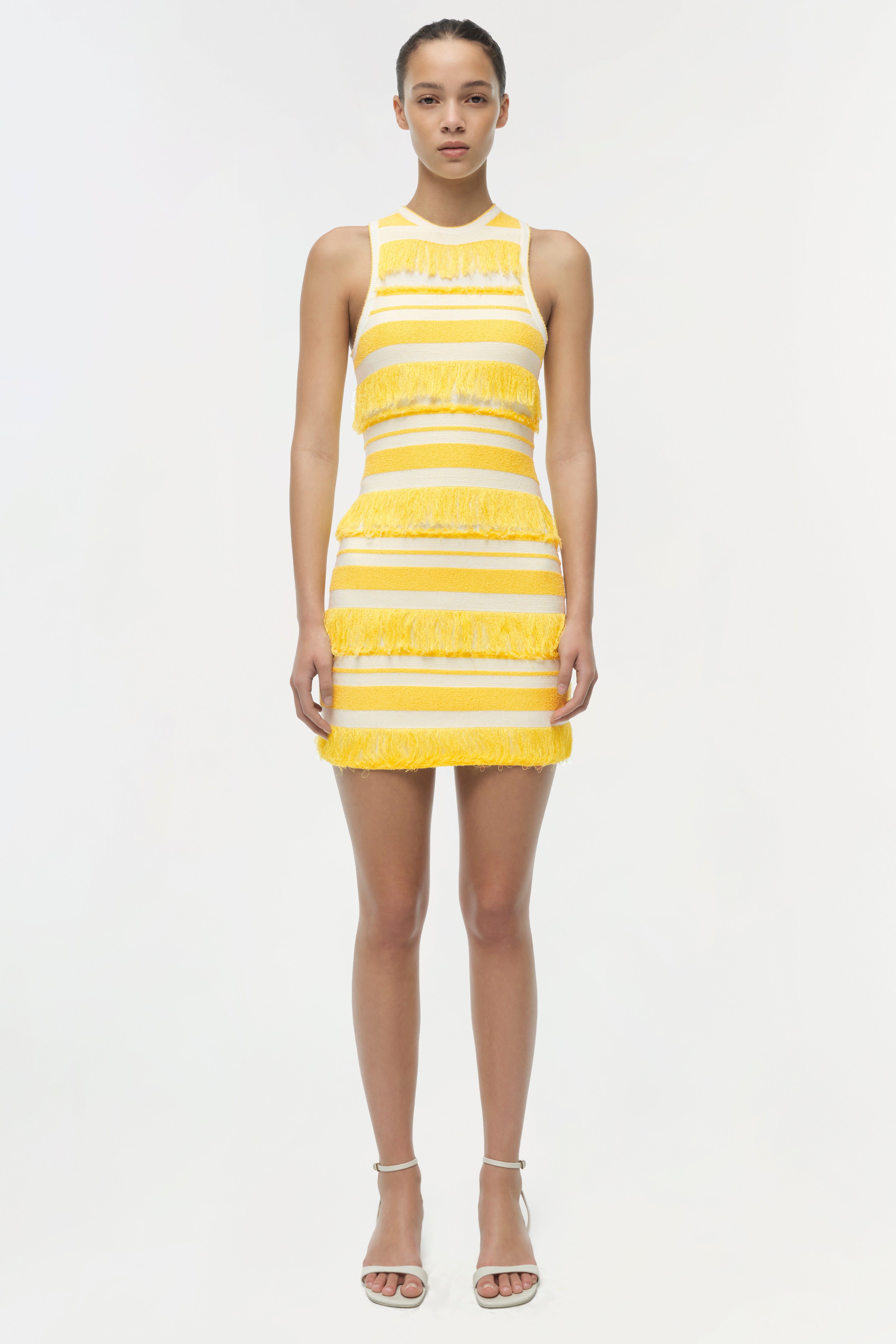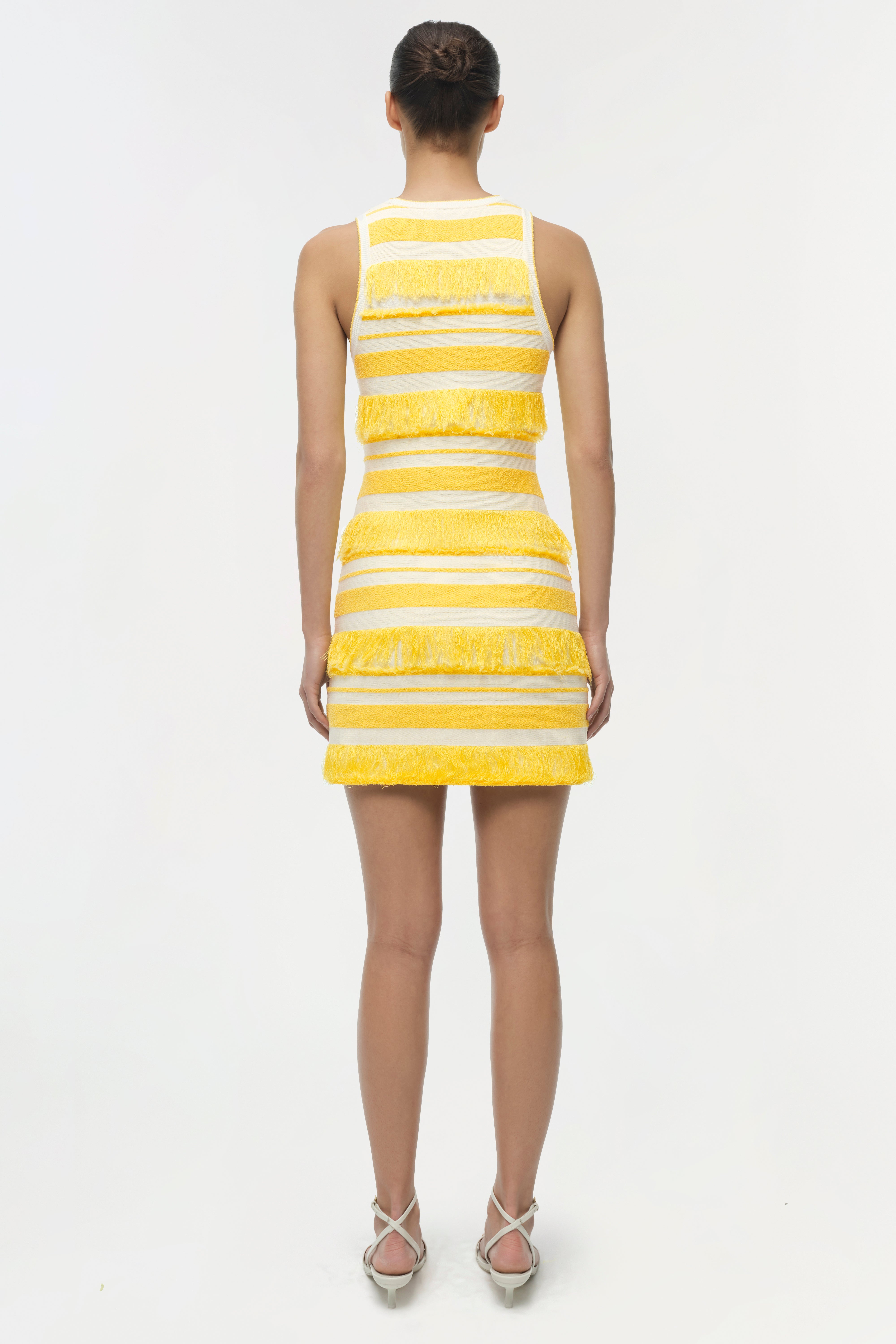 The Elly Knit Mini Dress in Solar Stripe. A hand-finished knit mini dress woven in bold horizontal stripes. Strands of tonal fringe are integrated throughout, creating a surface alive with texture and subtle movement.