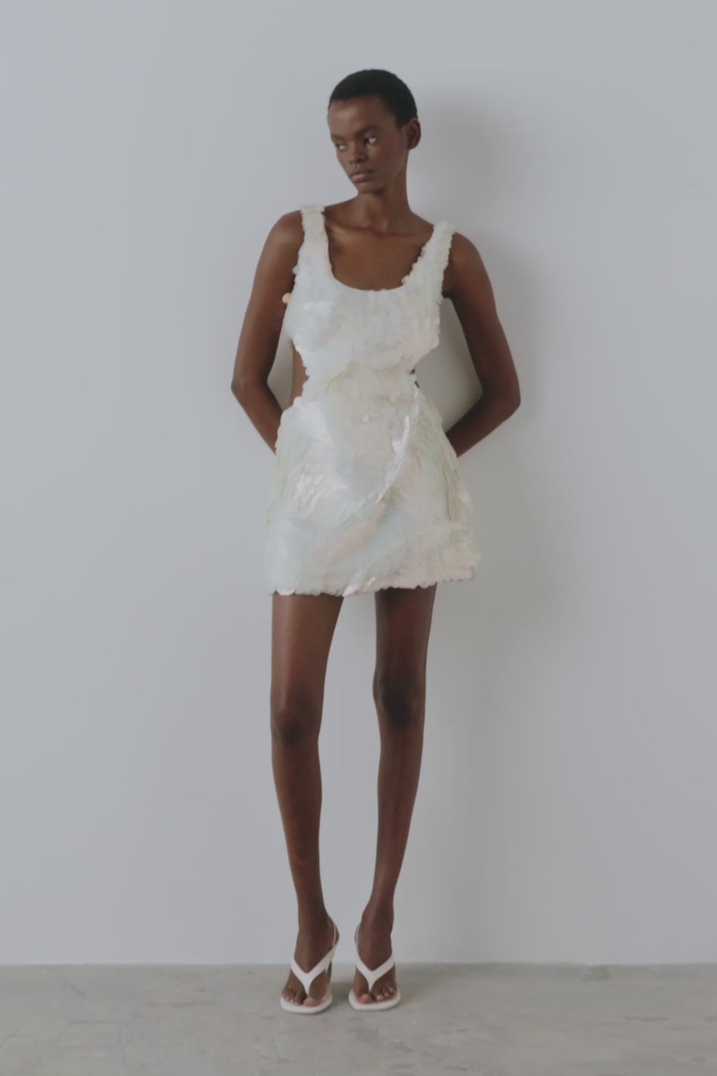 Layered sequins form a rhythmic, light-reflective pattern that create dimension and movement throughout. Side cutouts contour the waist, lending the silhouette a sculpted, modern edge.