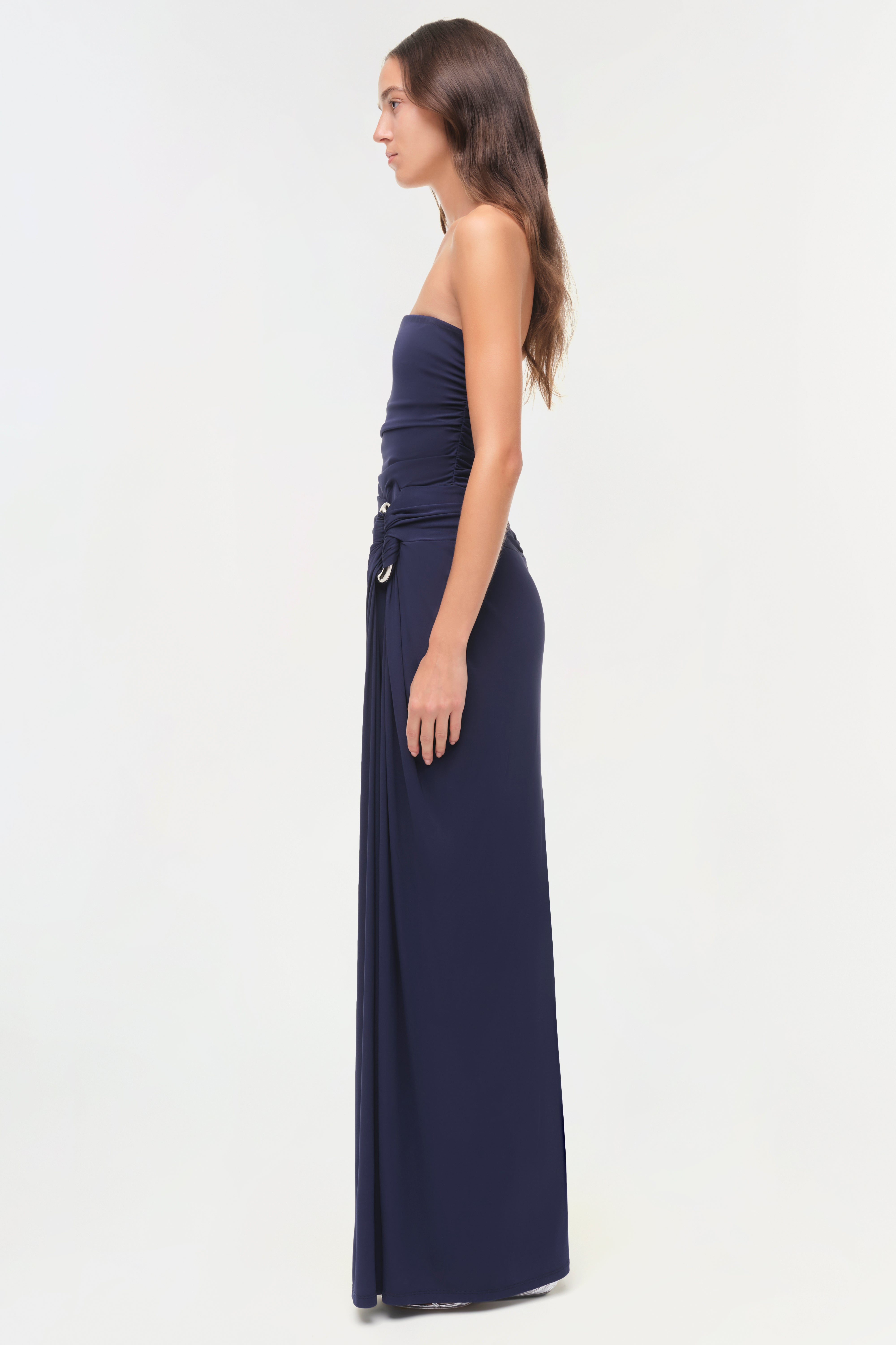 A strapless gown crafted in  that contours the body with ease. A hand-gathered drape cascades from the hip, secured with metal ring hardware for sculptural detail. The floor-grazing silhouette balances clean lines with fluid movement.
