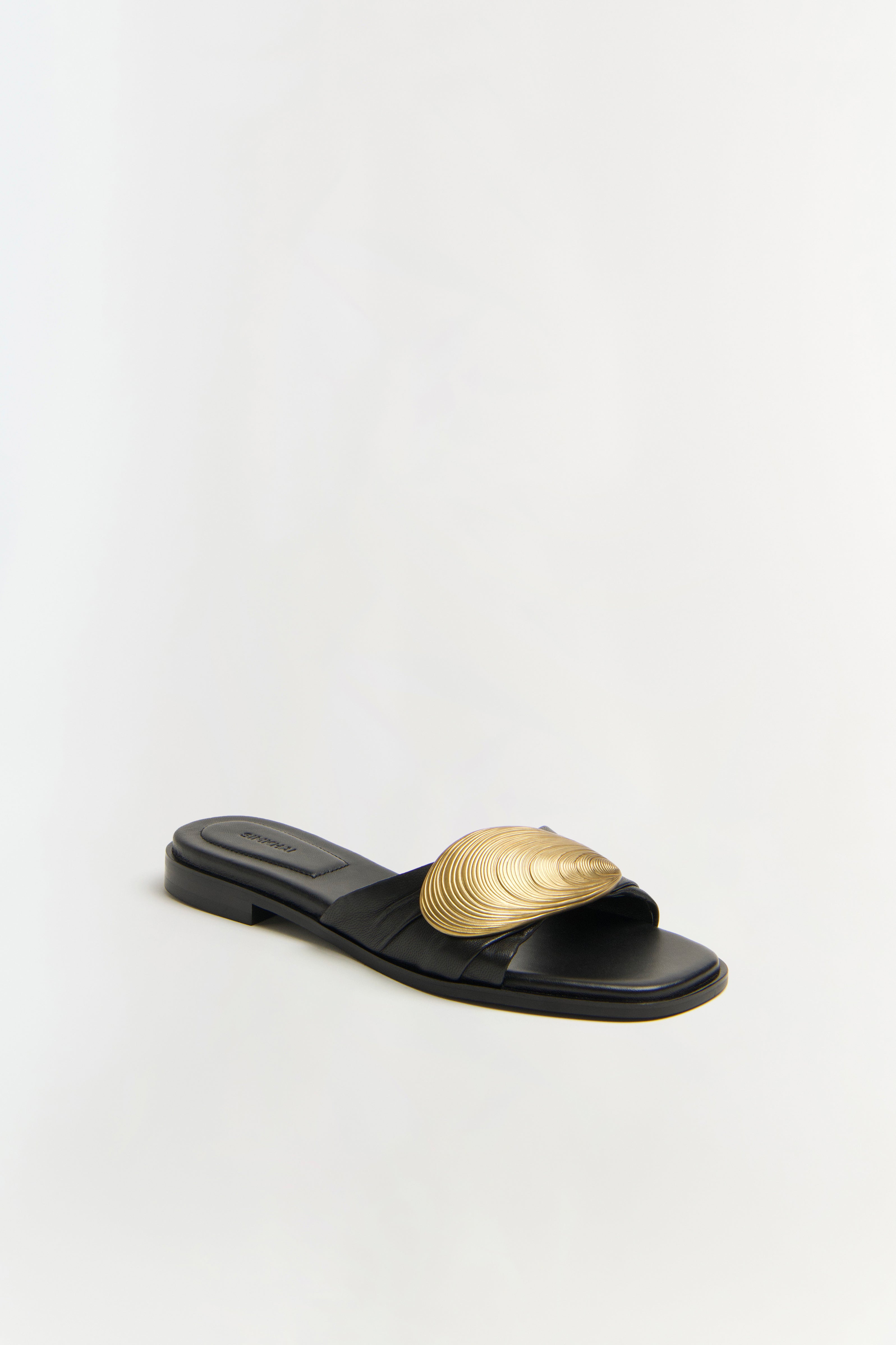 The Gigi Oyster Leather Flat Slide in Black Antique Gold. Featuring a sleek design and statement accents, these flats are perfect for elevating your casual wardrobe.