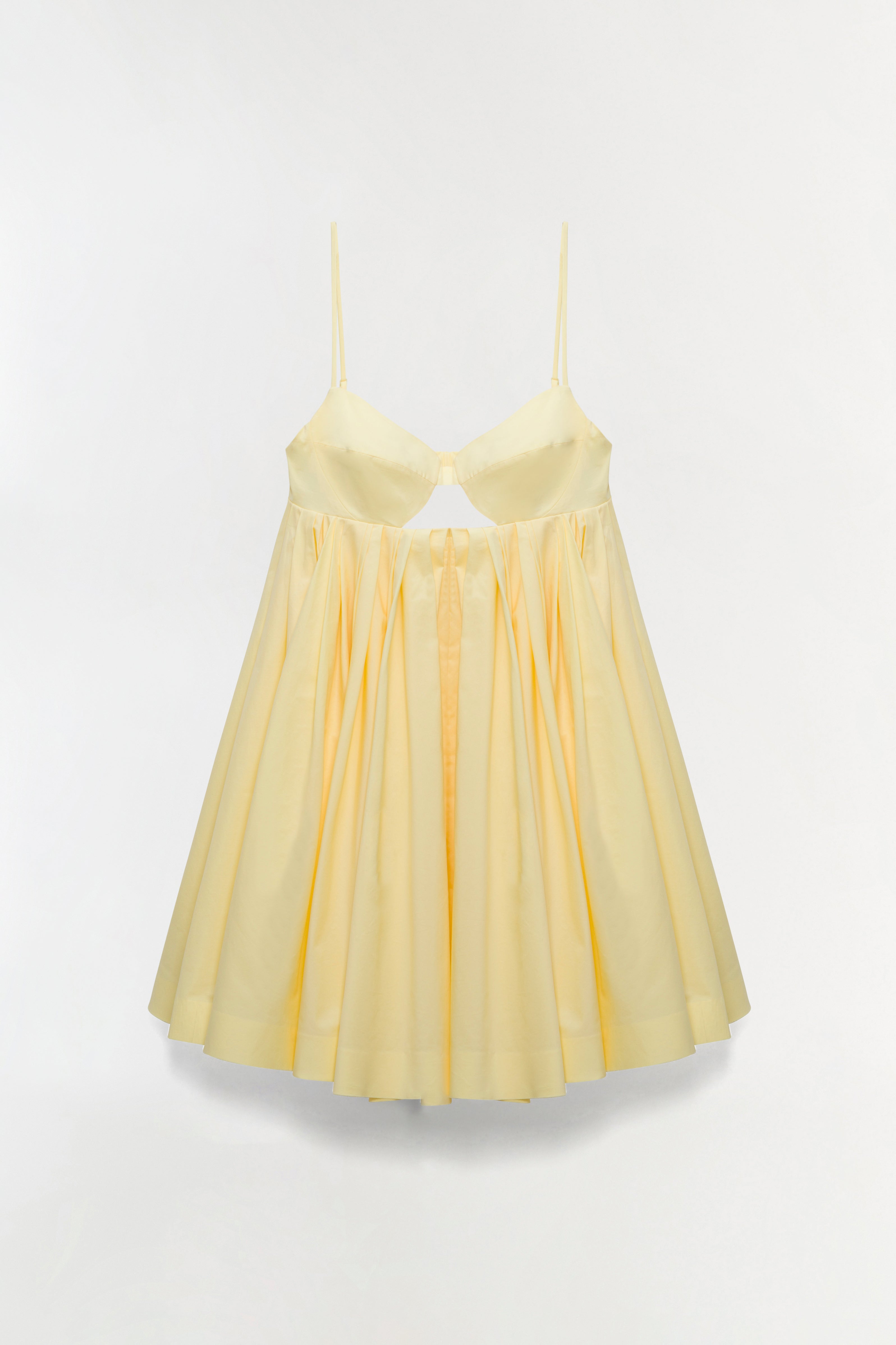 The Janie Cotton Mini Dress in Buttercream. This mini dress, cut in cotton poplin, features a playful, flared silhouette for effortless movement. The center-front cutout sits beneath a structured, bralette-inspired neckline for a modern, sculpted finish.