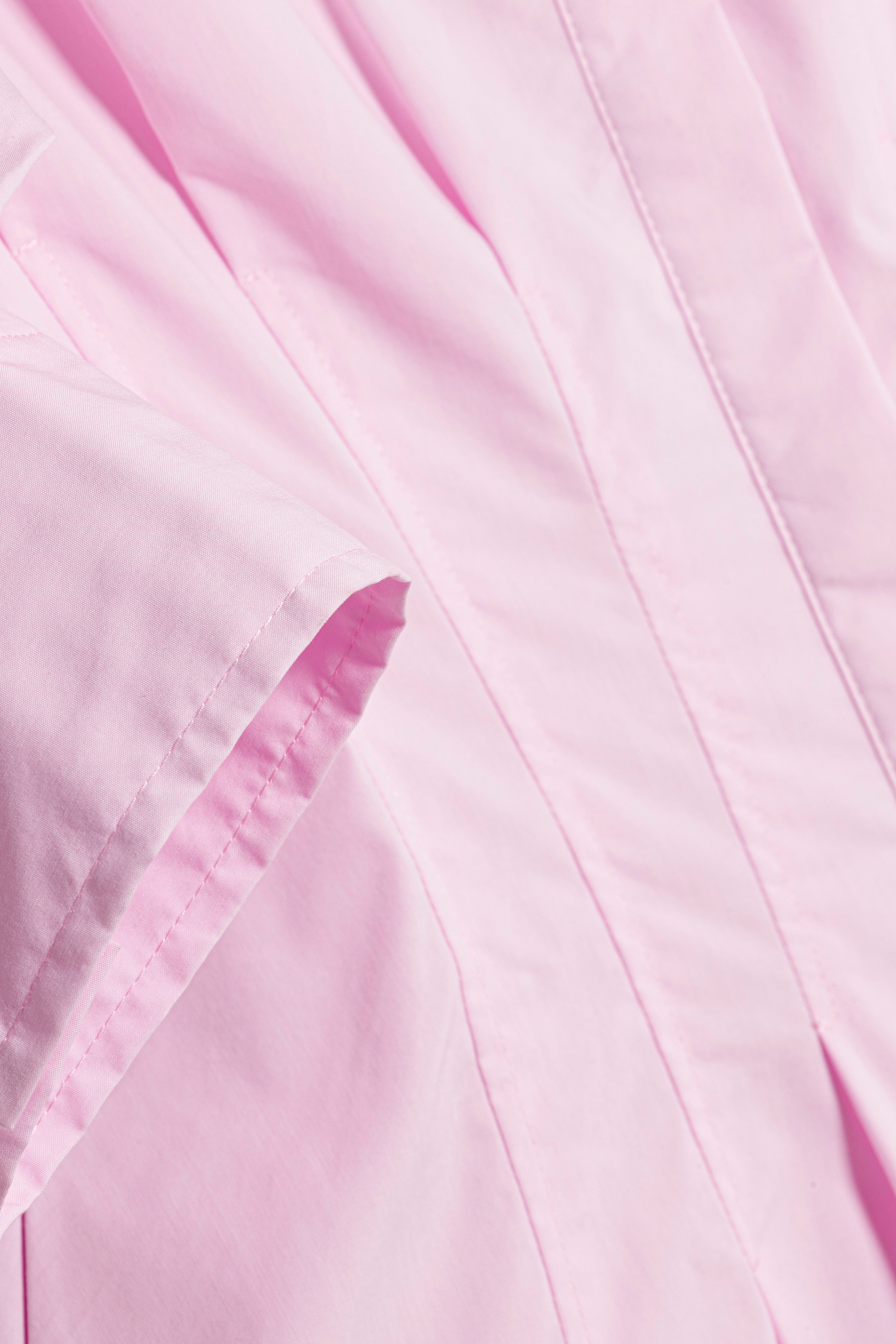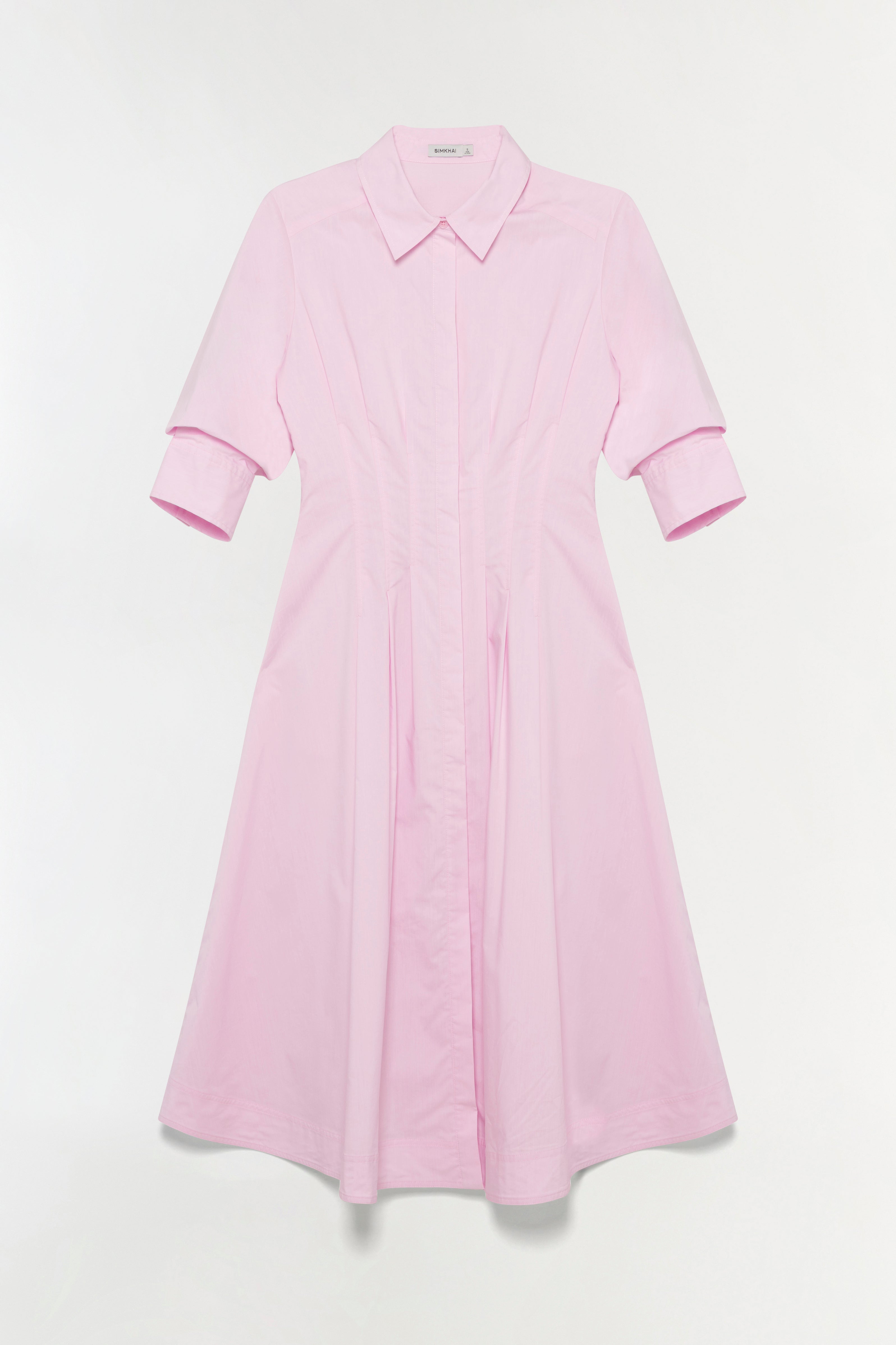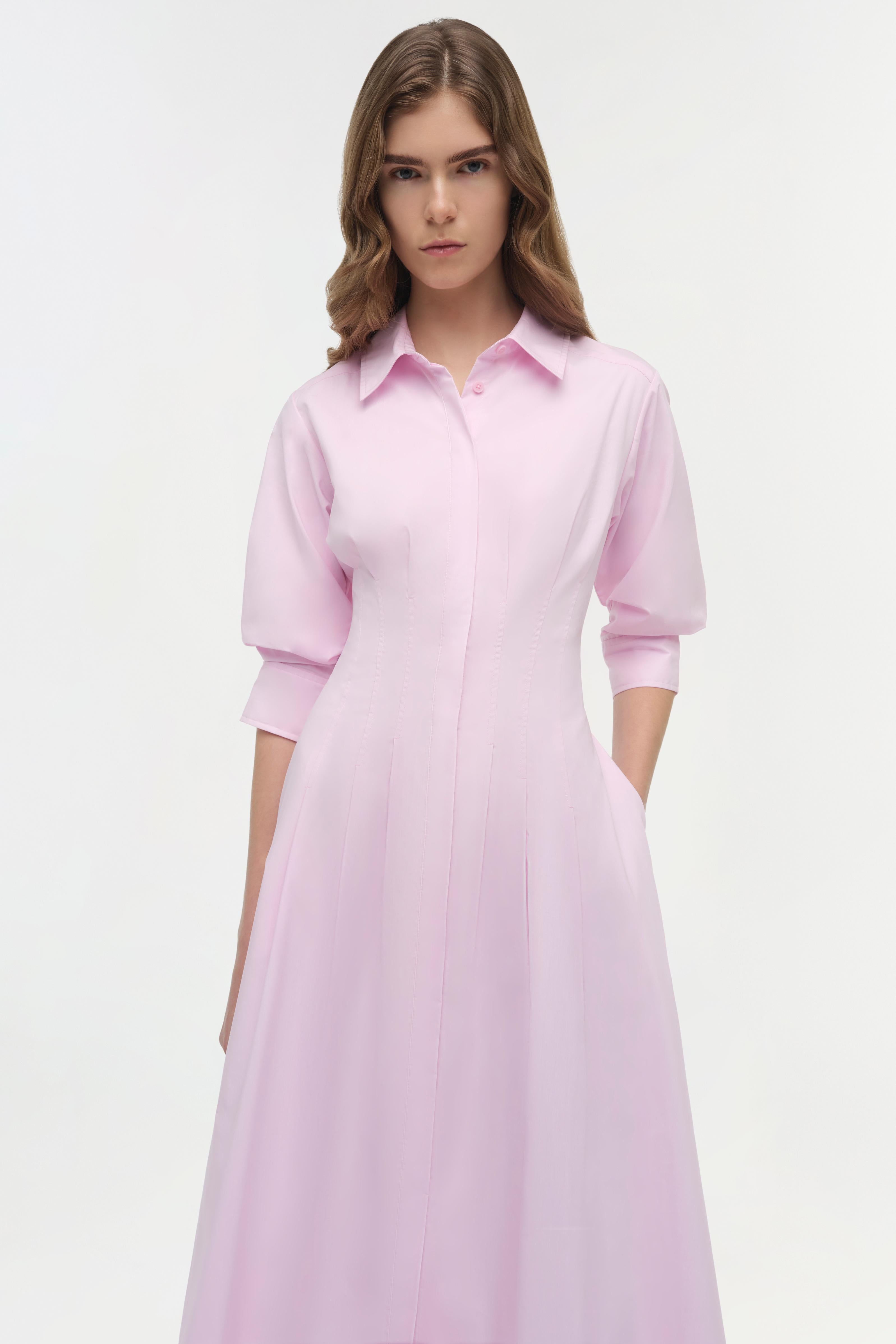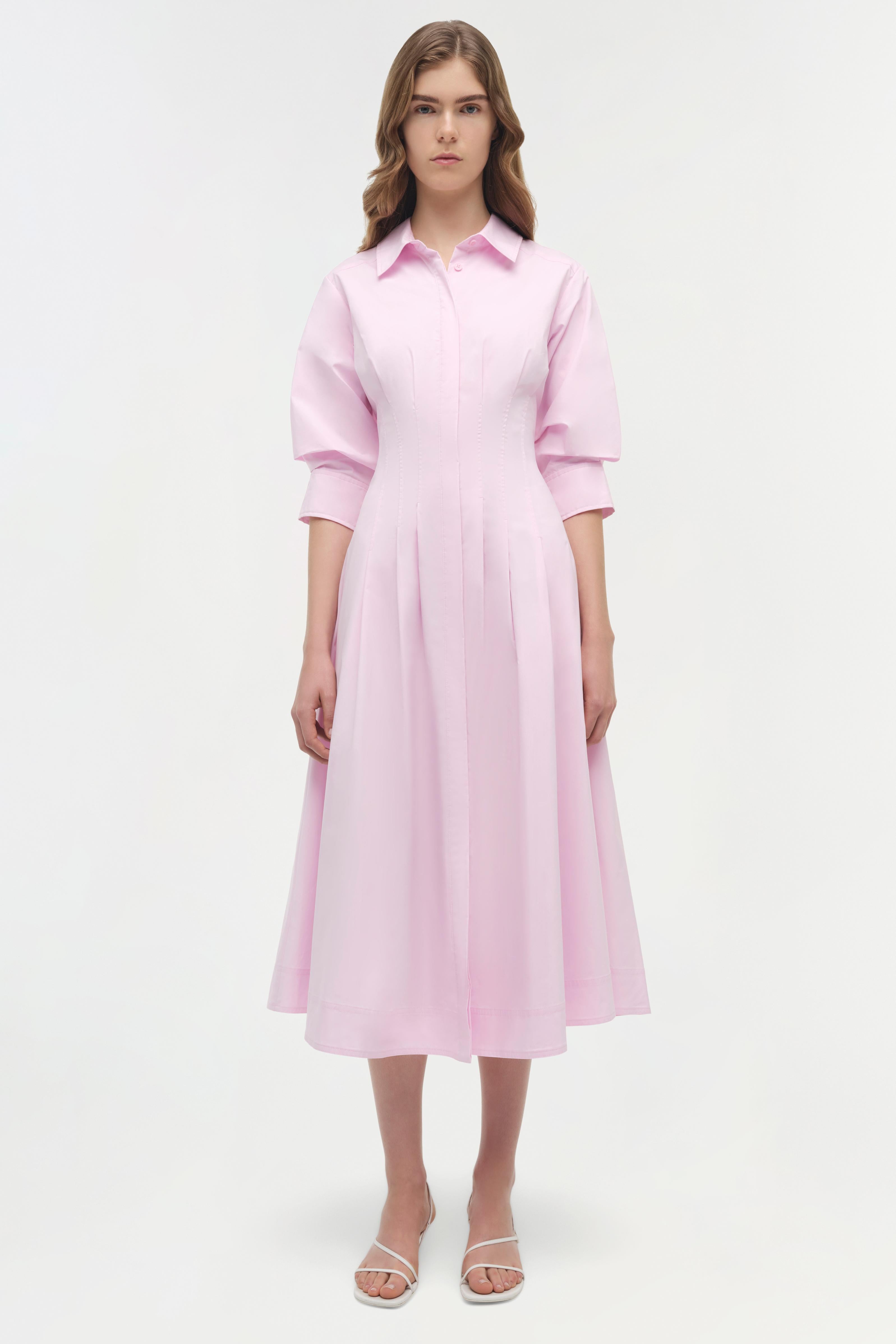 The Jazz Pintuck Midi Dress in Tulip. This polished pintuck midi, crafted from crisp cotton poplin features a defined waist, structured collar, and a flowing A-line silhouette.