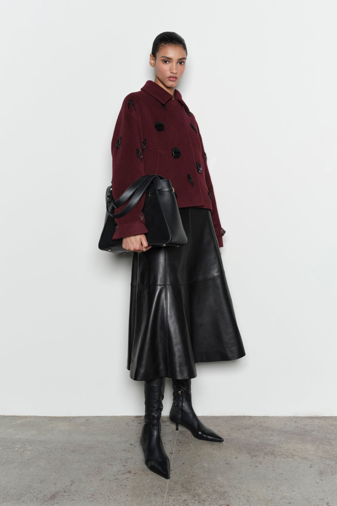 Cut from double faced wool, this jacket is spotted with hand-stitched cascading beadwork. The cropped silhouette sharpens the jacketÕs bold presence, balancing clean tailoring with hand-finished artistry. A statement piece that turns craftsmanship into modern ornament.