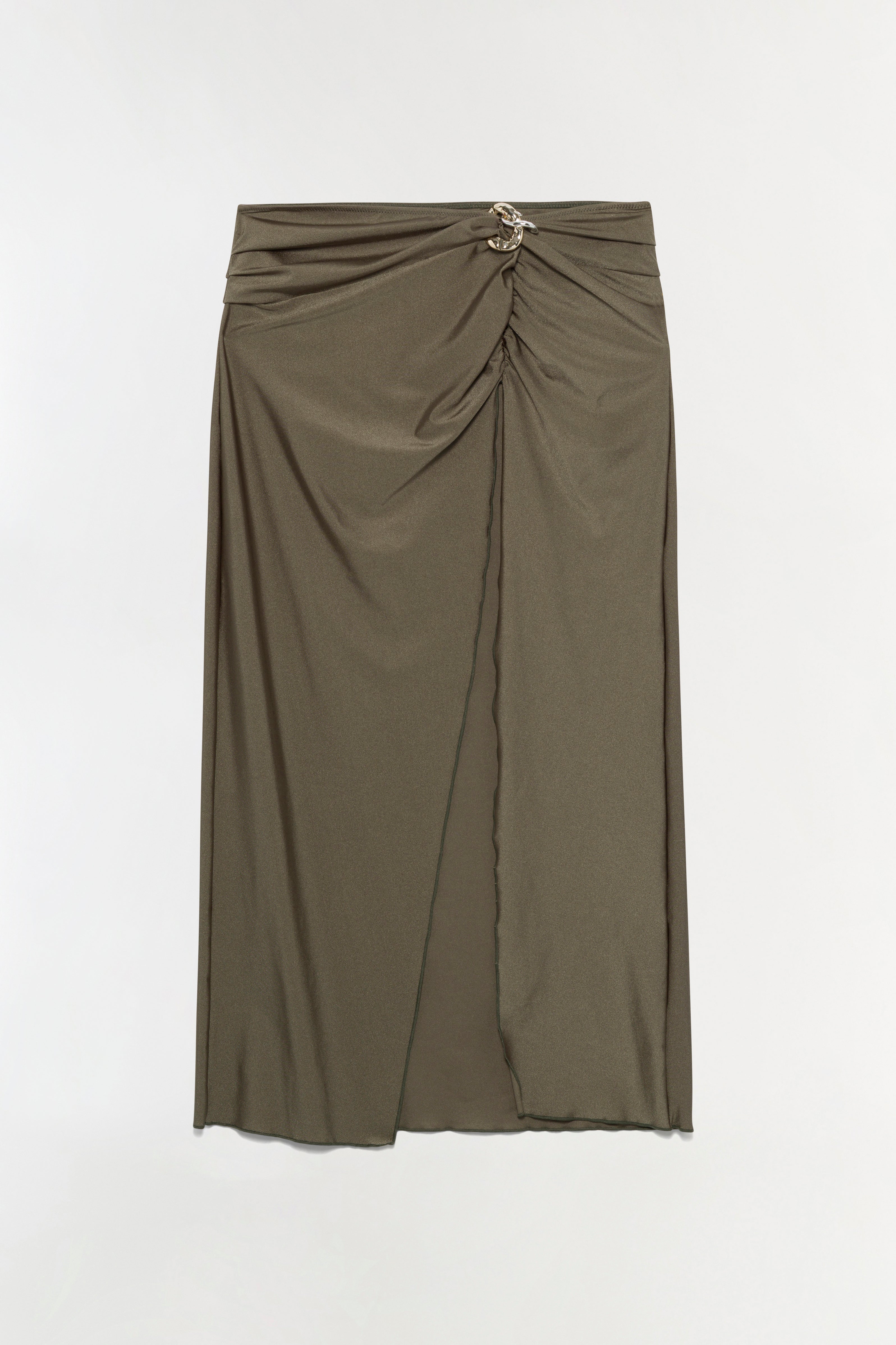 Cut from a smooth stretch fabric with a subtle satin sheen, this pareo is shaped with a softly ruched waist, secured by a metal chain-link accent. The midi length and high slit make it effortless to layer over a bikini, offering a versatile silhouette that balances coverage with fluid movement.