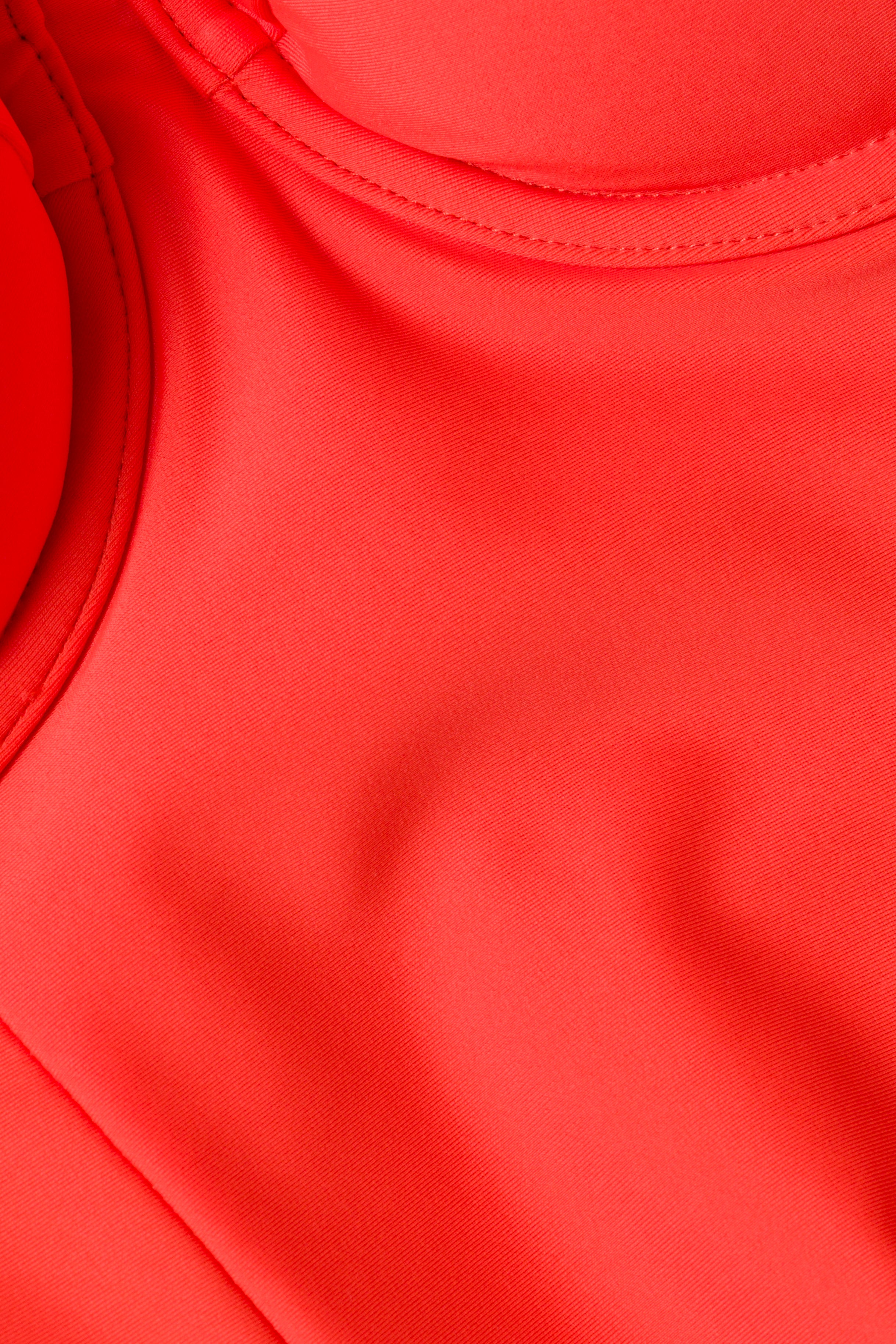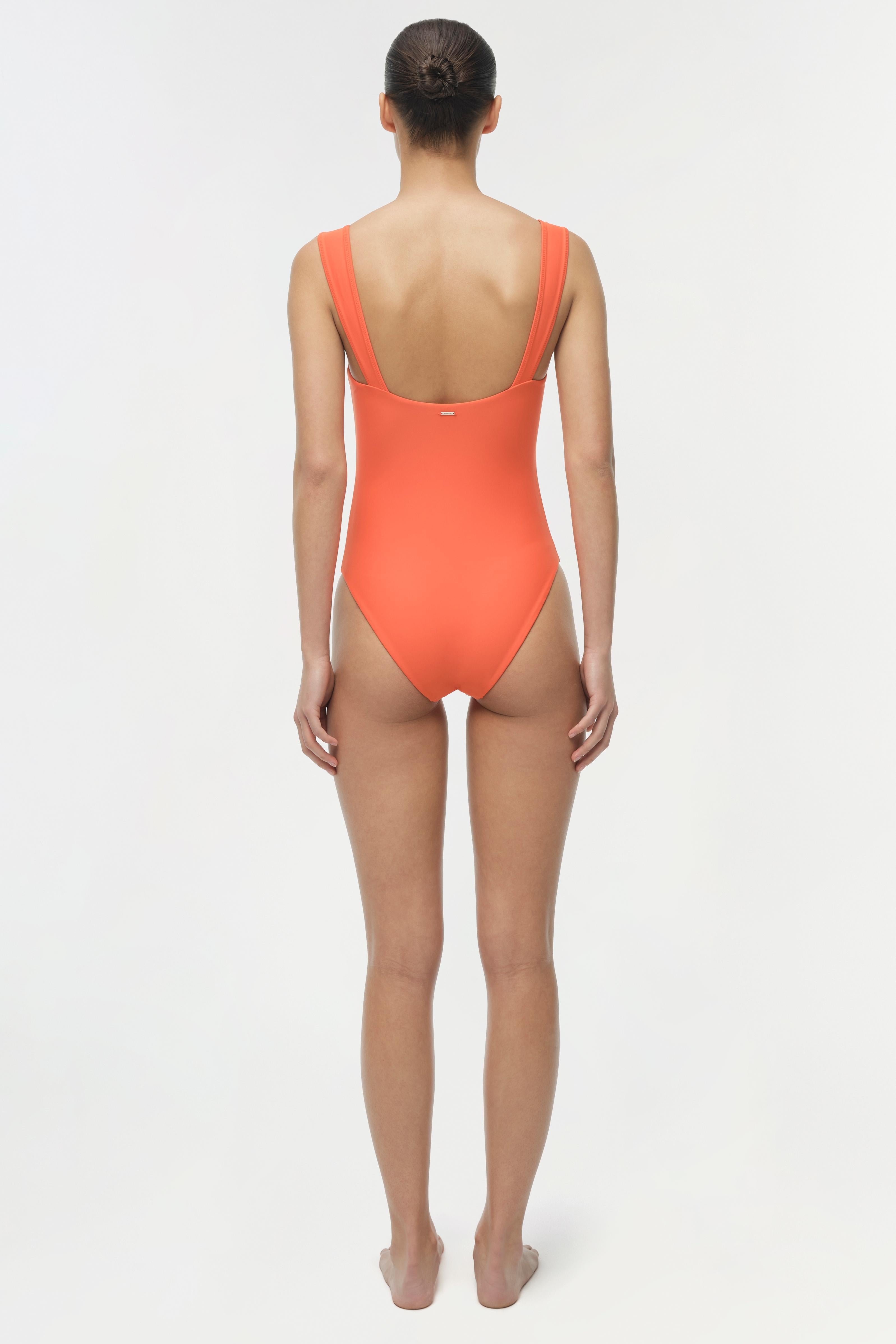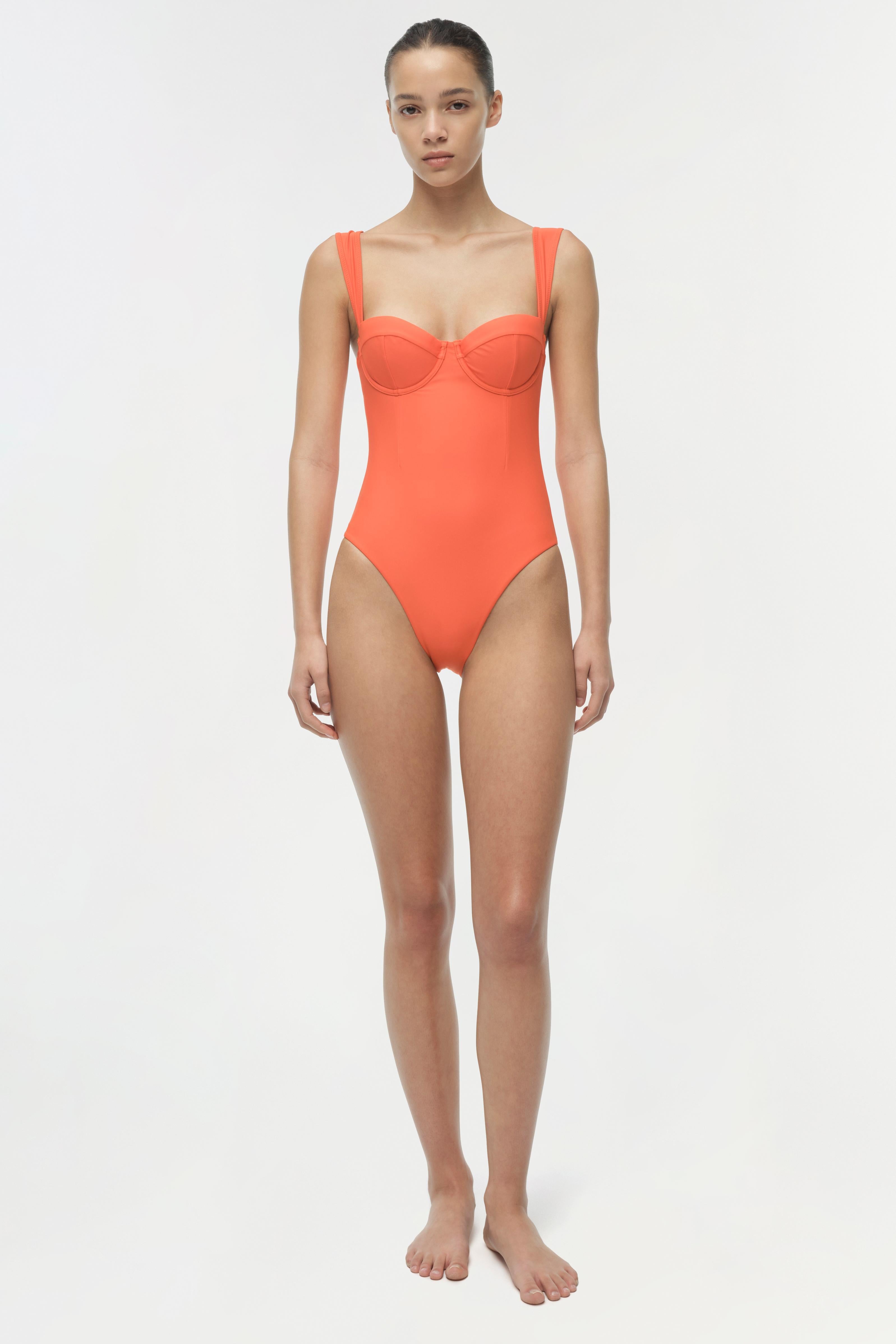 The Kyle Bustier One Piece in Lobster. Crafted from a soft stretch fabric, this one-piece features balconette cups and flared straps that frame the neckline with sculpted support. A seamed bodice adds structure, creating a flattering, streamlined silhouette.