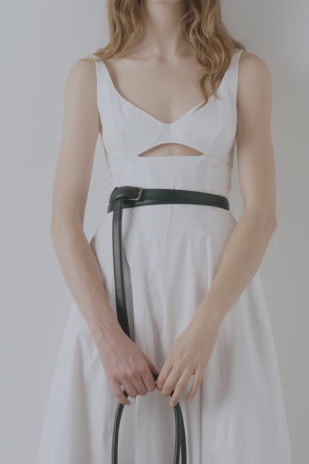The Maddy Cotton Midi Dress in White. This midi dress is cut from cotton poplin and designed with a structured bodice, a refined cutout and a softly pleated skirt.