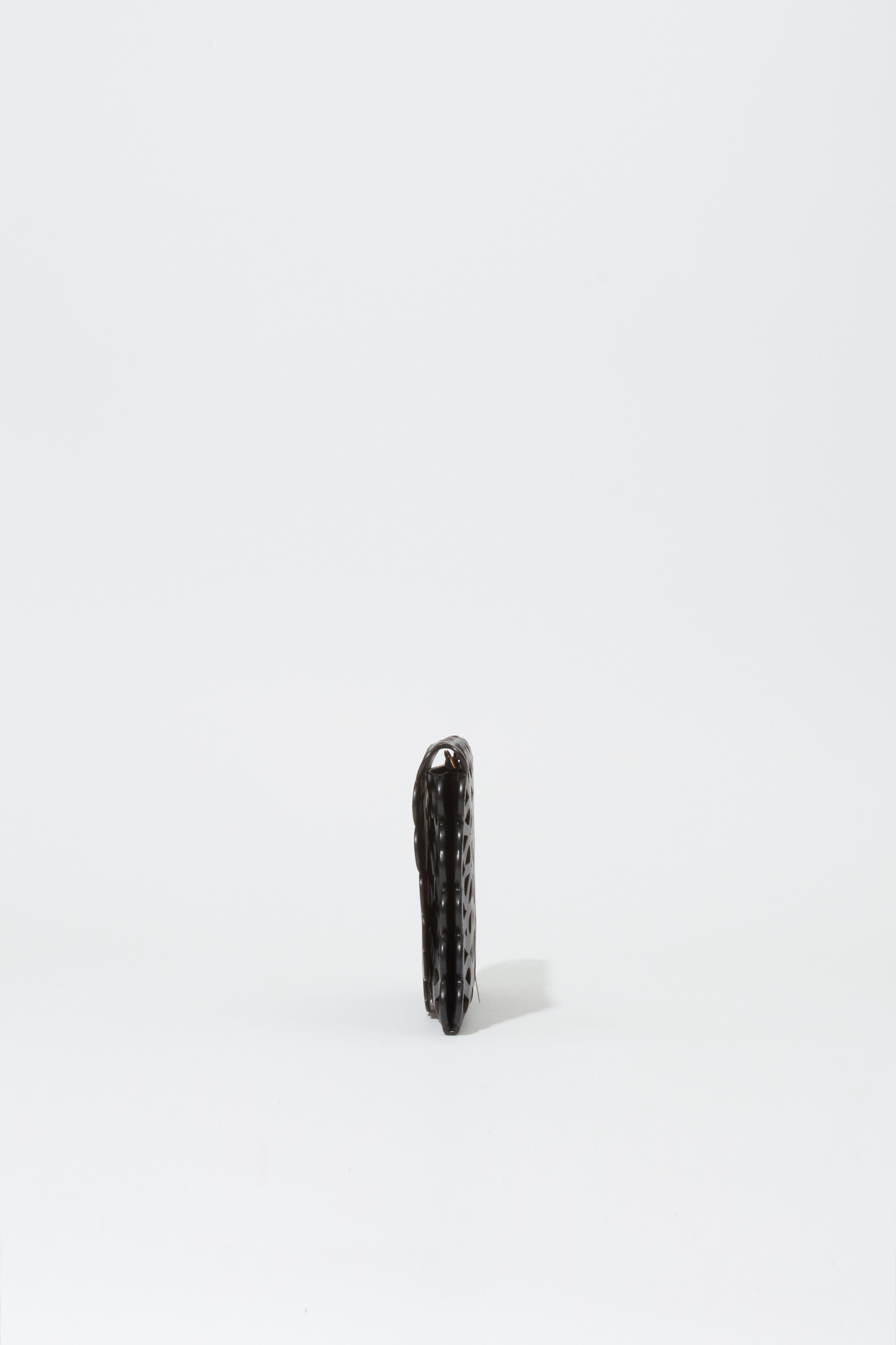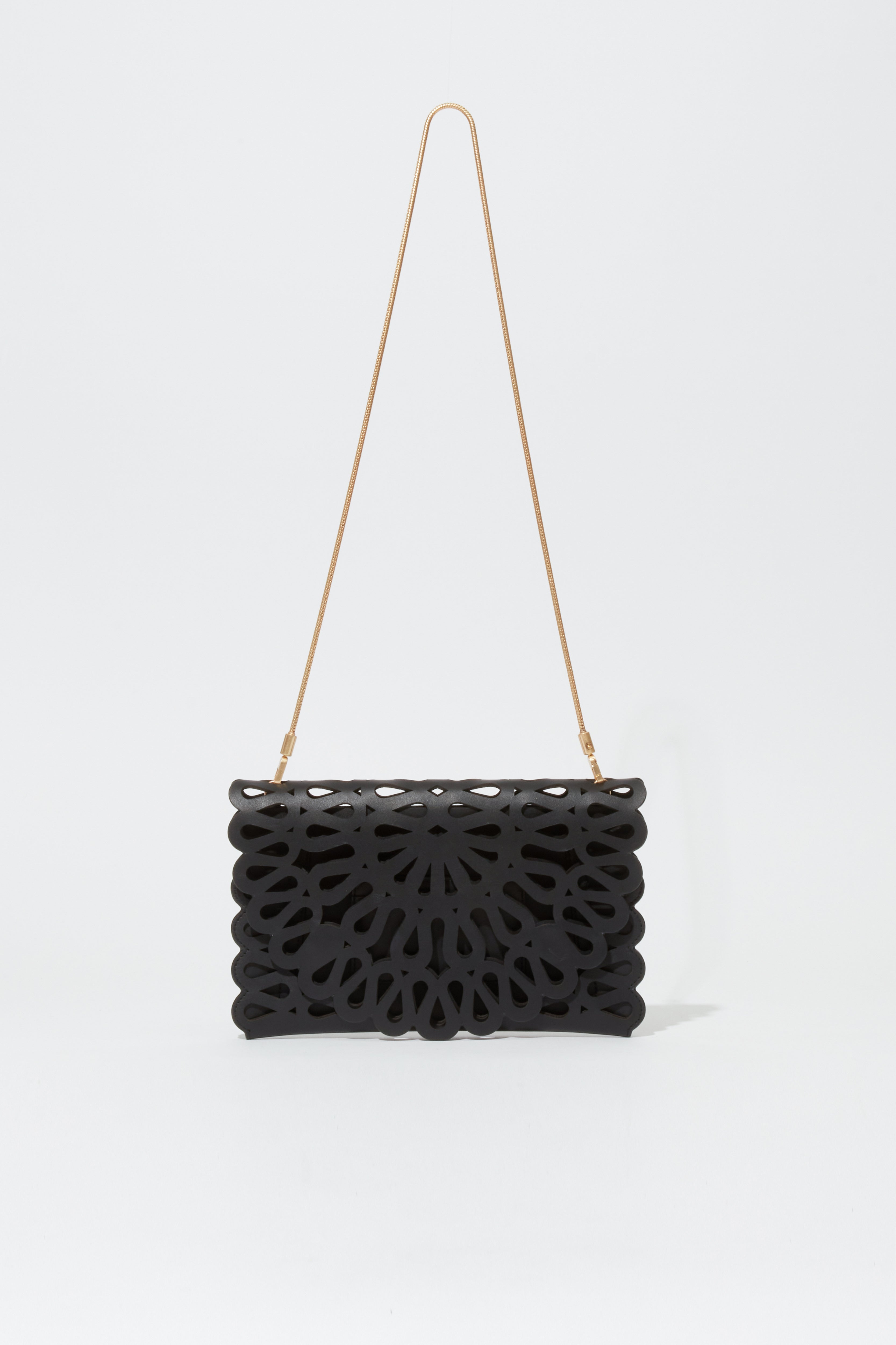 Crafted in smooth leather, this clutch features an intricate laser-cut overlay that forms a sculptural pattern. Designed with a slender profile and detachable chain strap for versatile wear. A refined statement that balances craftsmanship and modern design.