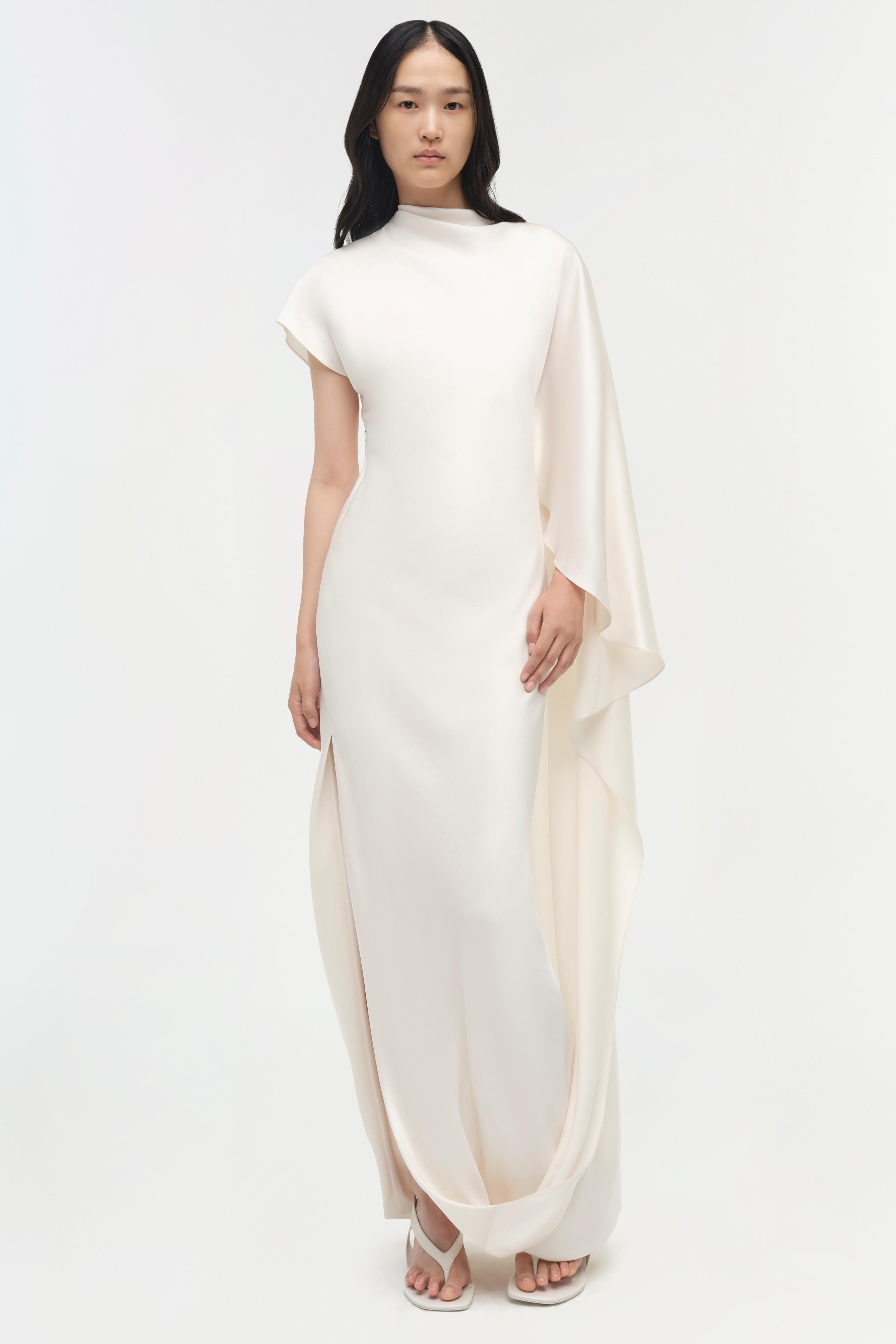 The Ora Satin Gown in Ivory. This woven satin gown features an asymmetrical long sleeve, with cascading folds that form a striking, cape-like silhouette from shoulder to hem. This dress combines movement with statuesque presence.
