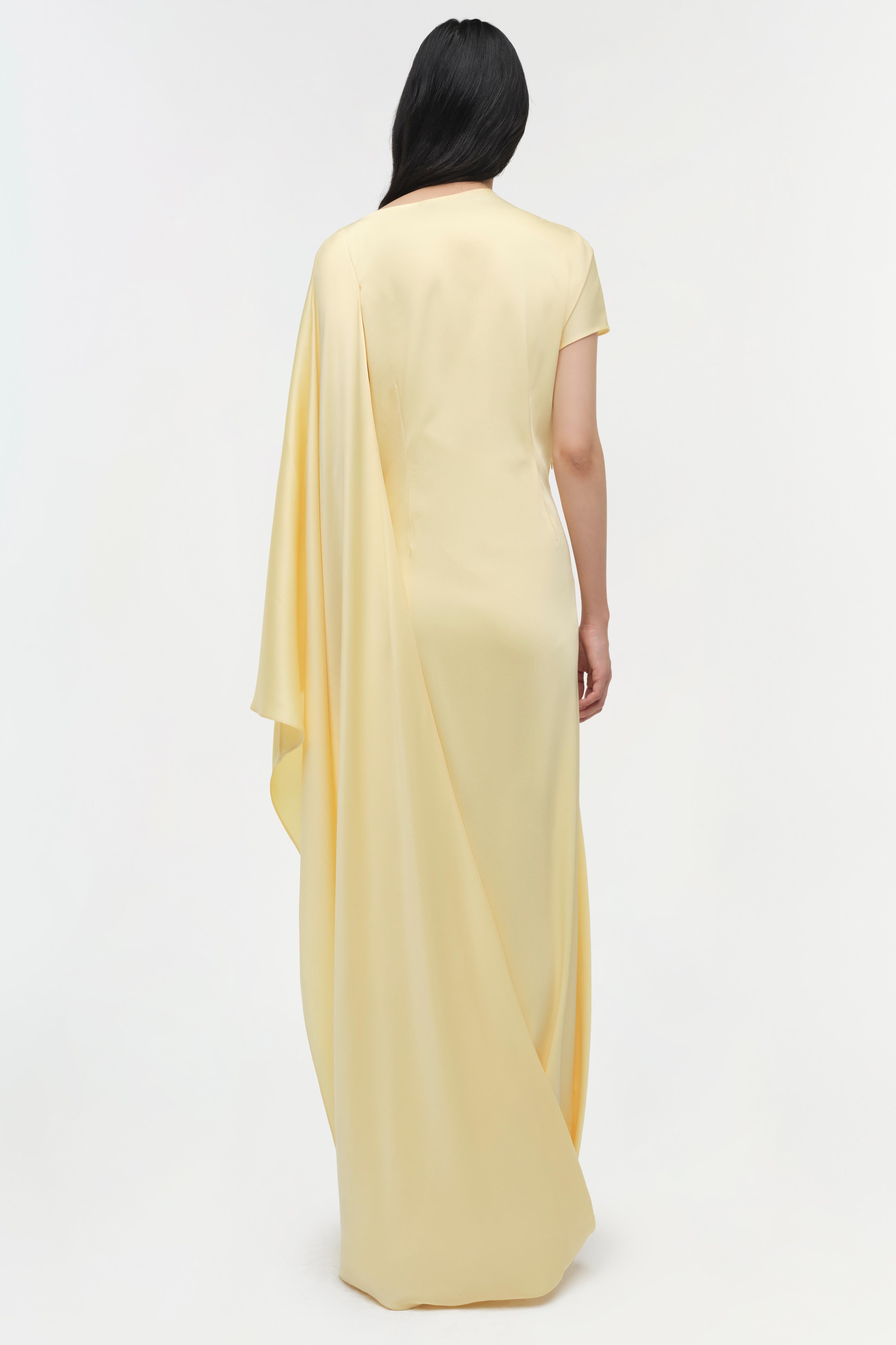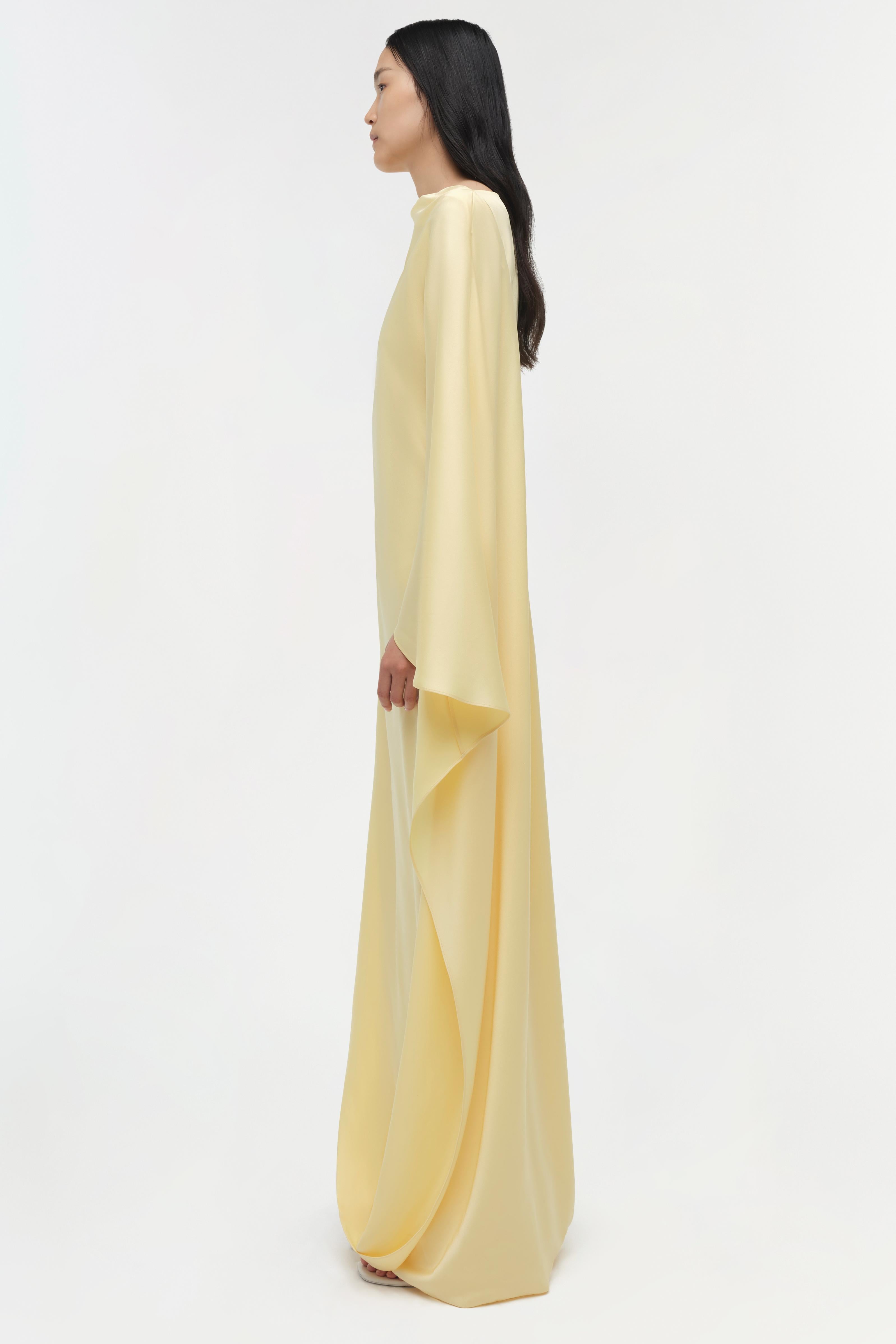 The Ora Satin Gown in Buttercream. This woven satin gown features an asymmetrical long sleeve, with cascading folds that form a striking, cape-like silhouette from shoulder to hem. This dress combines movement with statuesque presence.