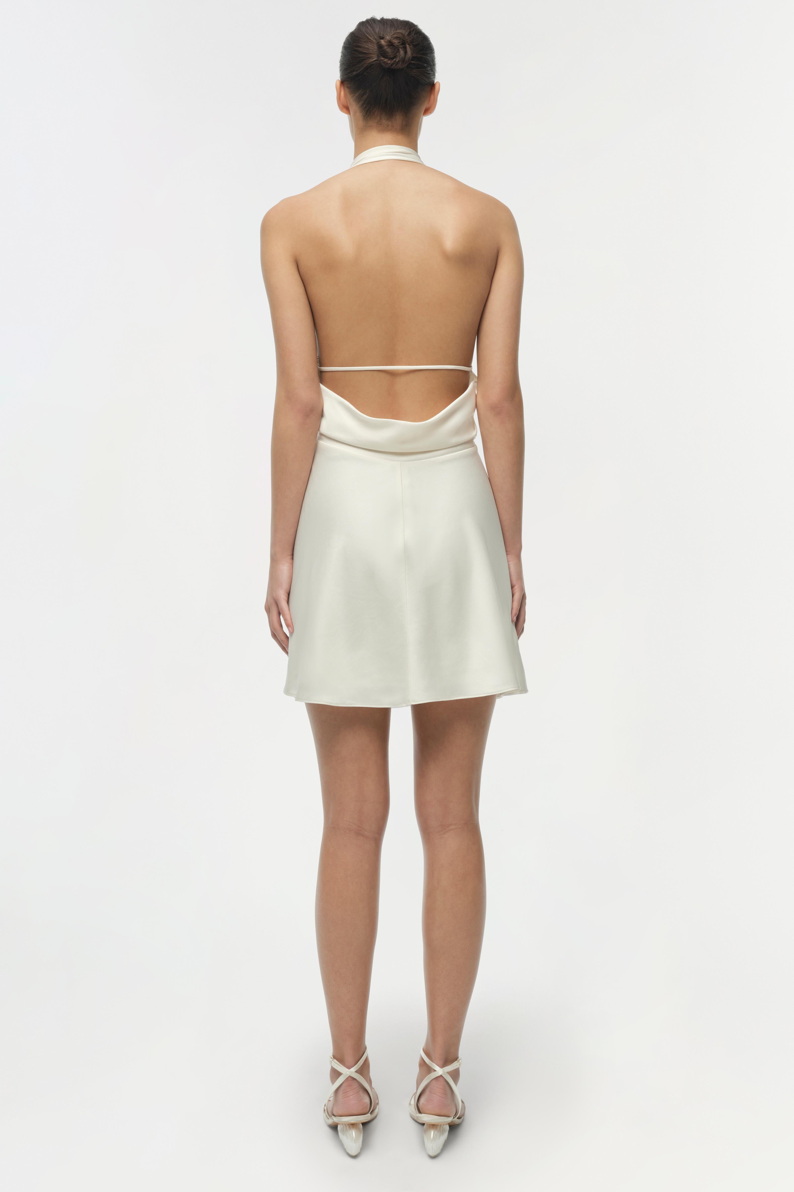 The Reanna Satin Mini Dress in Ivory. This mini dress is cut in a classic woven satin and features a softly draped neckline. A gathered waist shapes the silhouette, while the short hemline brings sharp contrast to the ease of the drape. Finished with clean lines, it balances structure and movement in a modern cut.