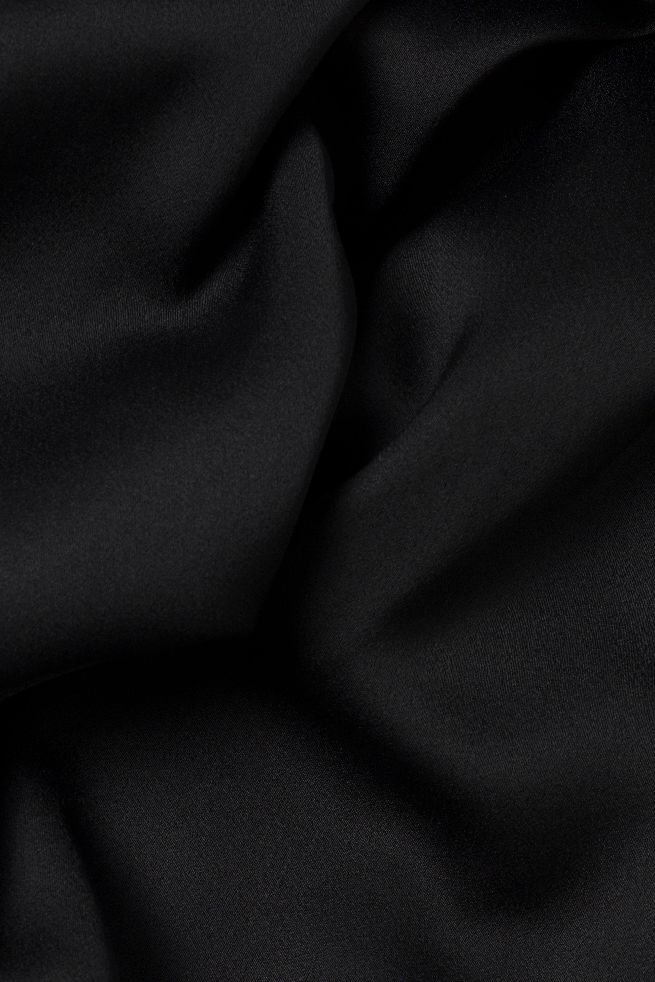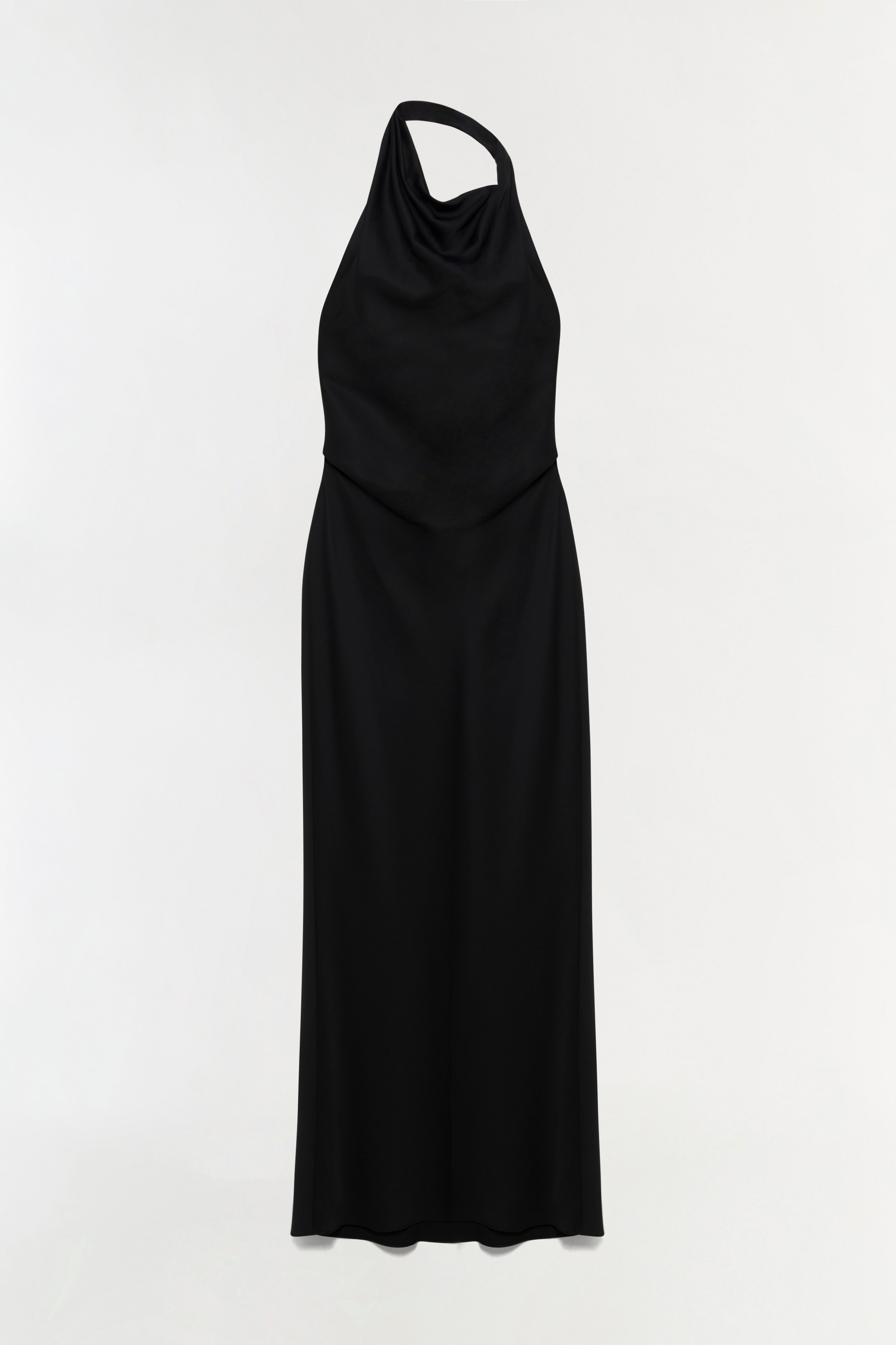 The Reannon Draped Satin Gown in Black. Cut from fluid satin, this halter gown features a softly draped neckline and an open back with a slim strap detail. The bias-cut skirt falls into a straight, floor-length silhouette. Finished with a clean edge for a smooth, minimal finish.