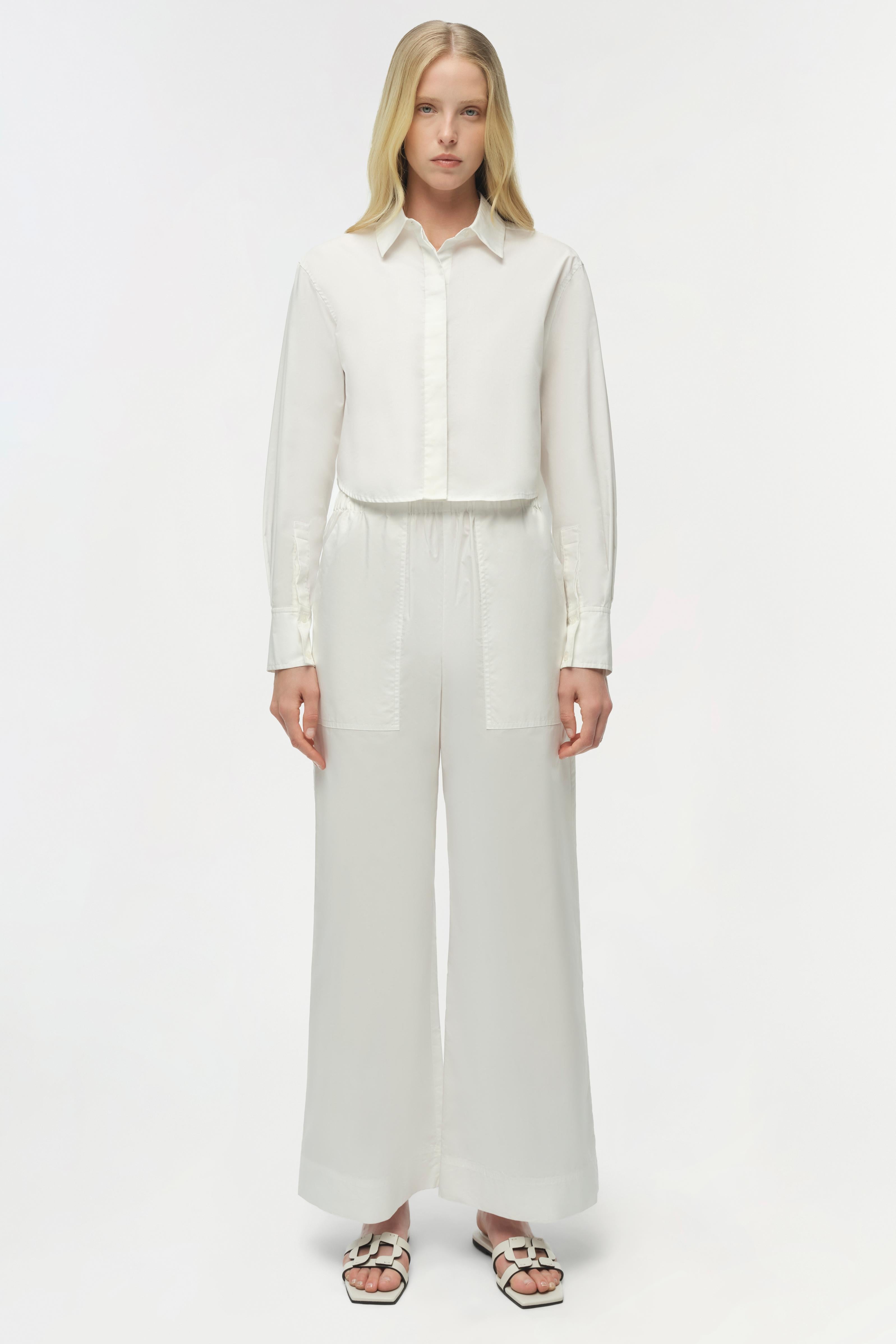 The Renata Shirt in White. Elevate your wardrobe with this crisp cropped button-down. Designed with a sharp collar and a clean front, its tailored fit provides a sophisticated silhouette. Perfectly versatile, it's a modern staple for both casual and dressier ensembles.