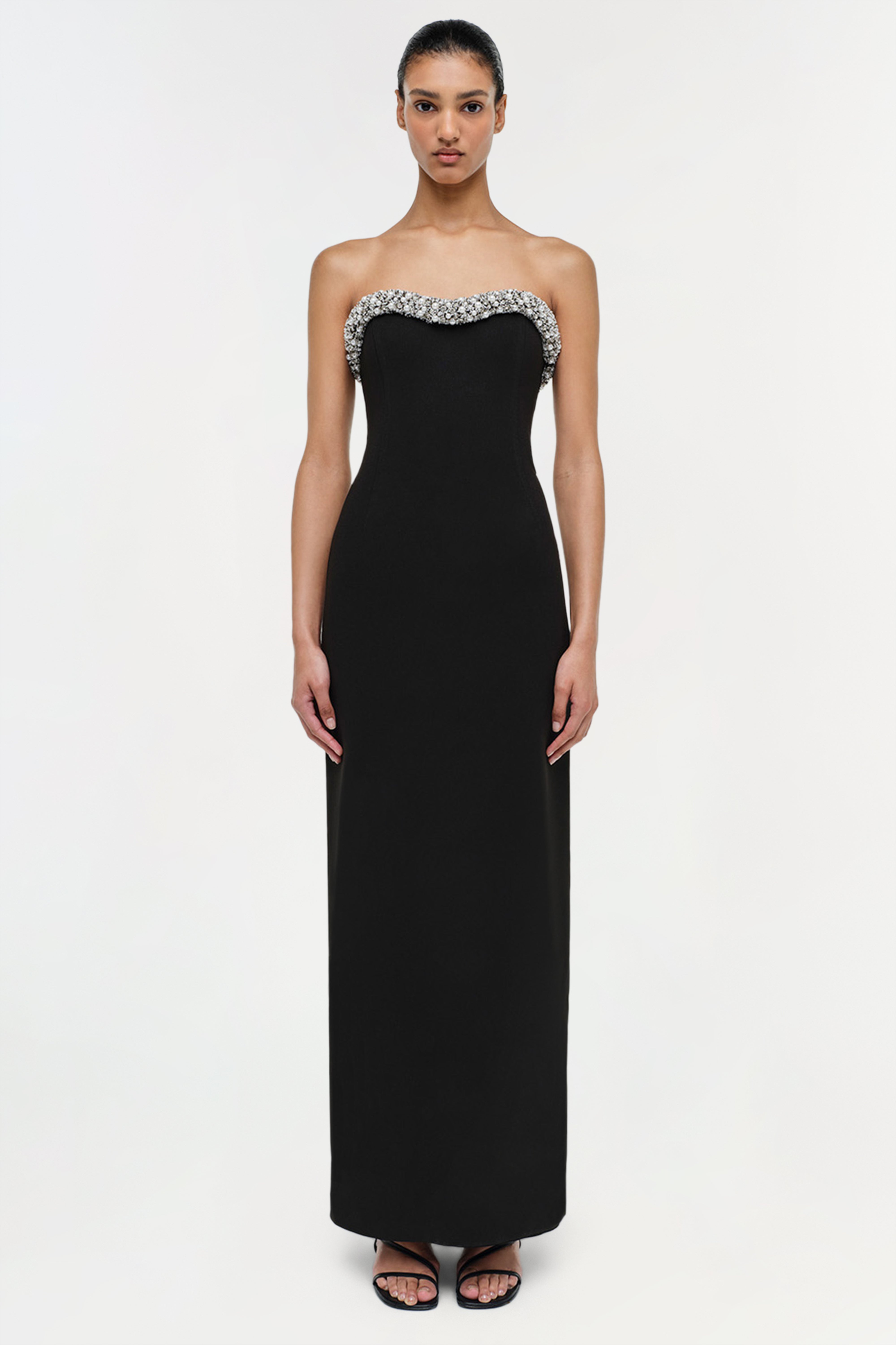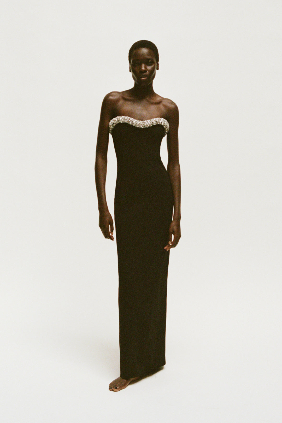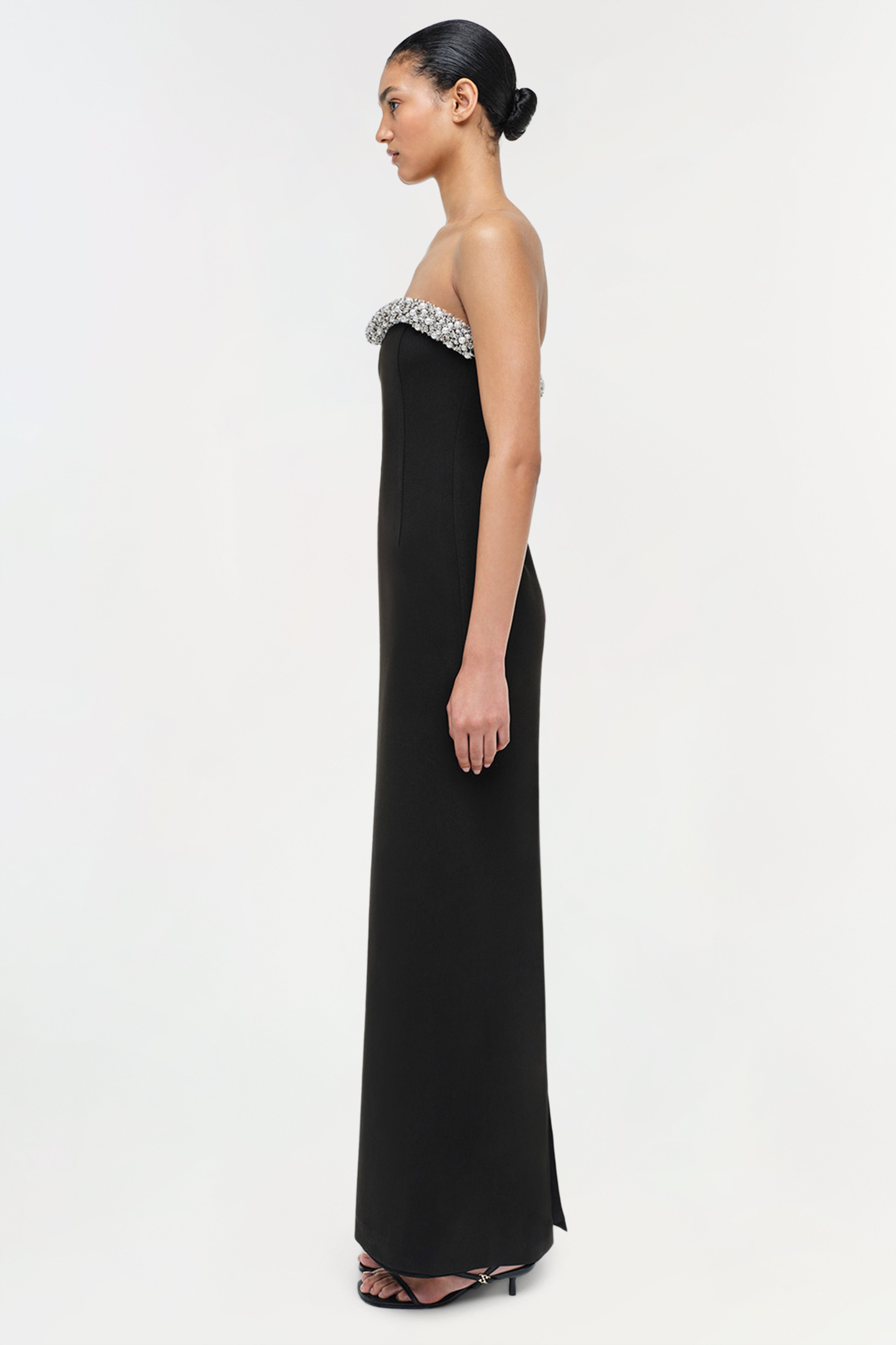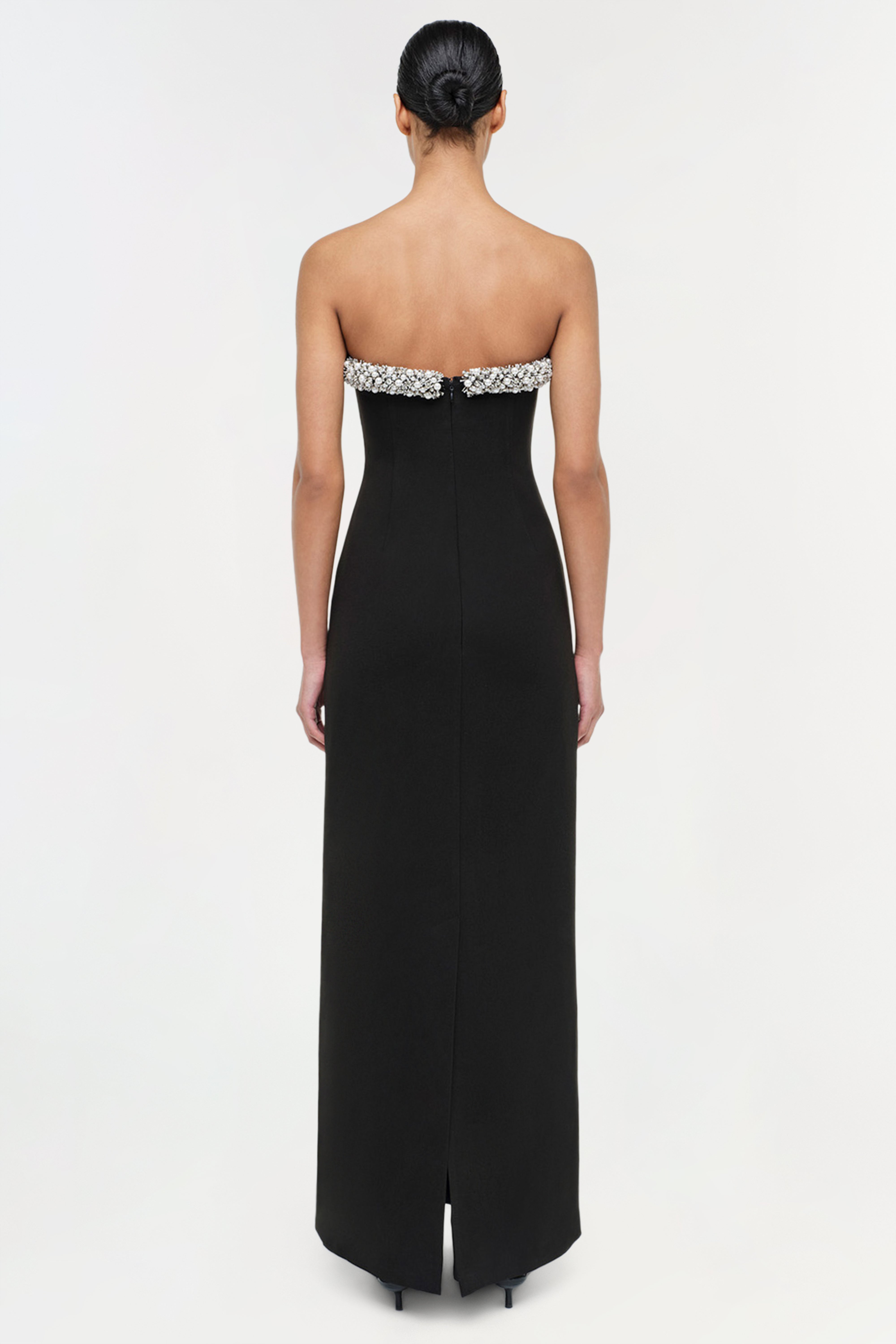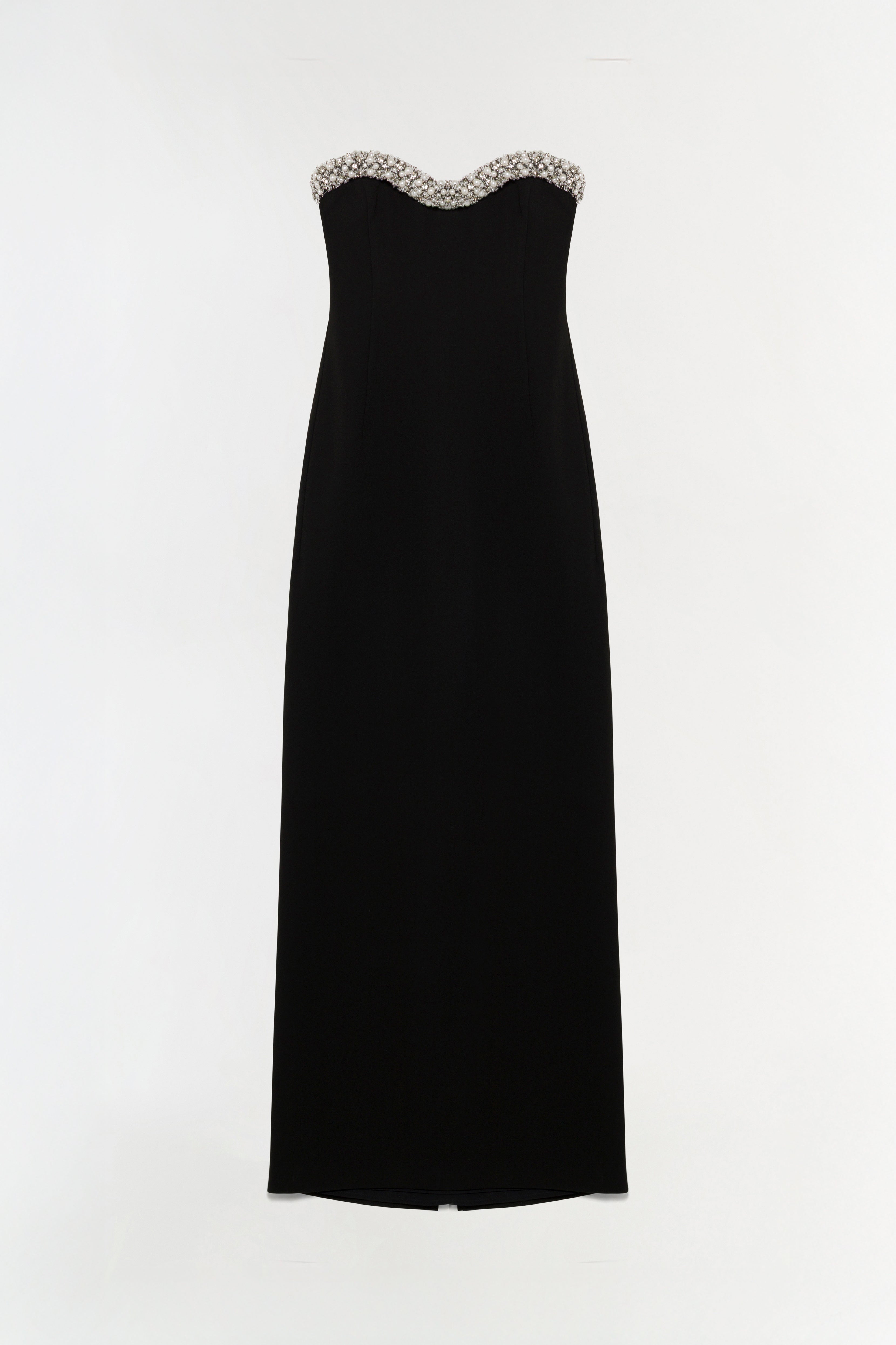 A sleek crepe column gown, this design is elevated by a bustier bodice crowned with sparkling embellishment along the neckline. The strapless cut and elongating lines create a commanding presence, while the intricate detailing adds glamour. Designed to captivate, it merges refinement with decorative craft.