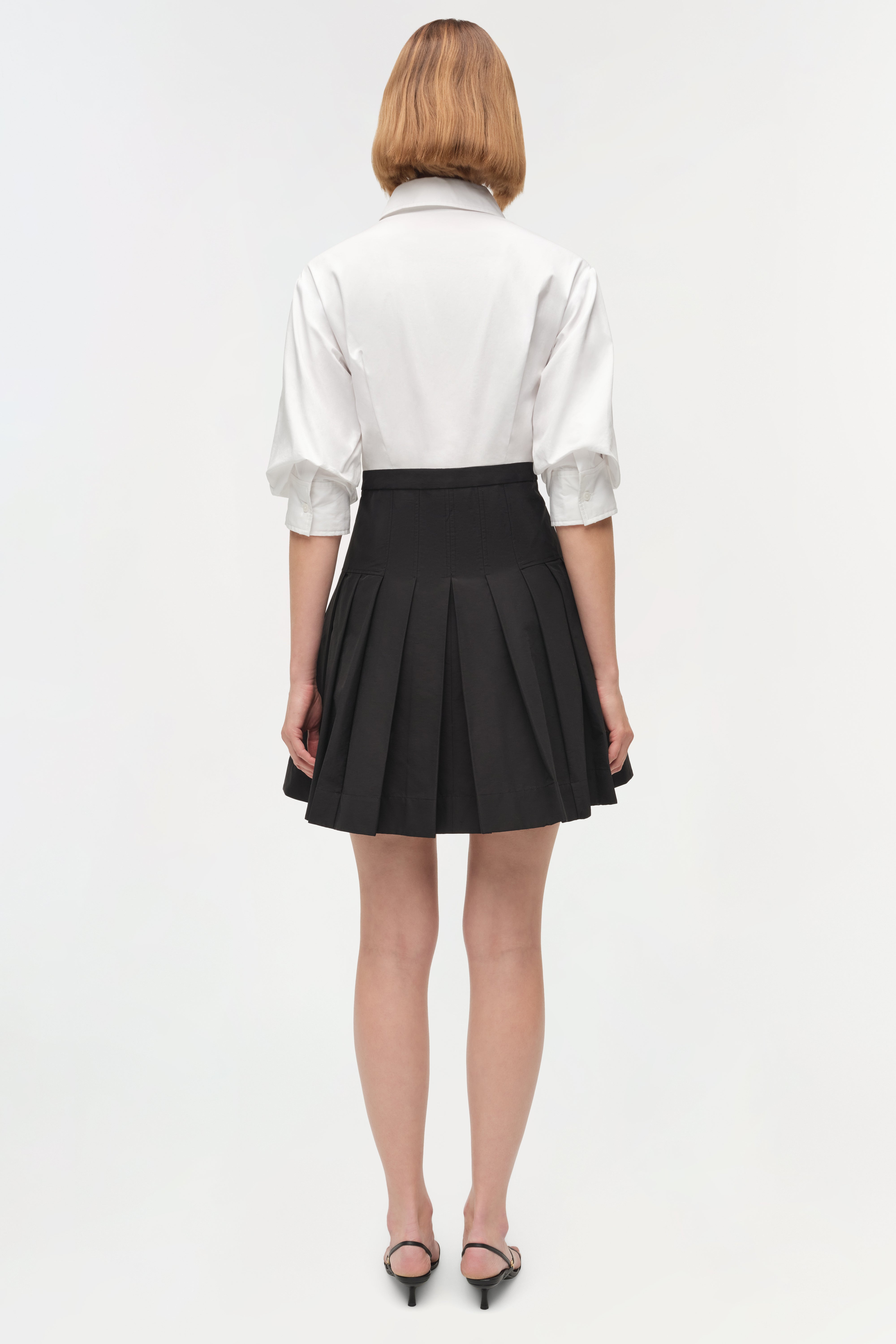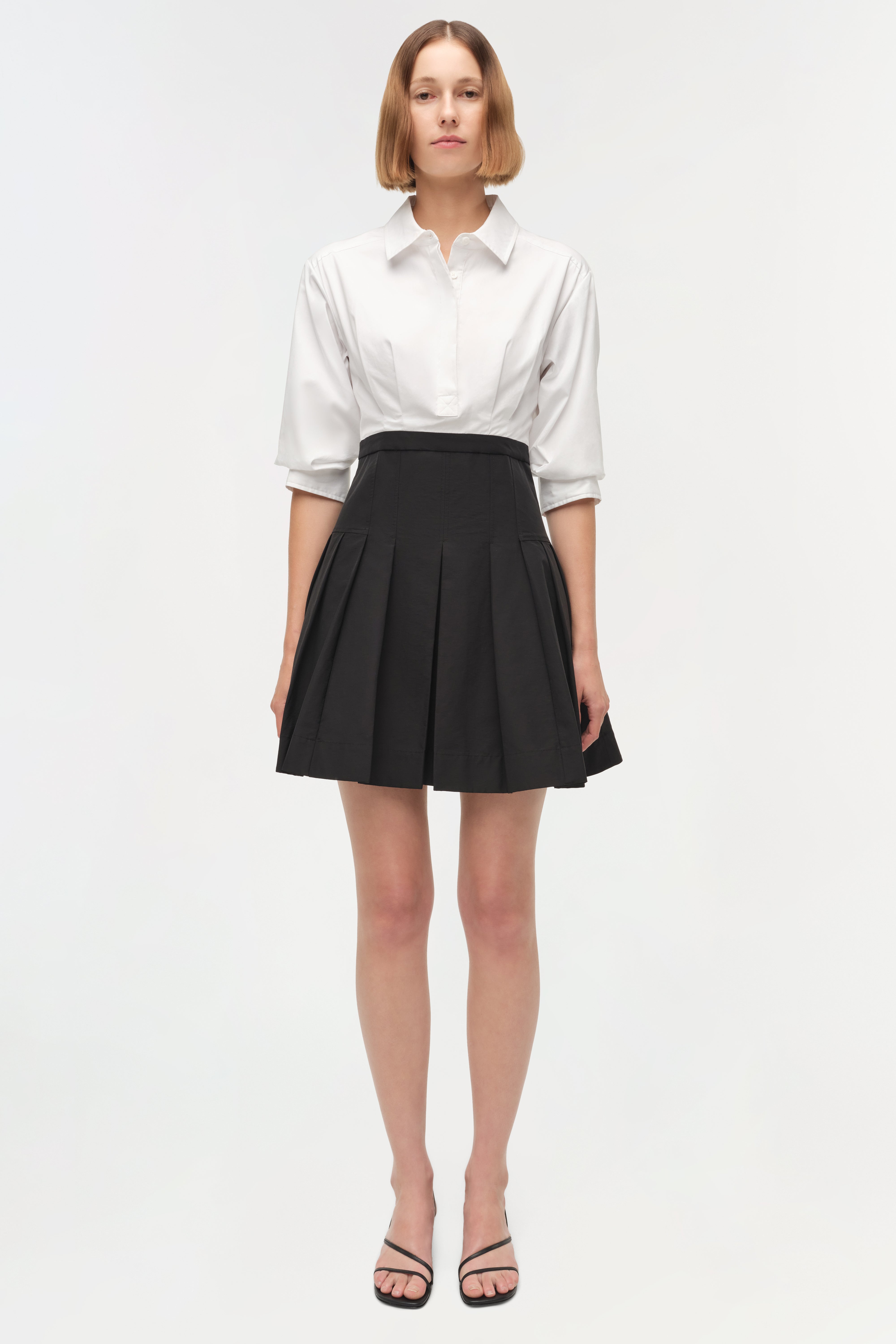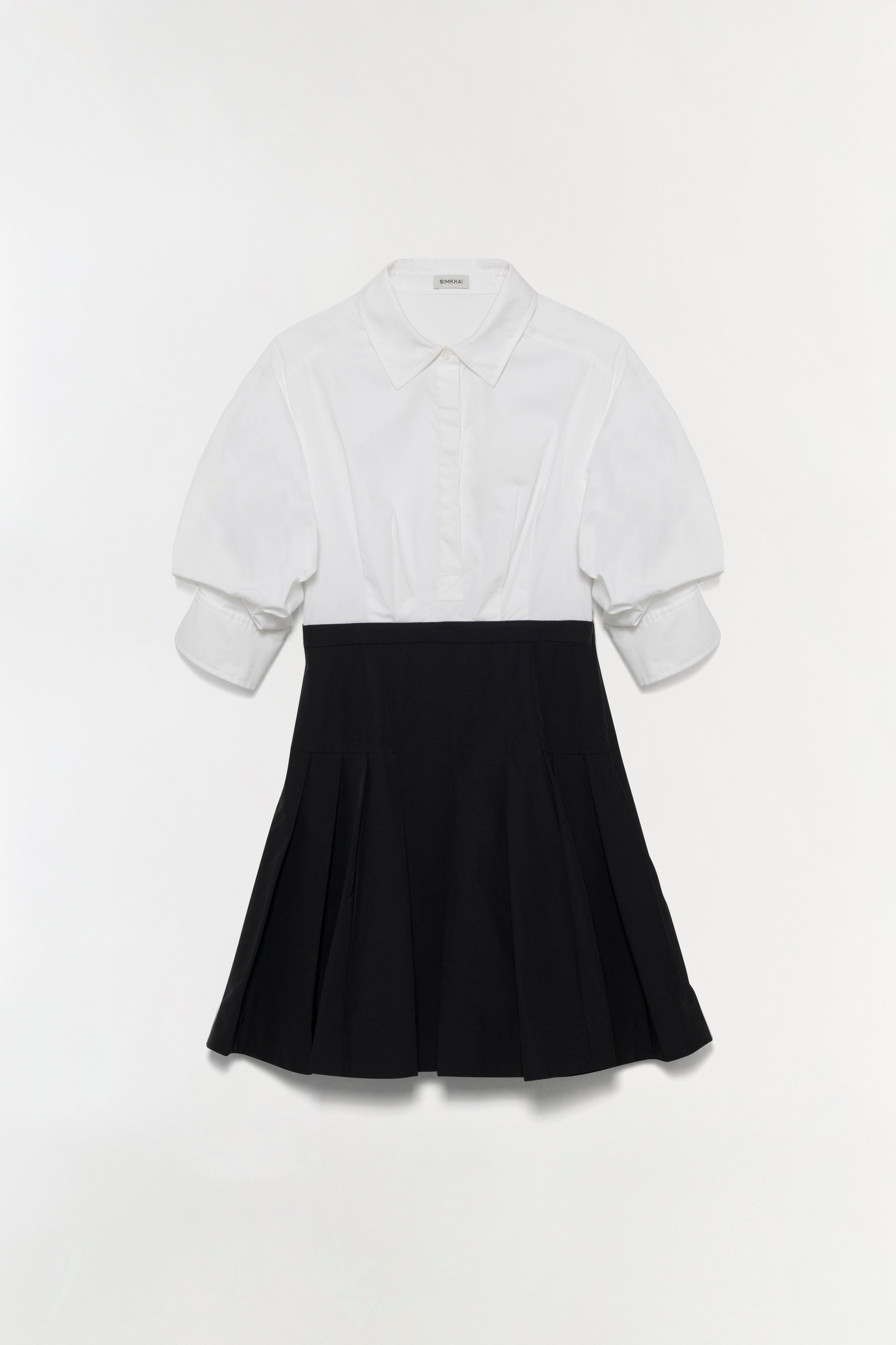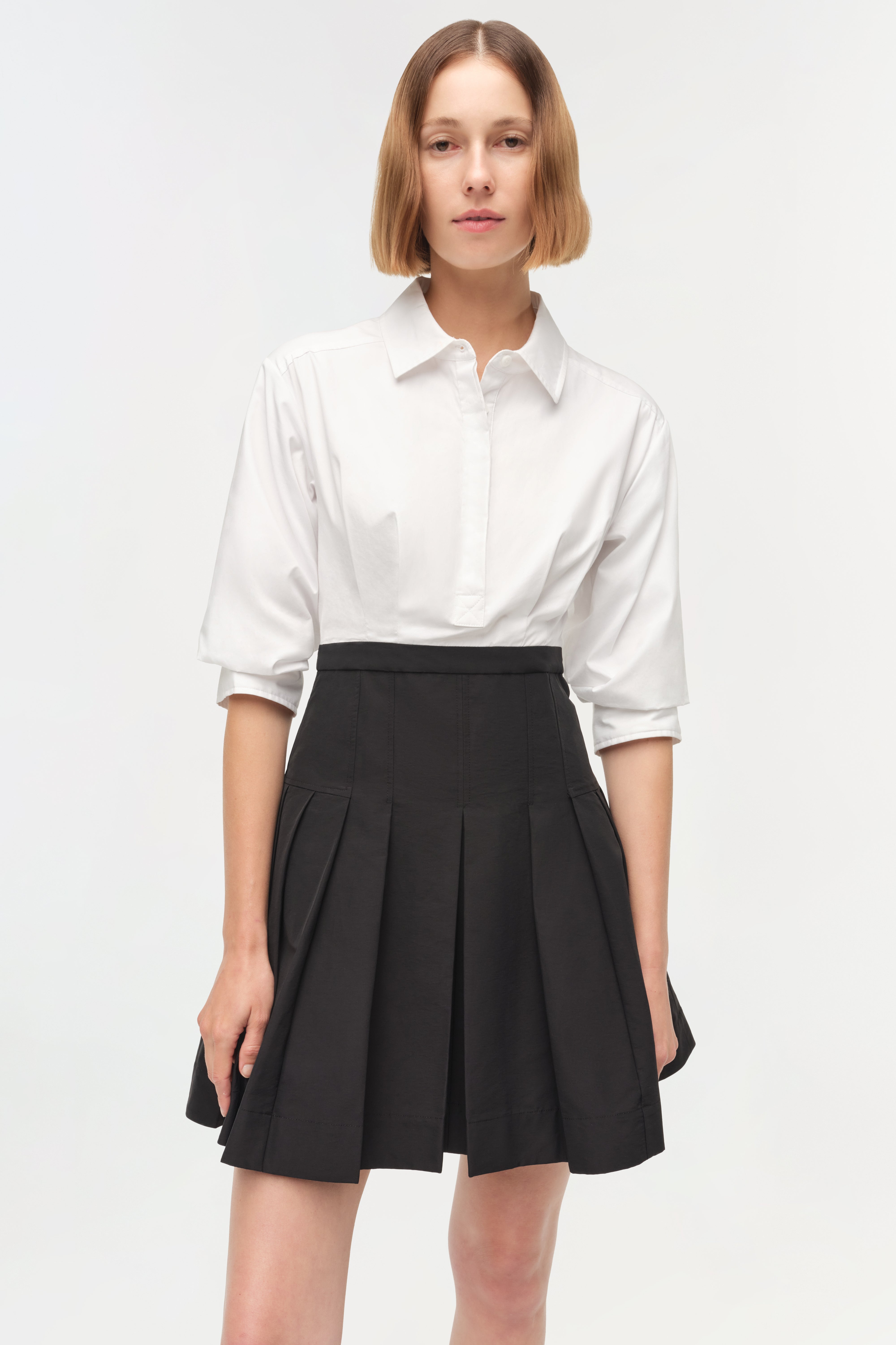 Made from lightweight cotton, this dress pairs a crisp, collared bodice with a sculpted waist and flared pleats. The clean lines and compact structure create an elevated, versatile shape