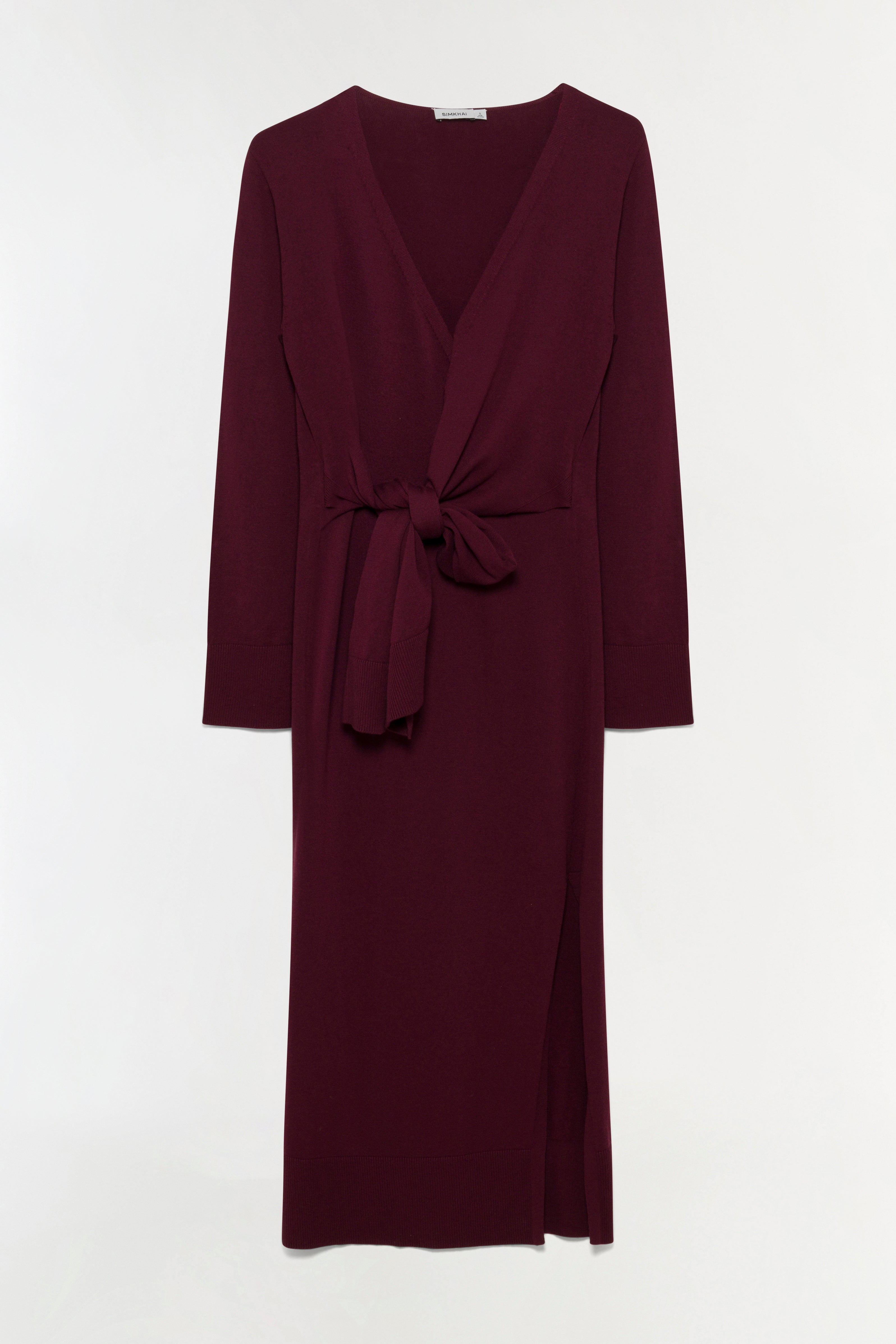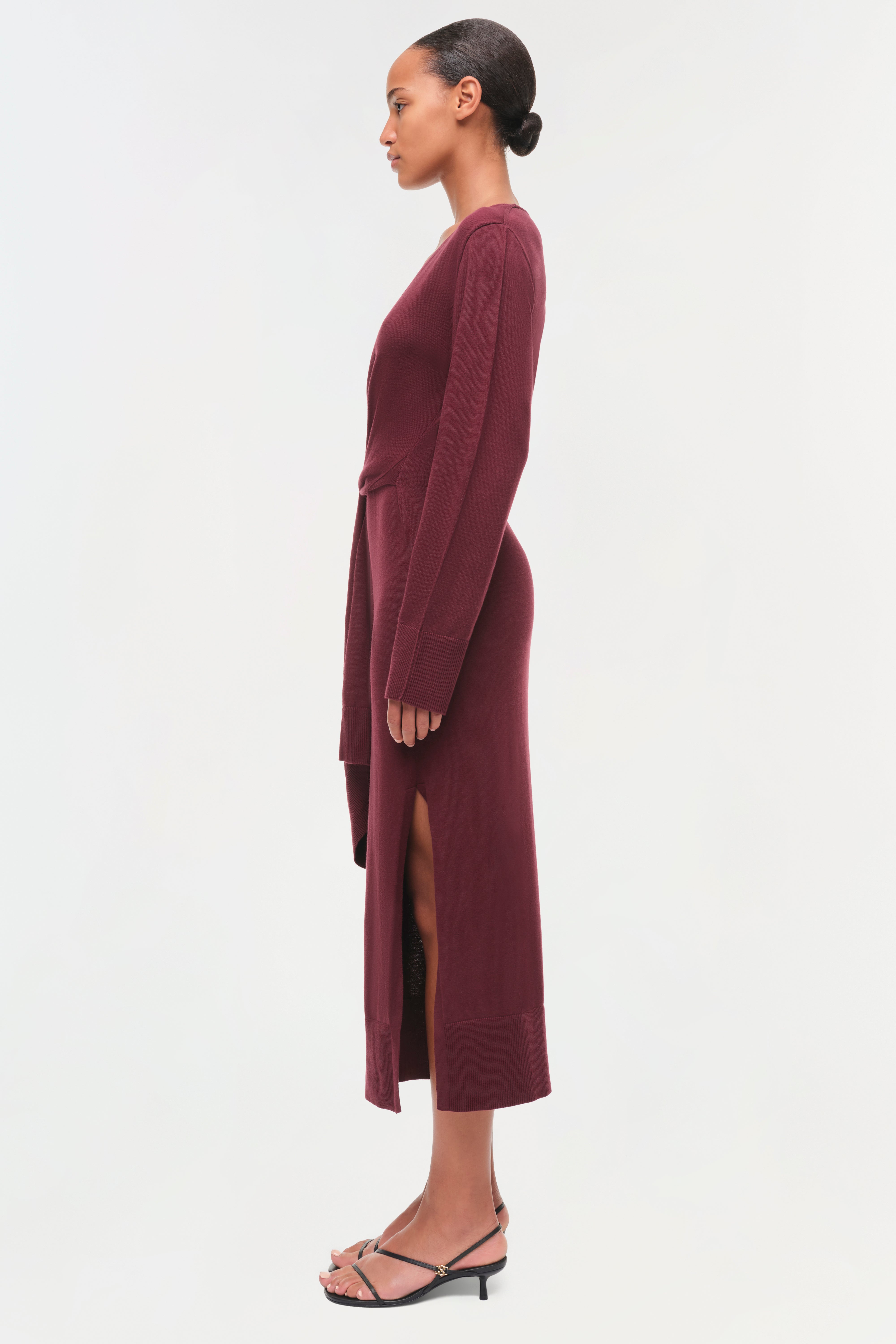 This wrap dress is knit from a cotton-cashmere blend that lends a soft, fluid drape. The design ties at the waist, shaping the silhouette with ease. Long sleeves and ribbed finishes ground the piece in thoughtful, hand-worked detail.