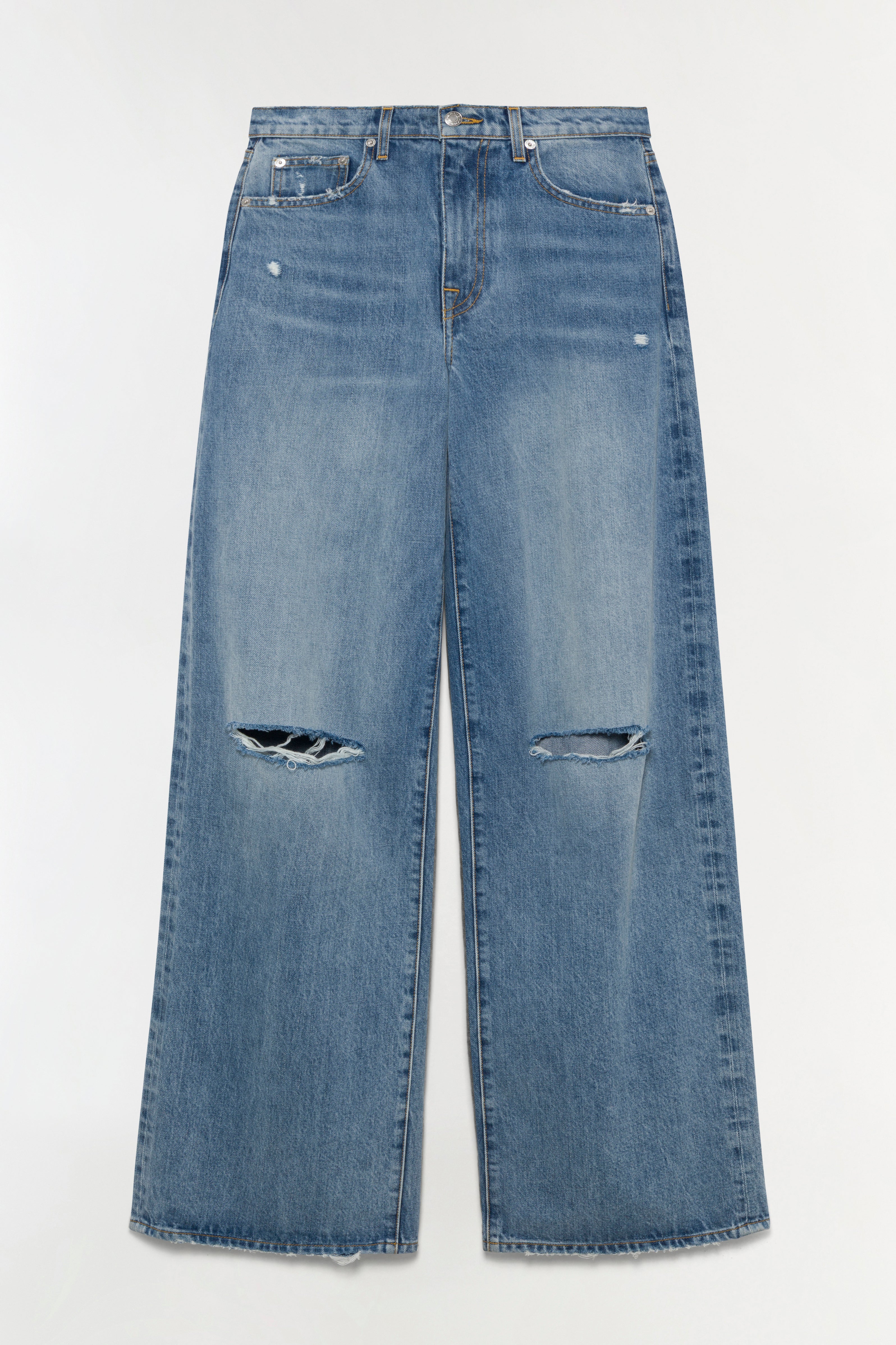 Cut from premium denim, these pants are defined by a high-rise fit and wide, architectural leg. Distressed knees introduce a note of texture within the streamlined silhouette. Timeless denim, elevated with modern structure.