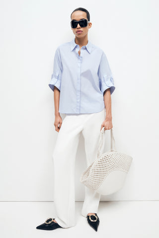 A denim mini skirt that embraces negative space with a light blue lining that intentionally peeks through an intricately embroidered denim floral overlay. Button closure.